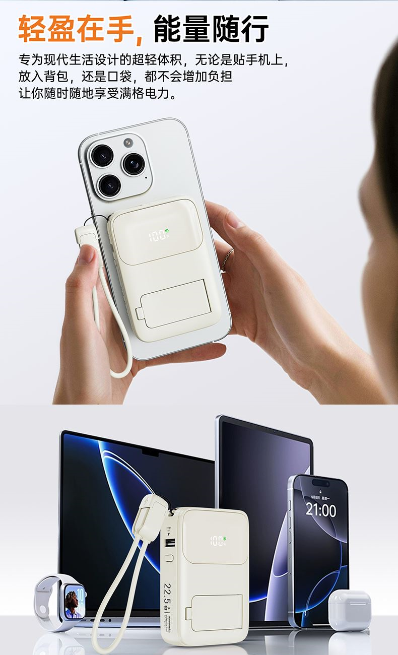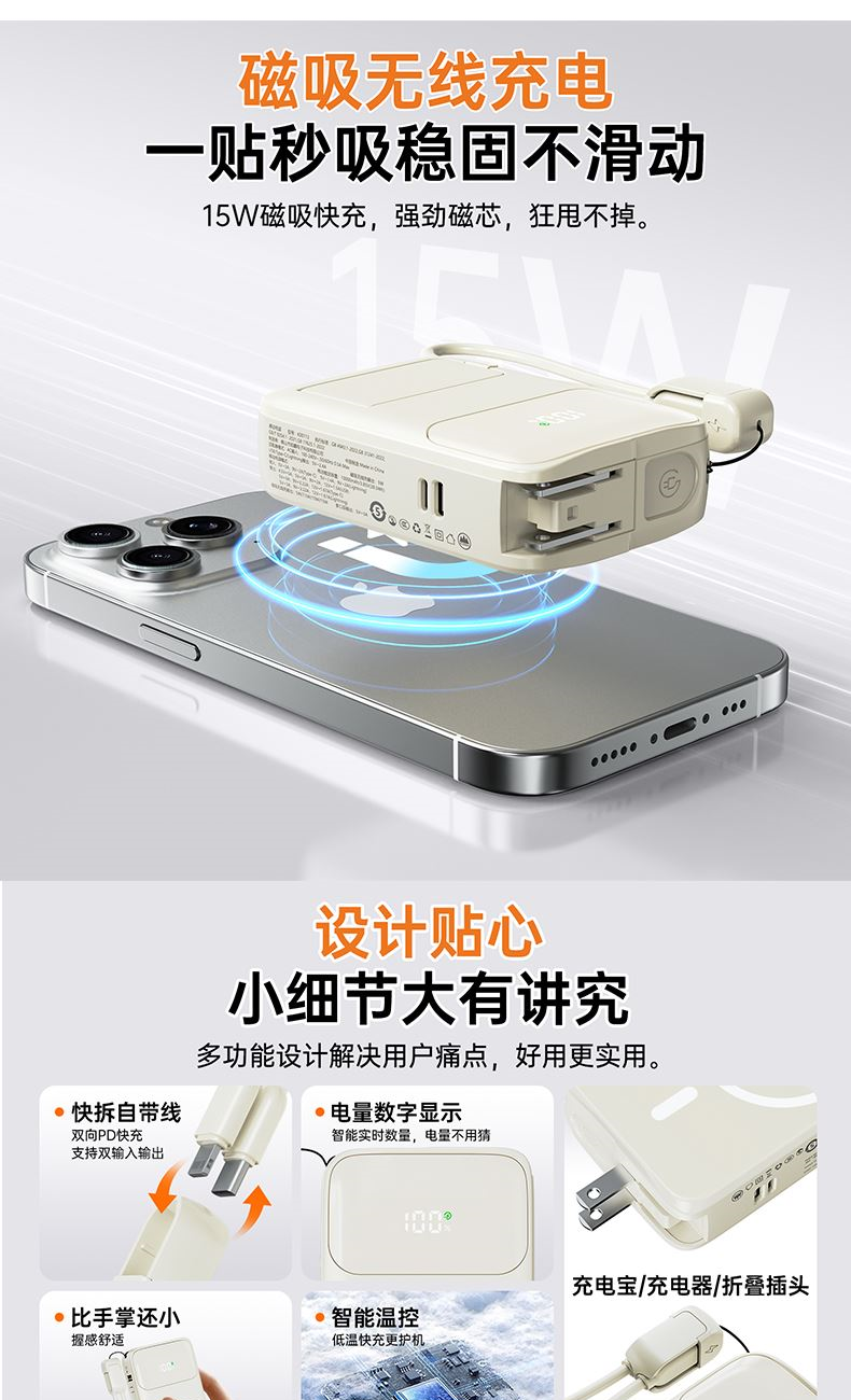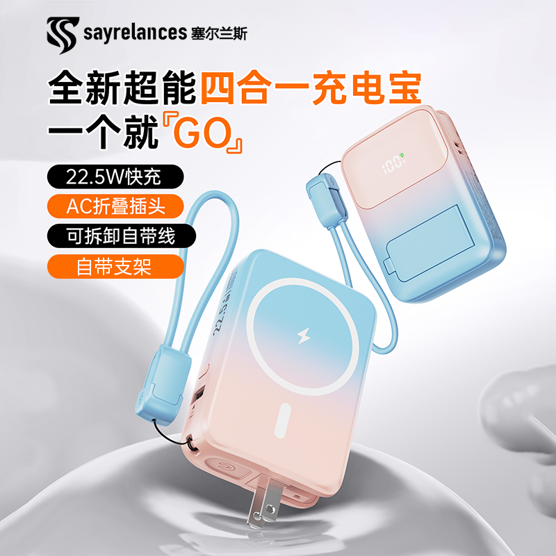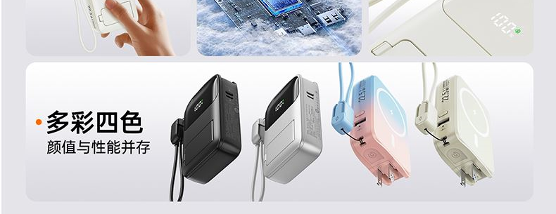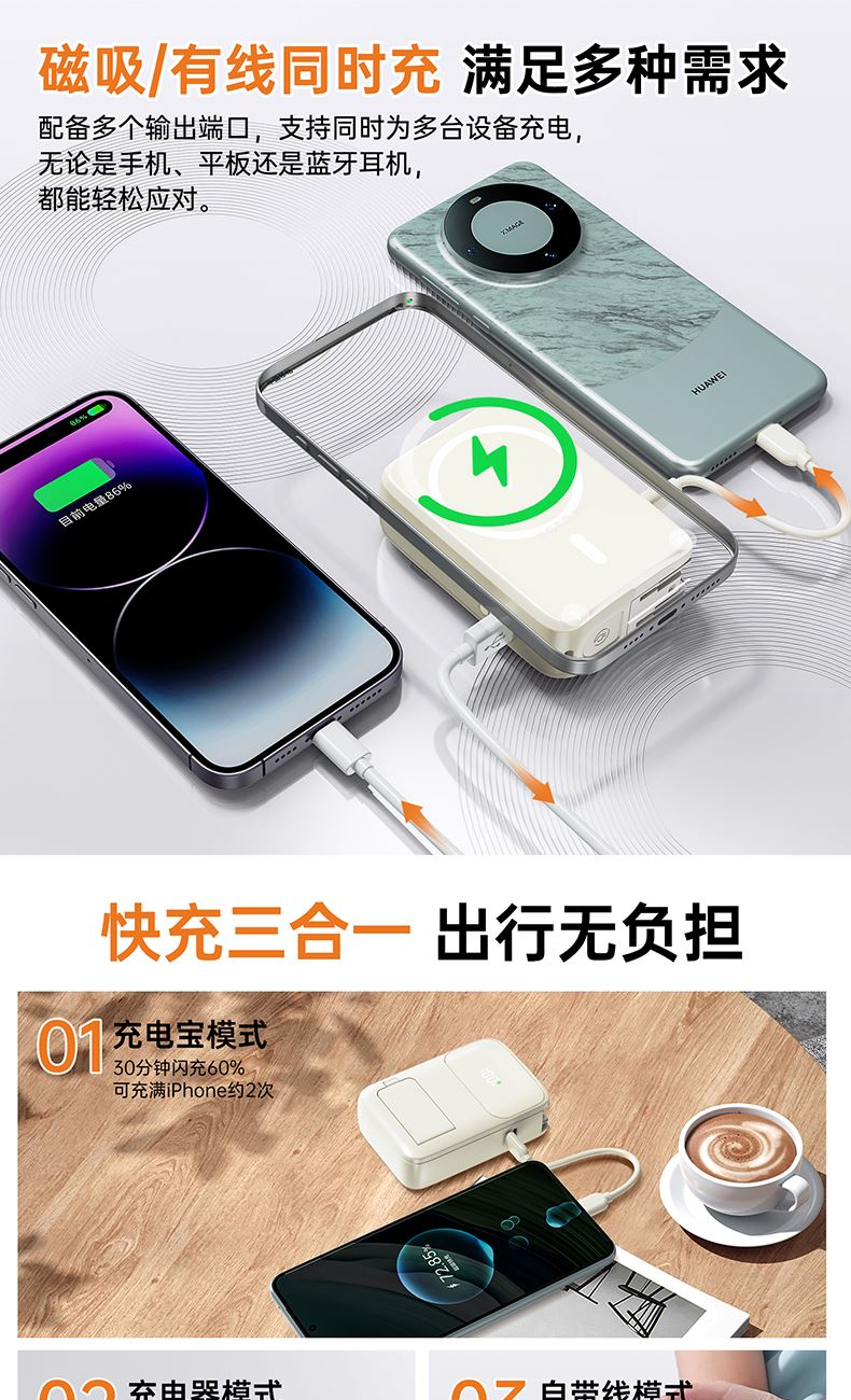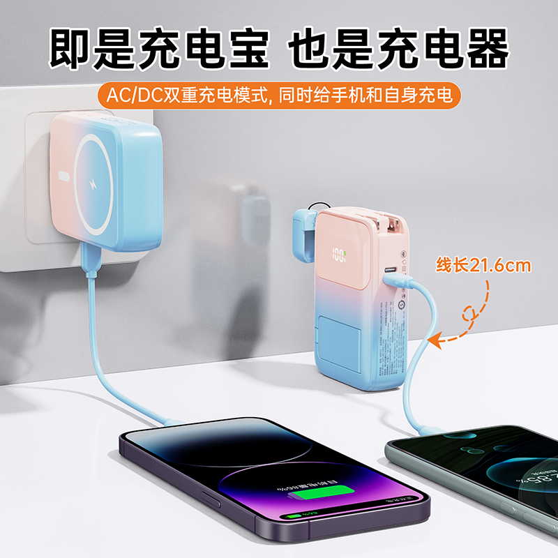 1.四合一充电宝自带插头、自带线、磁吸充电、自带支架; 2.自带双线安卓苹果随意充; 3.即是充电宝 也是充电器、AC/DC双重充电模式,同时给手机和自身充电; 4.充电宝自带升级隐形支架,随用随取出门在外不再担心手机无法支撑; 5.磁吸/有线同时充、配备多个输出端口,支持同时为多台设备充电; 6.自带AC插头、出门再也不需要带充电器、充电线