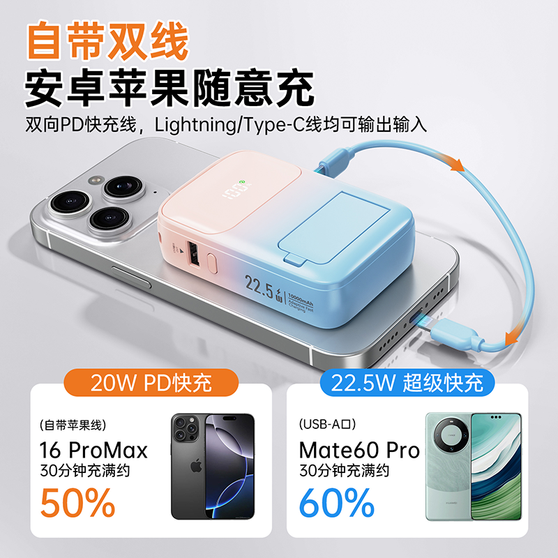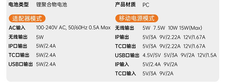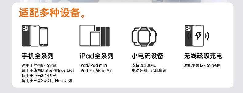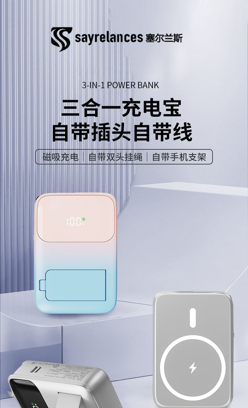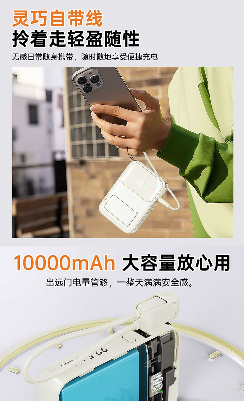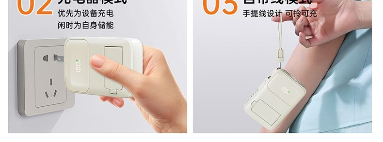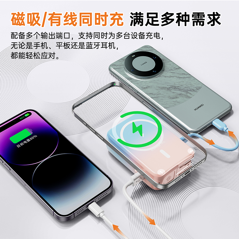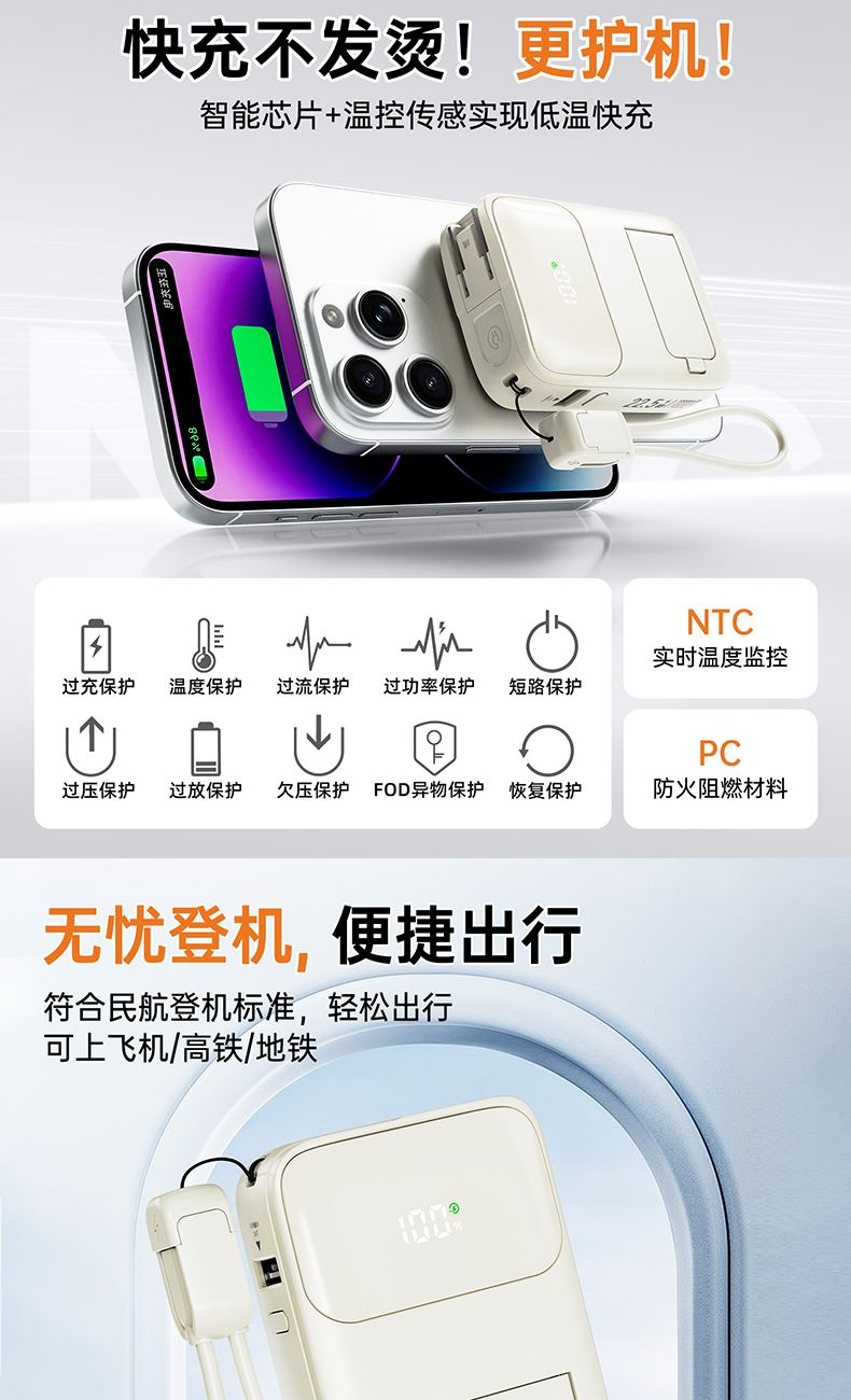 1.四合一充电宝自带插头、自带线、磁吸充电、自带支架; 2.自带双线安卓苹果随意充; 3.即是充电宝 也是充电器、AC/DC双重充电模式,同时给手机和自身充电; 4.充电宝自带升级隐形支架,随用随取出门在外不再担心手机无法支撑; 5.磁吸/有线同时充、配备多个输出端口,支持同时为多台设备充电; 6.自带AC插头、出门再也不需要带充电器、充电线