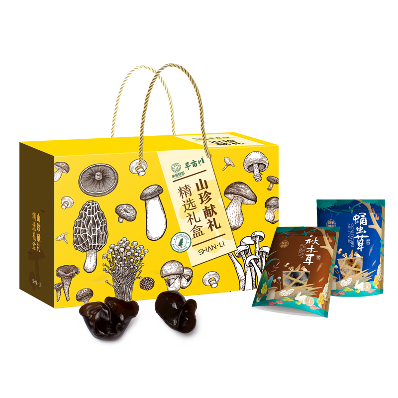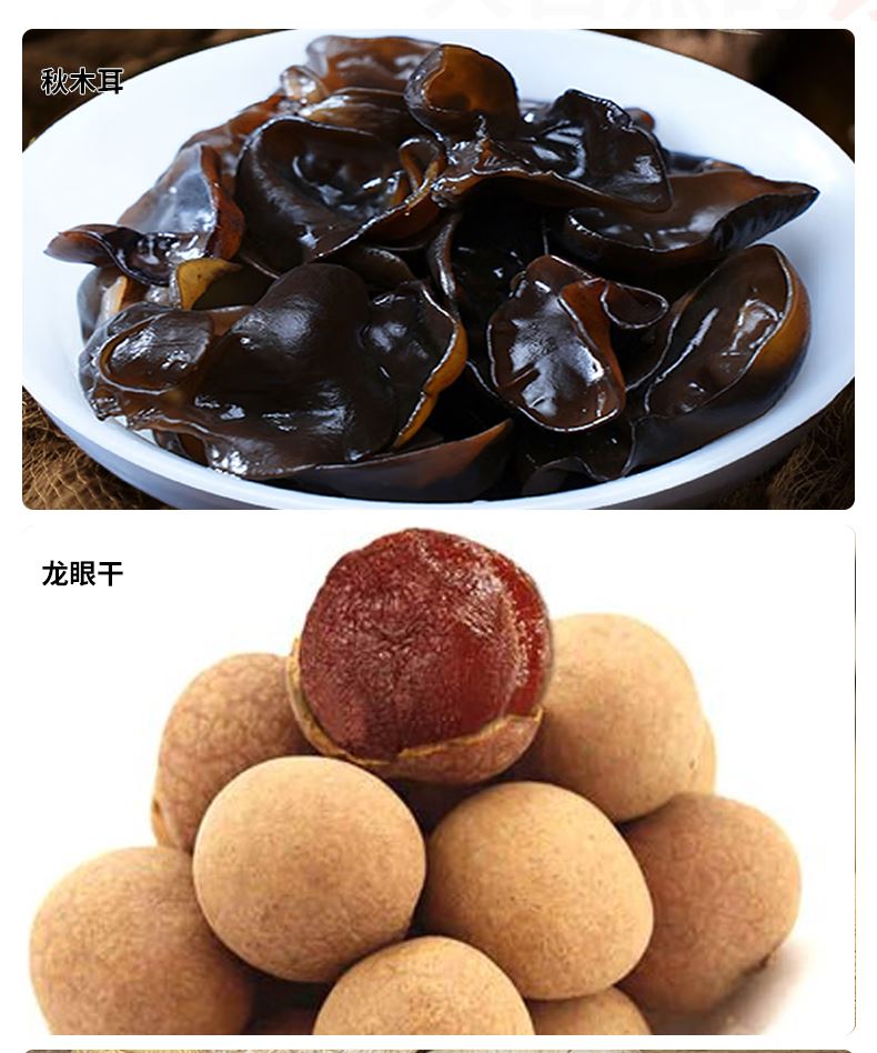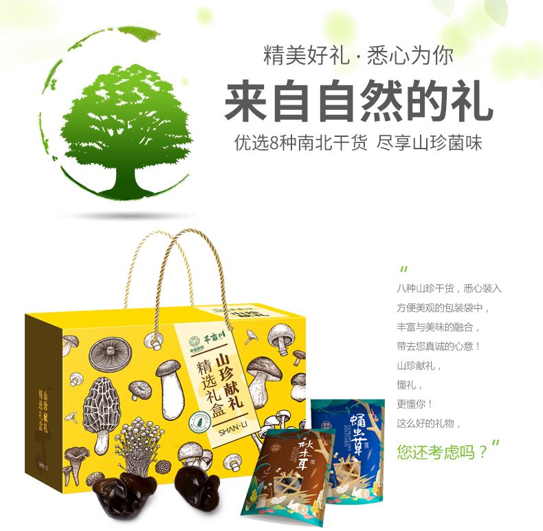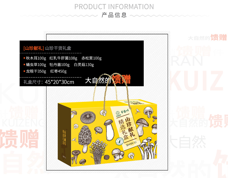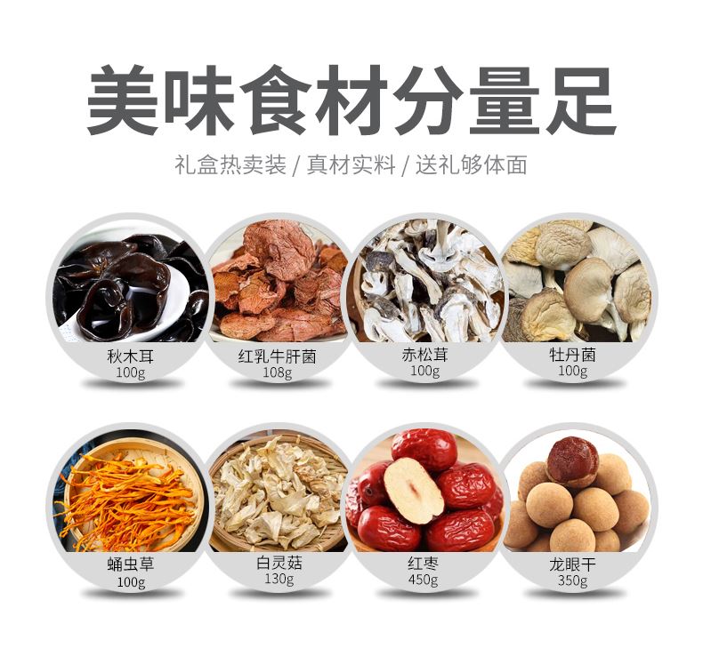 产品配置: 野生秋木耳100g 红乳牛肝菌108g 野生赤松茸100g 高山蛹虫草100g 野生牡丹菌100g 精选白灵菇130g 泰国龙眼干350g 新疆红枣450g 净含量:1.438kg 礼盒尺寸:45*20*30cm 珍有菌菇与滋补果干共融,野生秋木耳爽,新疆红枣润,一 口尝尽山珍与甘甜,邂逅自然好滋味。