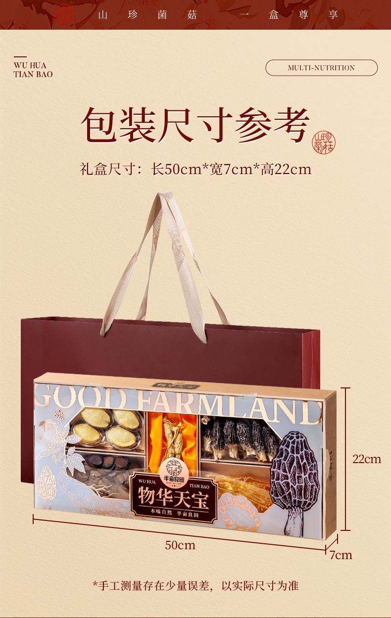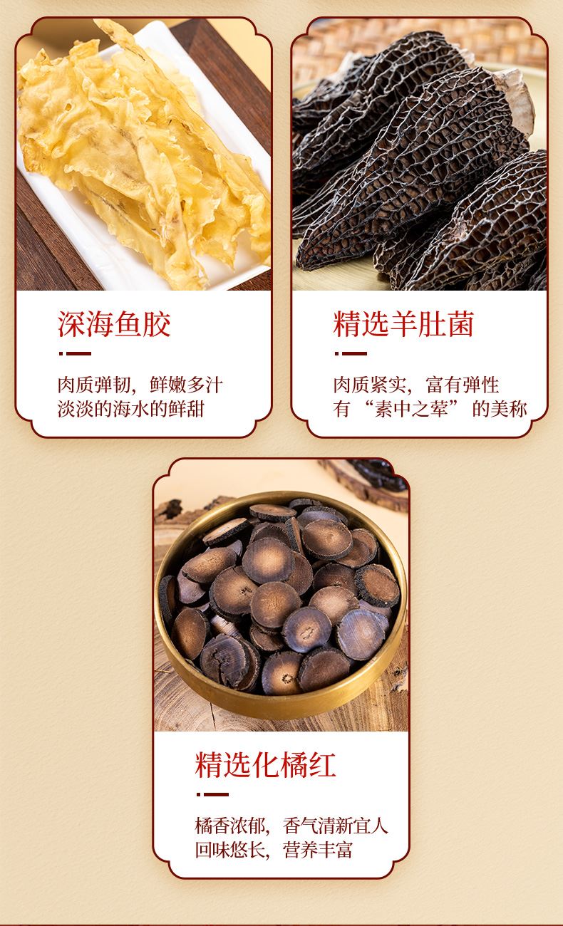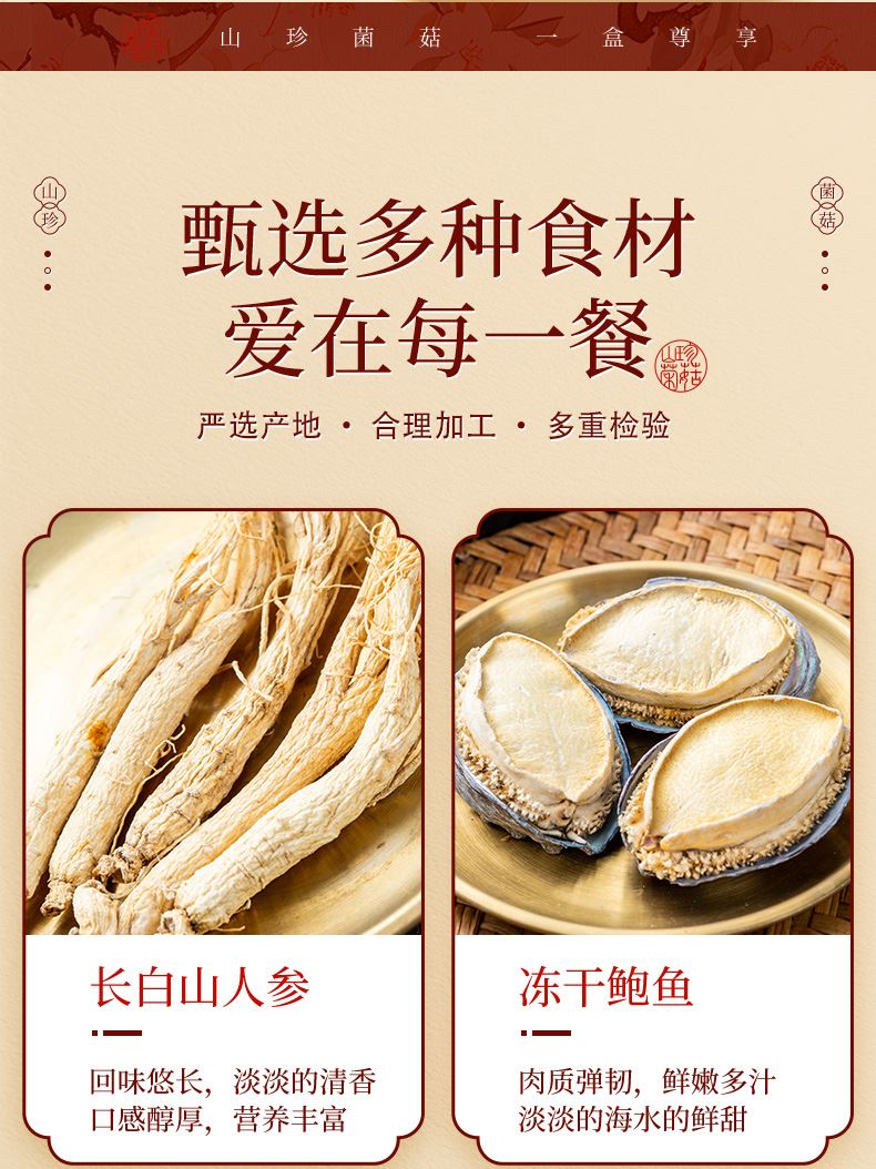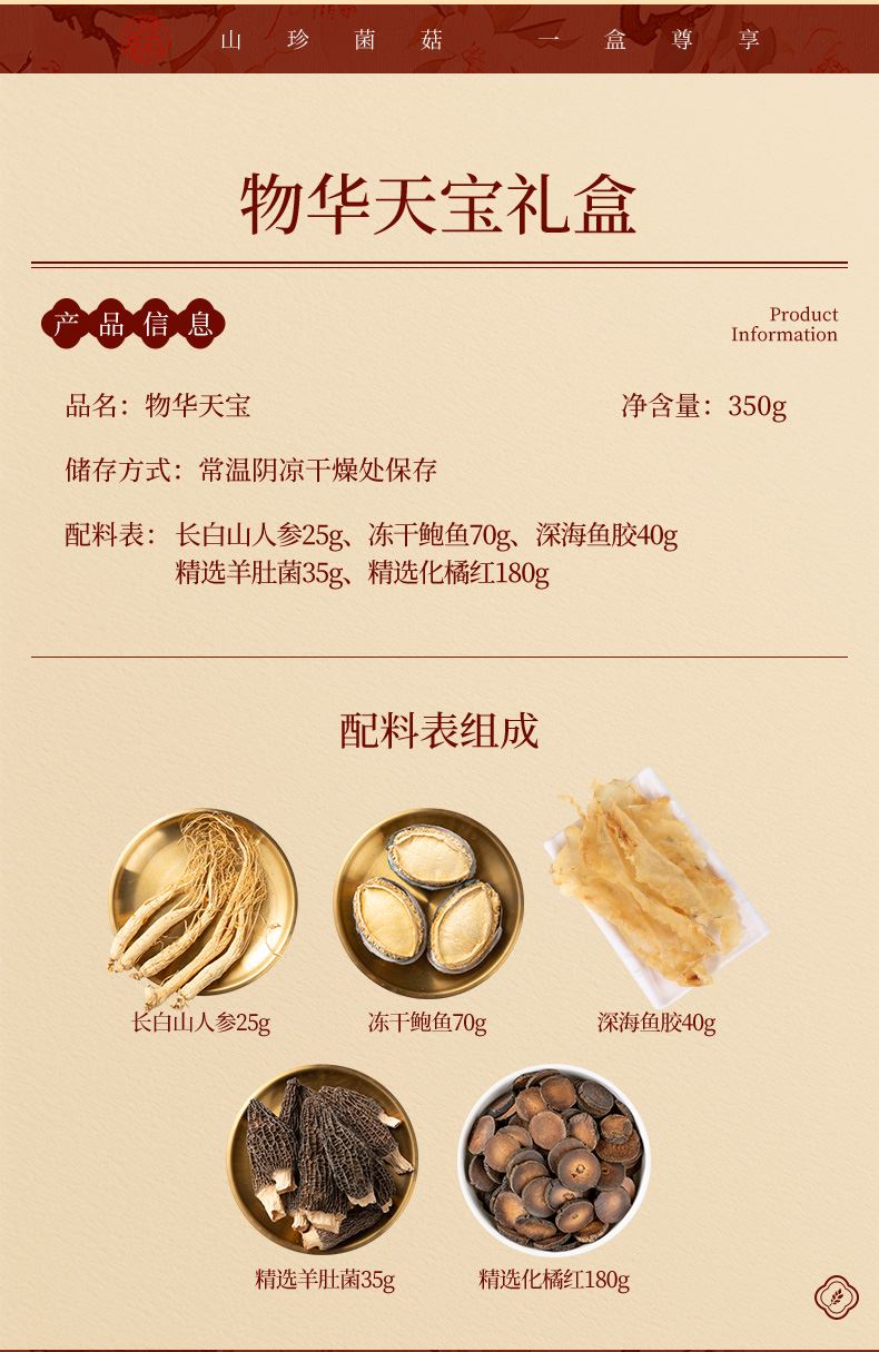产品配置: 长白山人参25g 冻干鲍鱼70g 深海鱼胶40g 精选羊肚菌35g 精选化橘红180g 净含量:350g 礼盒尺寸:50*7*22cm 山参携海味,菌胶伴橘红,一盒集天地精华。滋补礼盒配手提袋,无论是健康自养还是赠人表心意,都尽显尊崇。