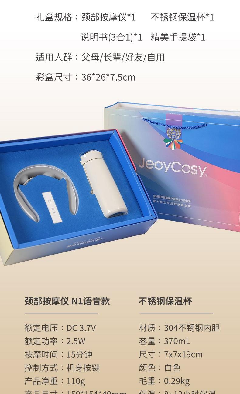 配置:颈部按摩仪*1 保温杯*1 彩盒尺寸:36*26*7.5cm 条形码:6952679801553
