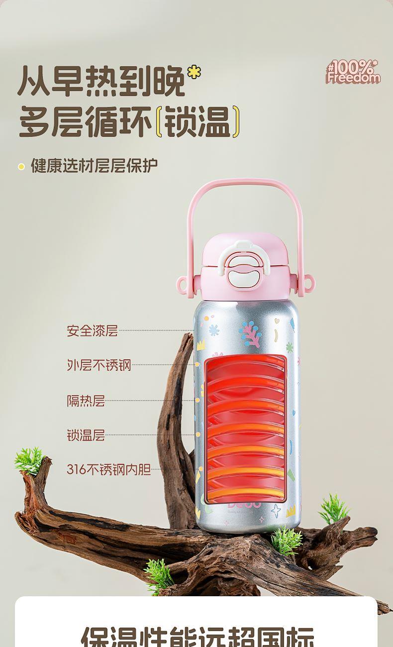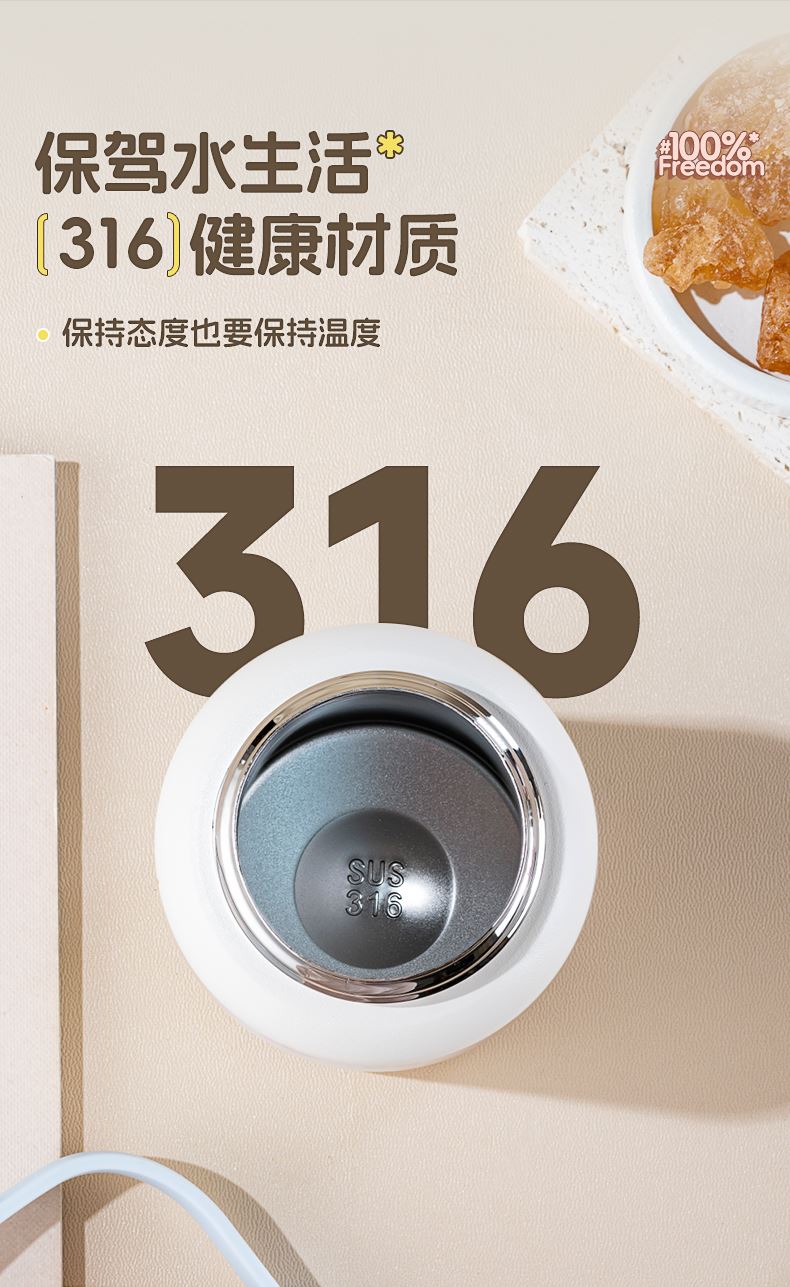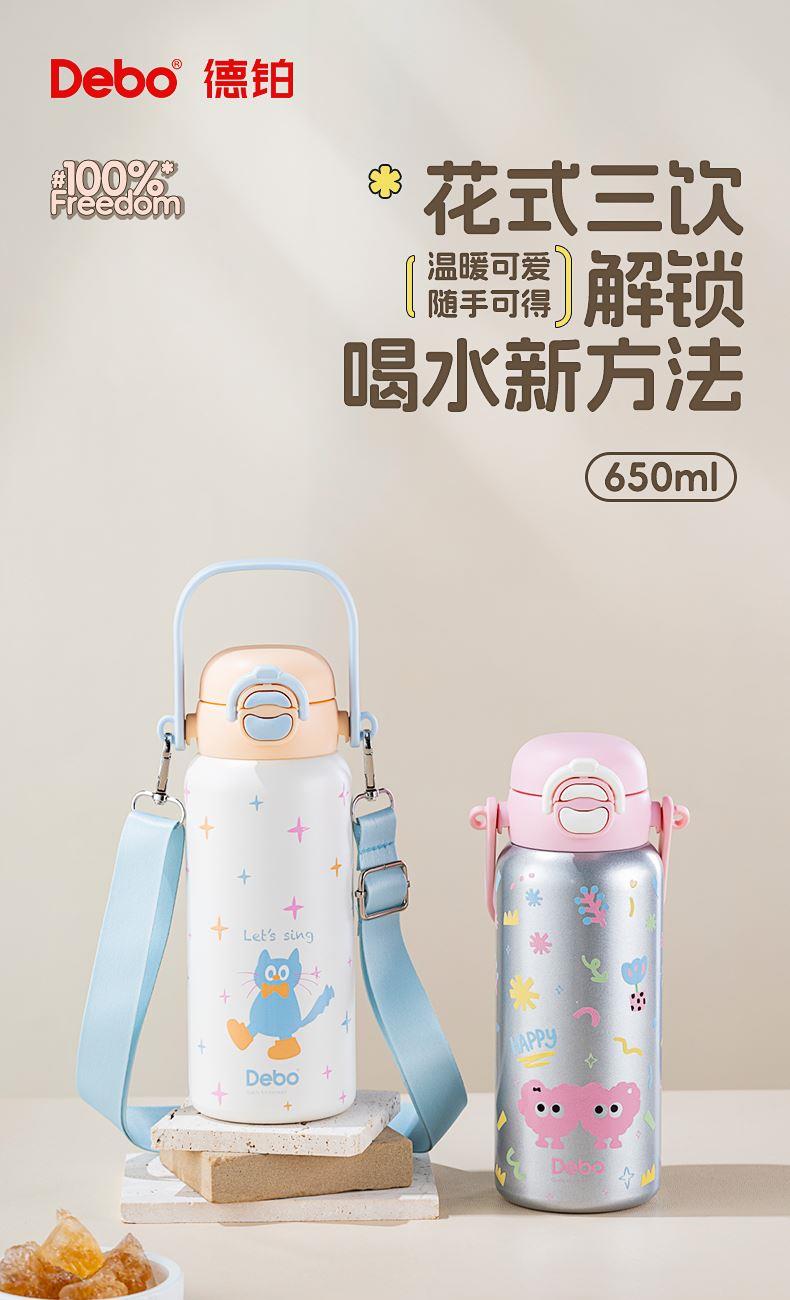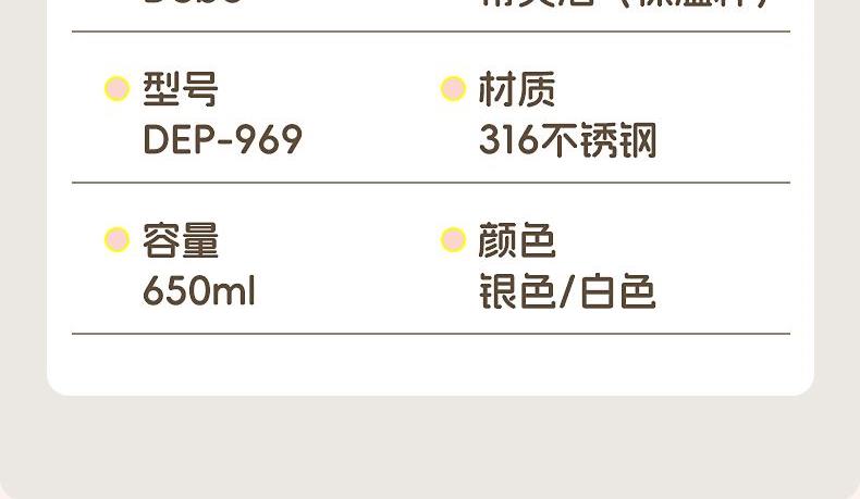 容量:650ml 材质:316不锈钢 颜色:白色/银色 包装尺寸:115*115*251mm 配置:盖子*1、杯身*1、带子*1 1. 316不锈钢内胆,安全无异味,抗氧耐腐,奶液果汁放心装; 2. 多层锁温工艺,长效保温,食品级硅胶吸管,安全材质; 3. 加宽背带,不勒肩膀,轻松受力,可拆卸背带,便携出行; 4. 一杯双饮,满足不同需求。