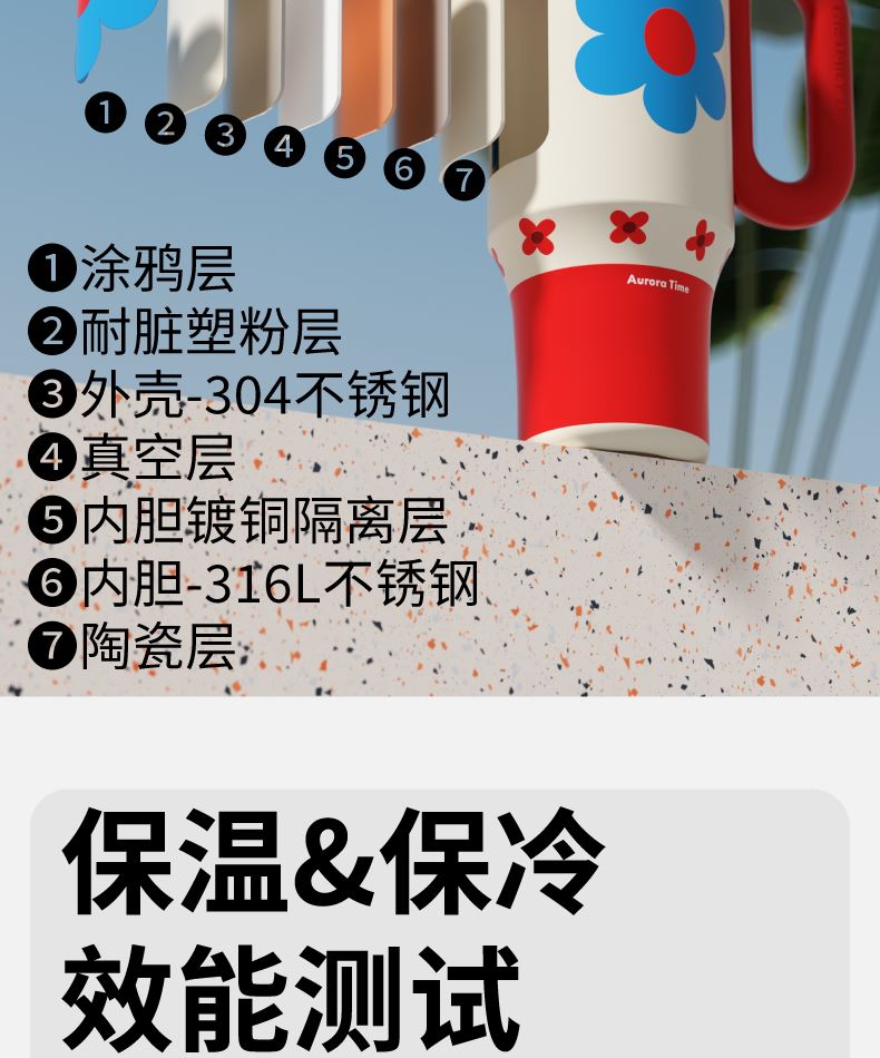 材质:陶瓷覆层内胆、硅胶、PP、Tritan 颜色:绿蔓、小碎花、慵懒夏日、放轻松 包装:彩盒 (1)硅胶吸管盖,一掀即喝,畅饮一整天 (2)大容量,满足一天的饮水量 (3)车载可用设计 (4)圆润把手,便携外带,握持舒适 (5)长效保温、保冷(12H)