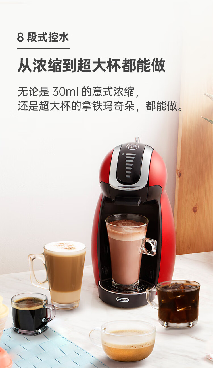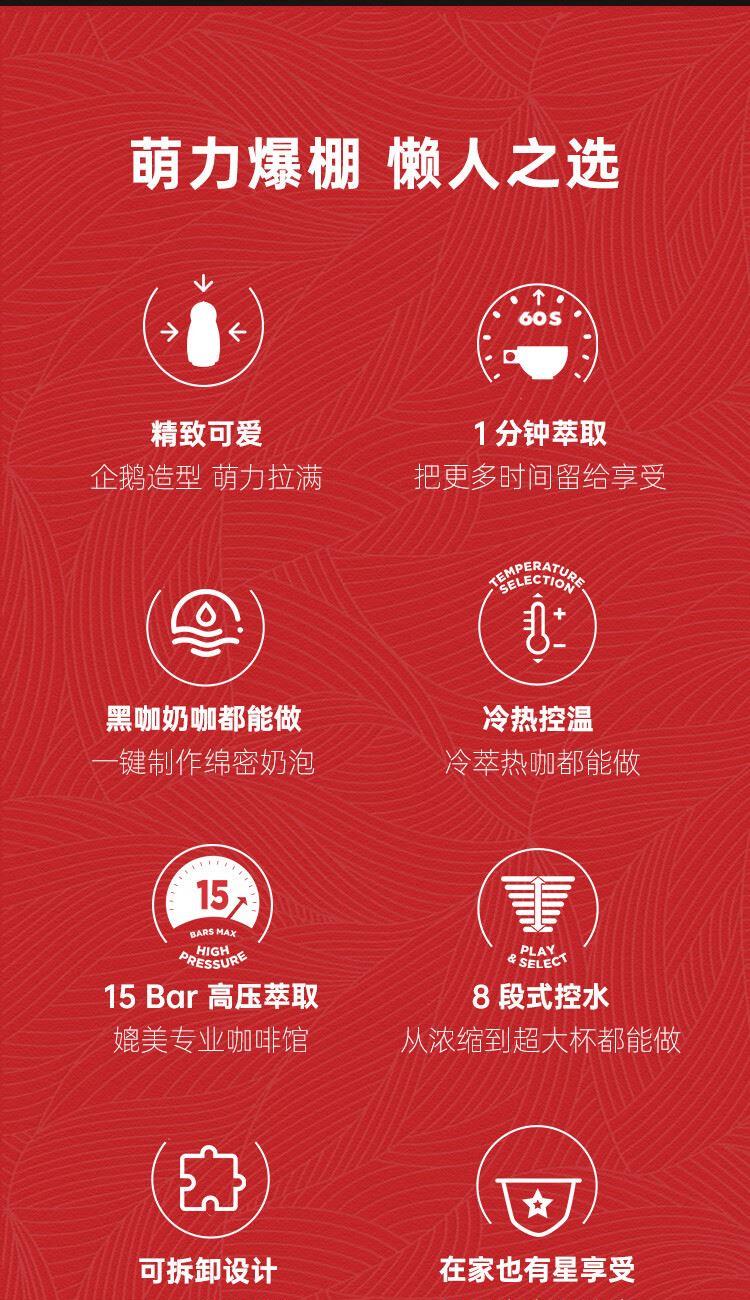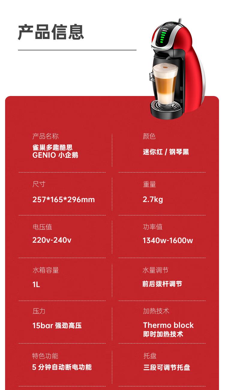 产品:雀巢多趣酷思GENIO 小企鹅 额定功率:1500W 水箱容量:1L 颜色:迷你红 压力:15bar 强劲高压 特色功能:5 分钟自动断电功能