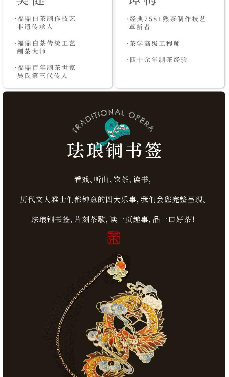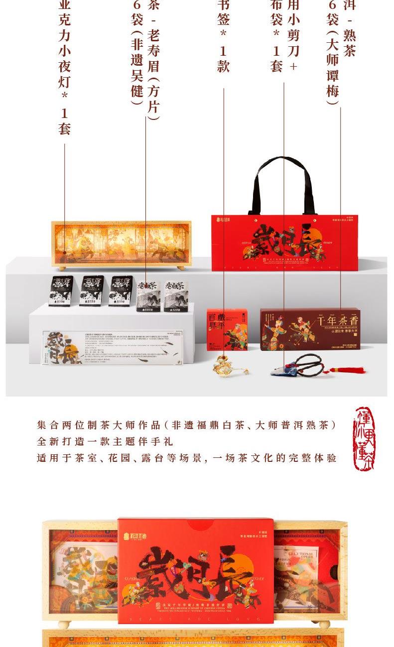 木制+亚克力小夜灯*1套 福鼎白茶.老寿眉(方片)5g*6袋(非遗吴健) 珐琅书签*1款 茶道专用小剪刀+吊坠+布袋*1套 云南普洱.熟茶5g*6袋(大师谭梅)