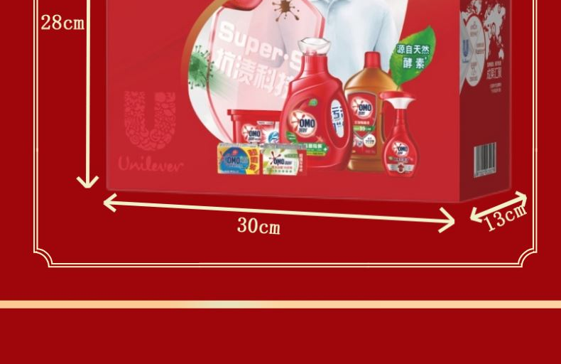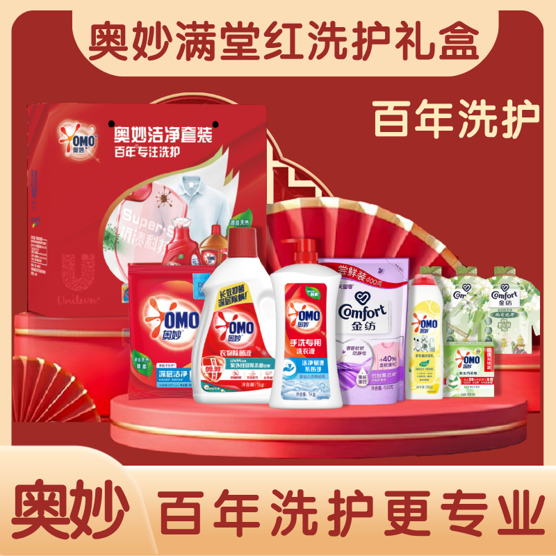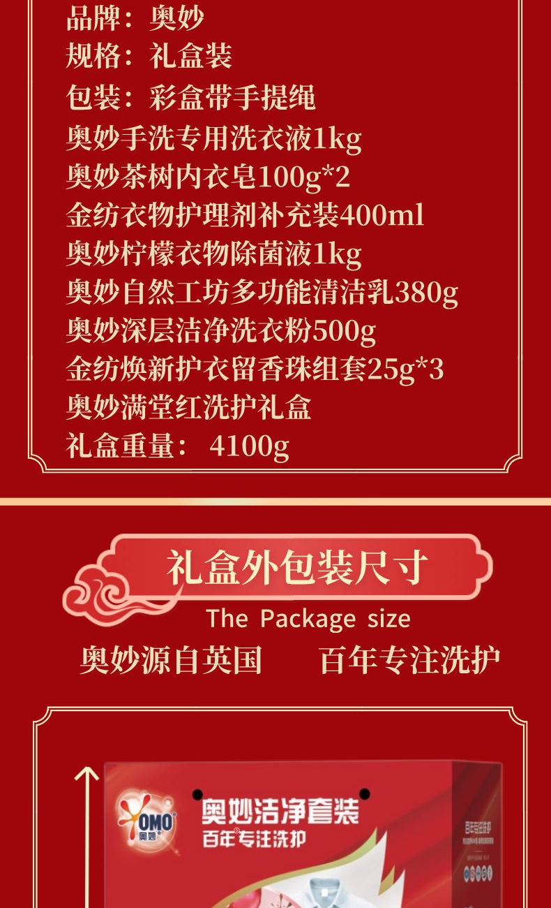 套装配置: 奥妙手洗专用洗衣液1kg 奥妙茶树内衣皂100g*2 金纺衣物护理剂补充装400ml 奥妙柠檬衣物除JUN液1kg 奥妙自然工坊多功能清洁乳380g 奥妙深层洁净洗衣粉500g 金纺焕新护衣留香珠组套25g*3 奥妙满堂红洗护礼盒 礼盒重量: 4100g 礼盒尺寸:30*13*28cm
