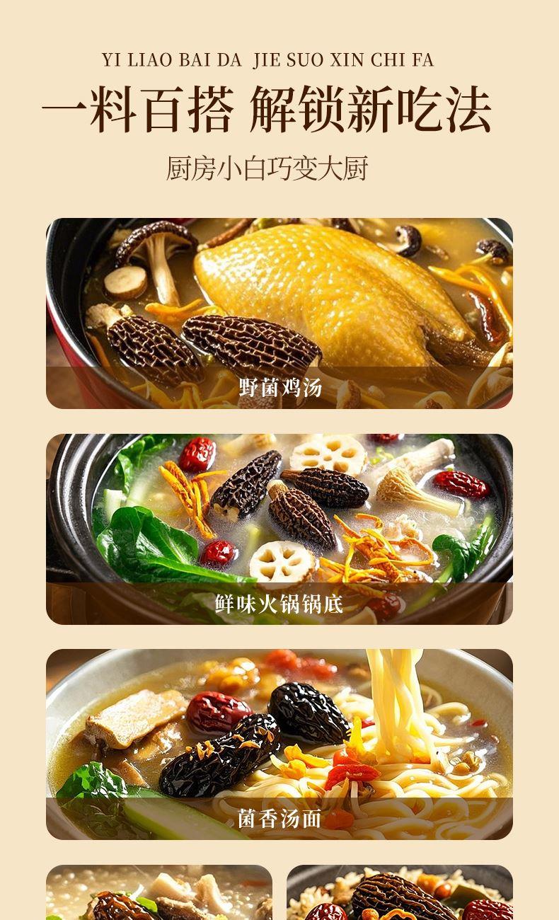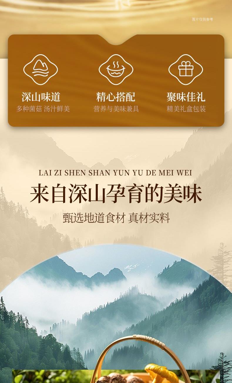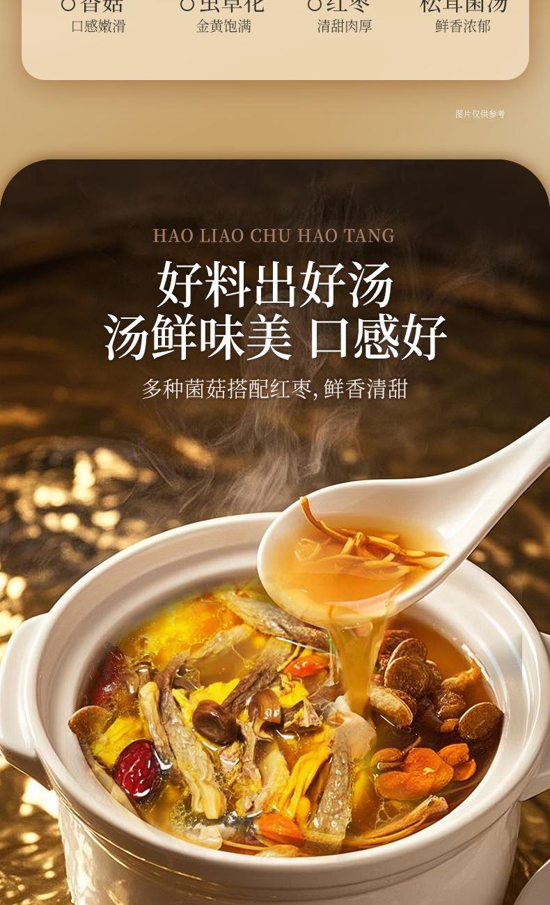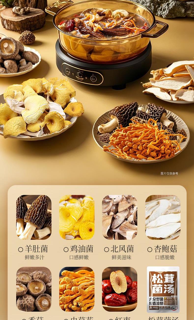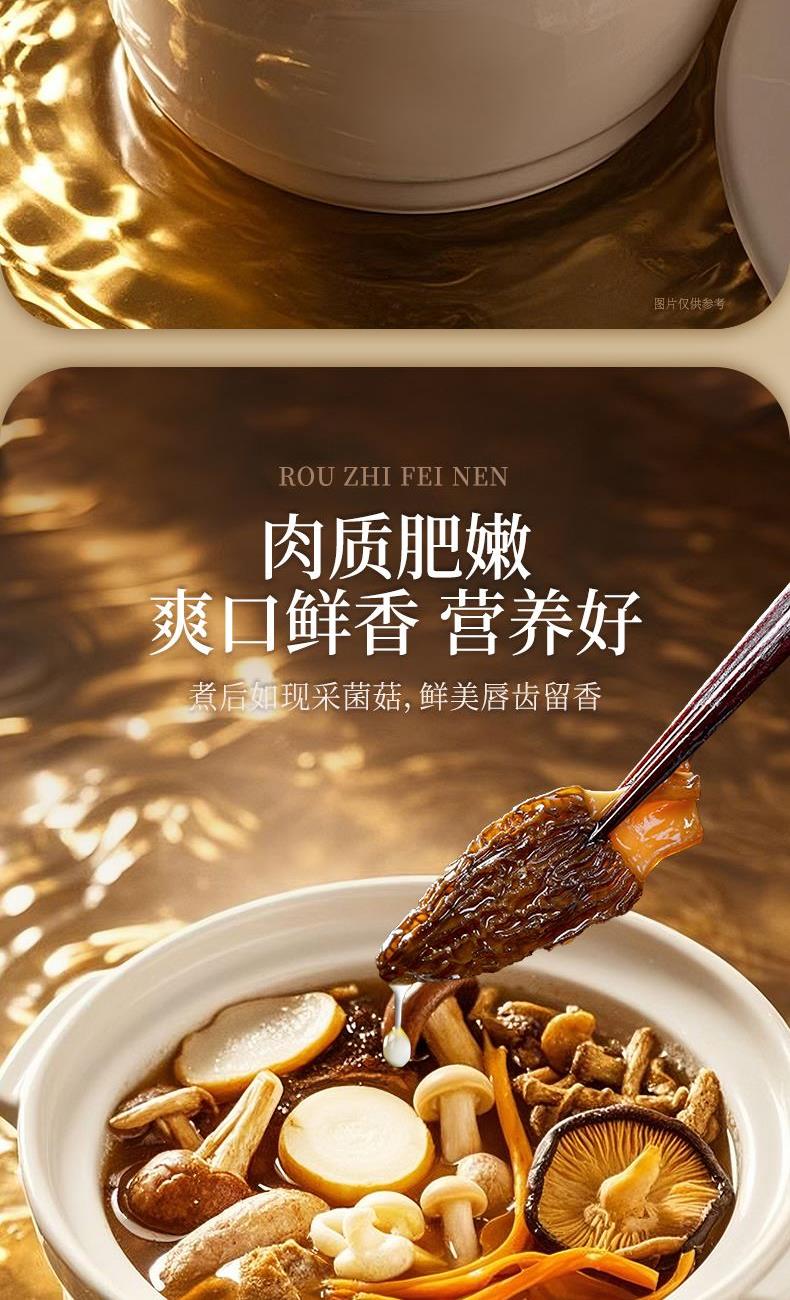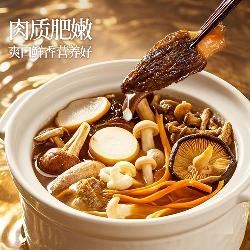 食材:羊肚菌、红枣、北风菌、杏鲍菇、 虫草花、鸡油菌、香菇、150g松茸菌汤 净含量:350克 保质期:12个月 尺寸:420mm*95mm*240mm 规格: [100g*2(菌包)+150g(汤包)] 1.精选优质菌菇,如羊肚菌、鸡油菌等,这些菌菇不仅口感鲜美,而且营养丰富,是制作菌汤的上等食材 2.丰富的营养成分:菌菇中含有丰富的蛋白质、维生素和矿物质,对身体大有裨益 3.精美的包装设计,大气,设计精美,适合作为节日礼物或商务馈赠,能够彰显送礼人的品味和心意 4.简单易操作,只需将菌菇进行泡发,加入喜欢的食材一起炖煮,即可轻松享受美味的菌菇汤