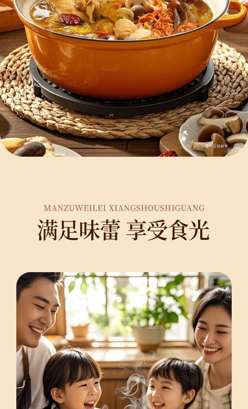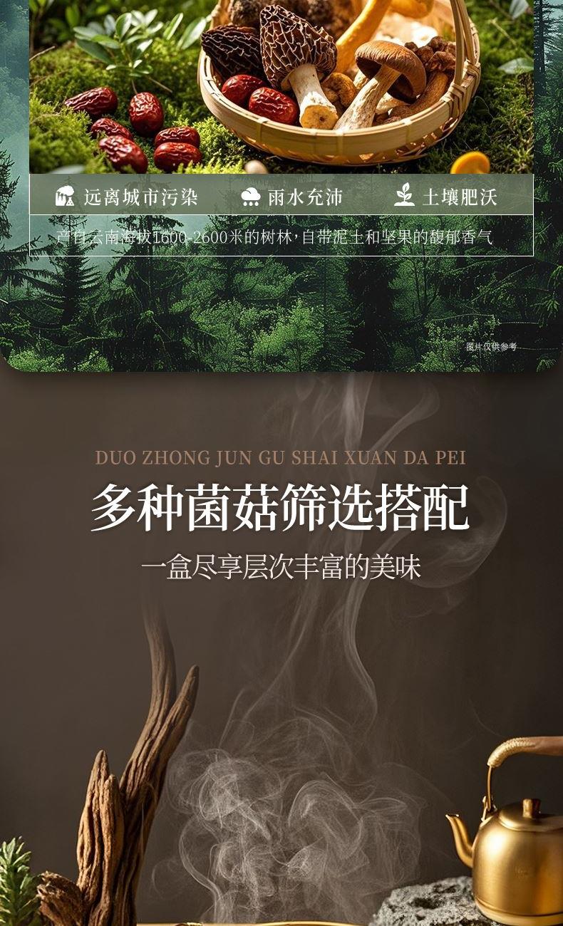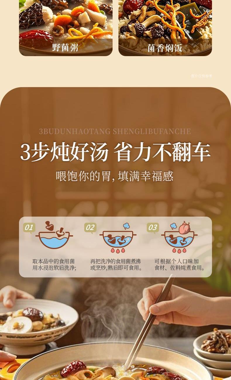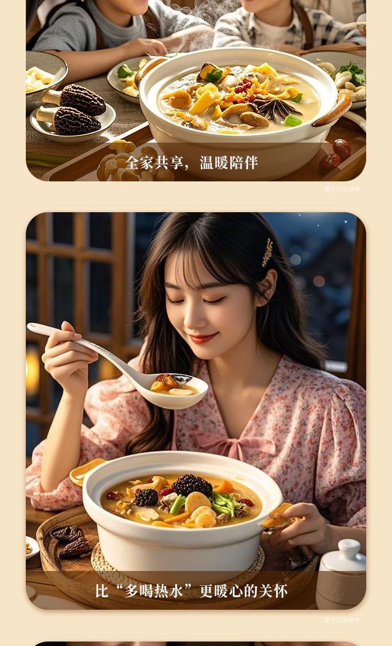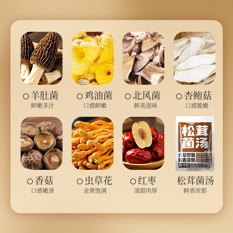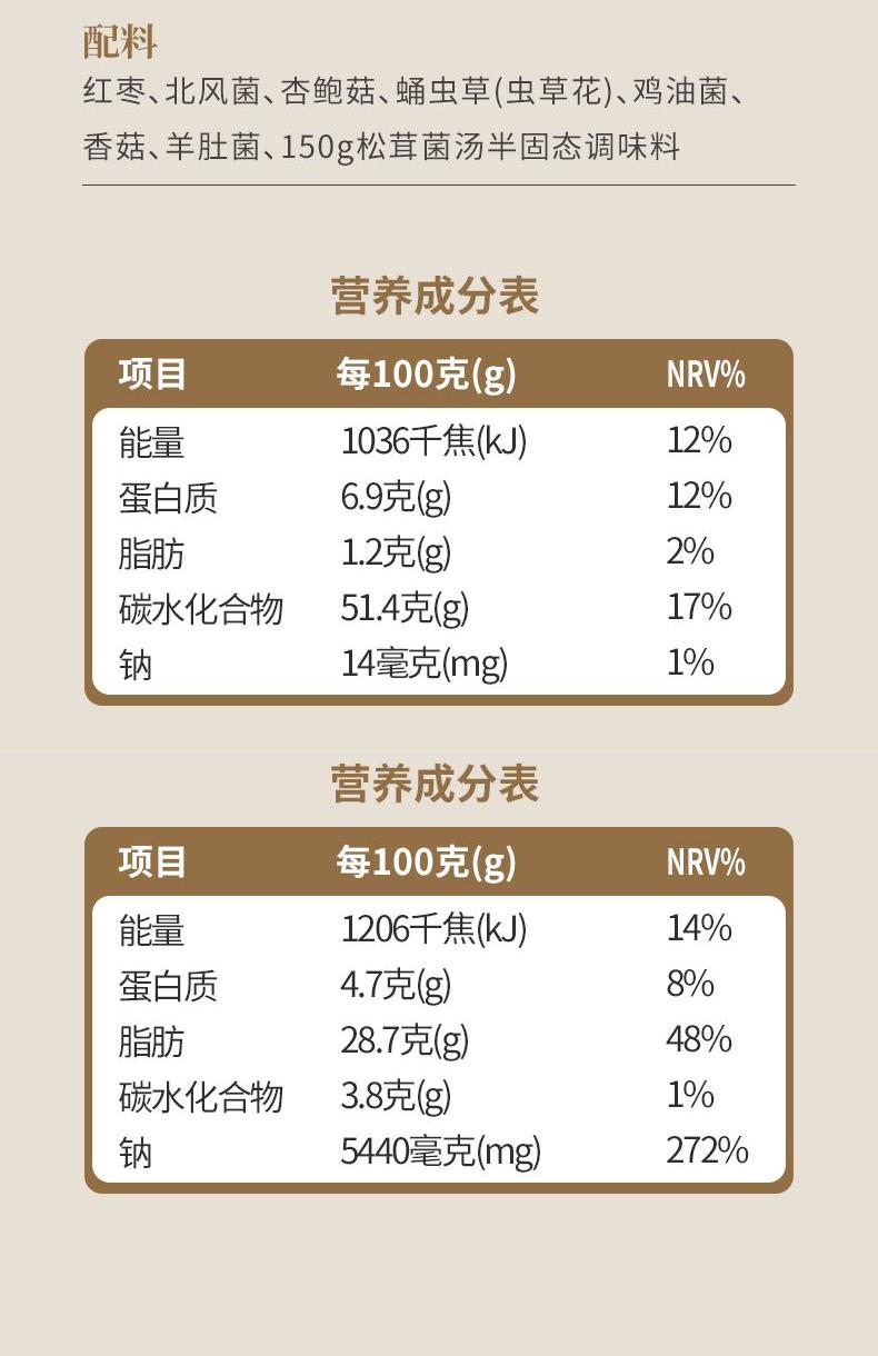 食材:羊肚菌、红枣、北风菌、杏鲍菇、 虫草花、鸡油菌、香菇、150g松茸菌汤 净含量:350克 保质期:12个月 尺寸:420mm*95mm*240mm 规格: [100g*2(菌包)+150g(汤包)] 1.精选优质菌菇,如羊肚菌、鸡油菌等,这些菌菇不仅口感鲜美,而且营养丰富,是制作菌汤的上等食材 2.丰富的营养成分:菌菇中含有丰富的蛋白质、维生素和矿物质,对身体大有裨益 3.精美的包装设计,大气,设计精美,适合作为节日礼物或商务馈赠,能够彰显送礼人的品味和心意 4.简单易操作,只需将菌菇进行泡发,加入喜欢的食材一起炖煮,即可轻松享受美味的菌菇汤