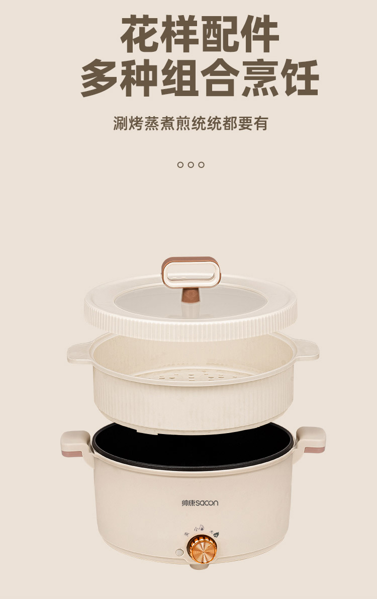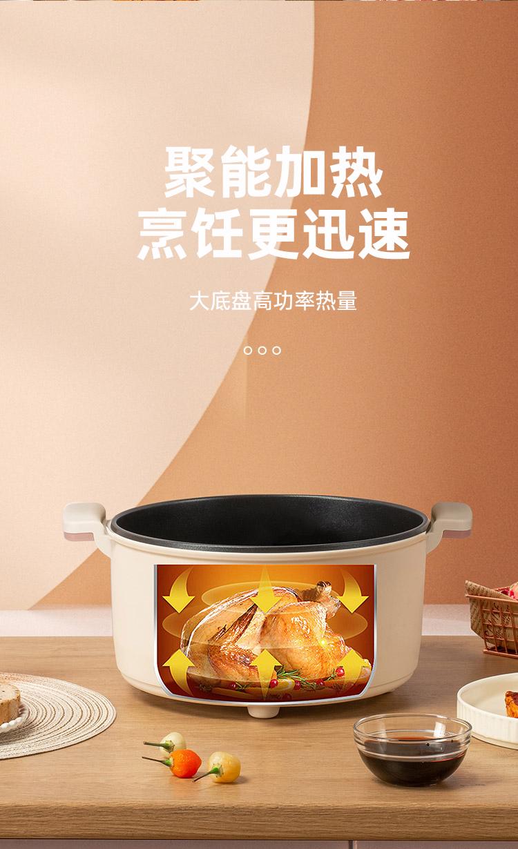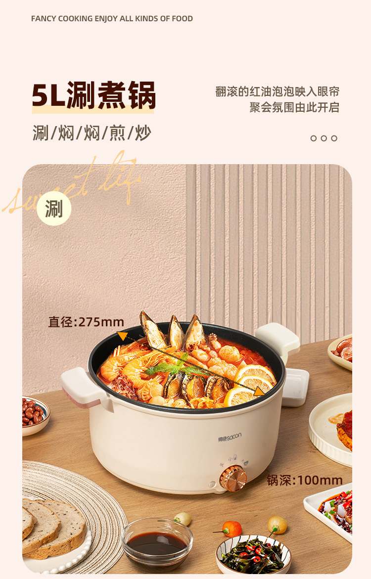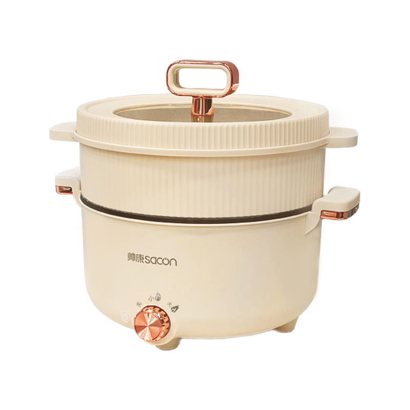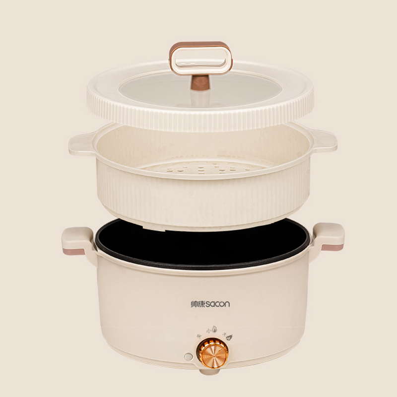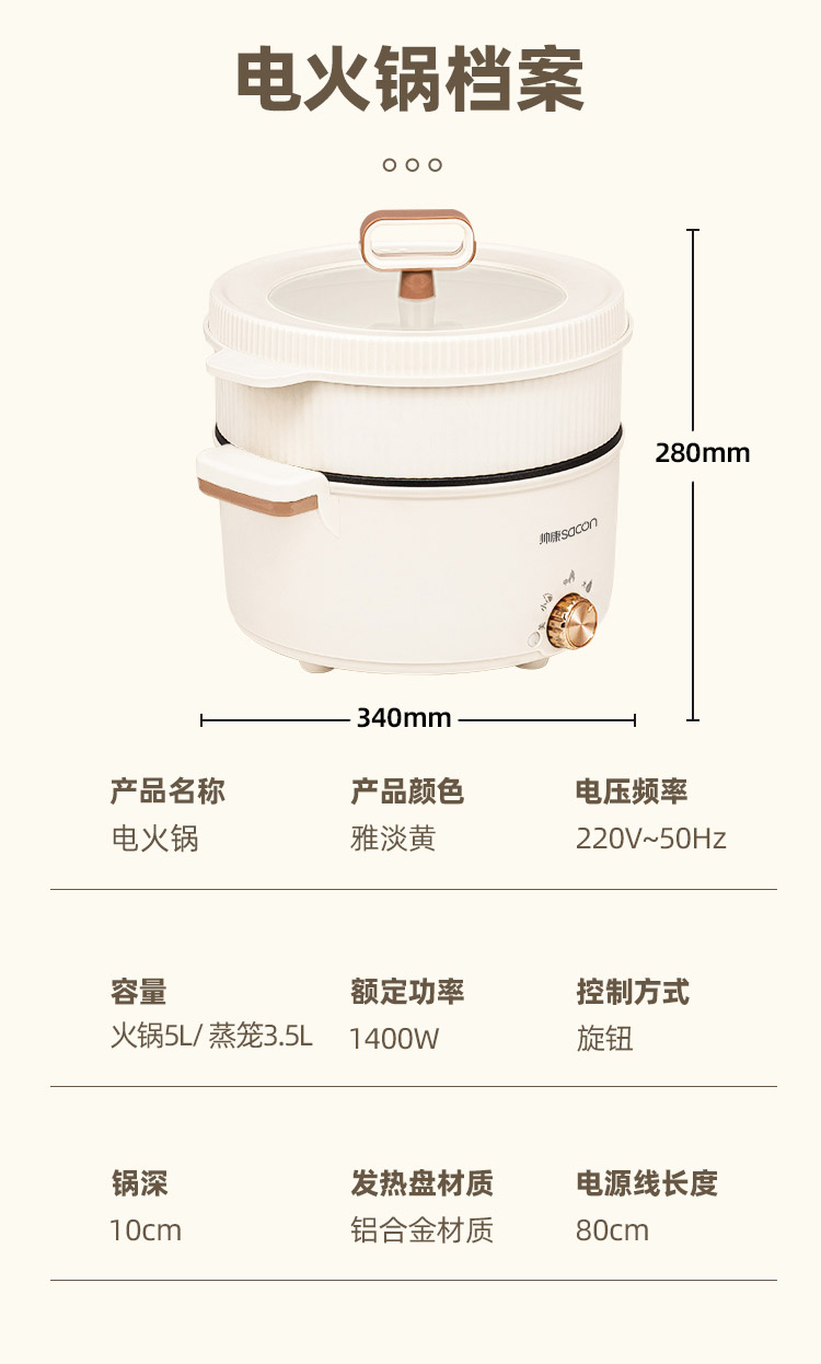 认证型号:HGGP-4AL 涂层材质:喷涂聚四氟乙烯涂层 锅体材质:不锈钢 颜色:米色系 容量:5L 额定电压:220V 额定功率:1400W 电源线长:0.8m 类型:电火锅 操控方式:旋钮式