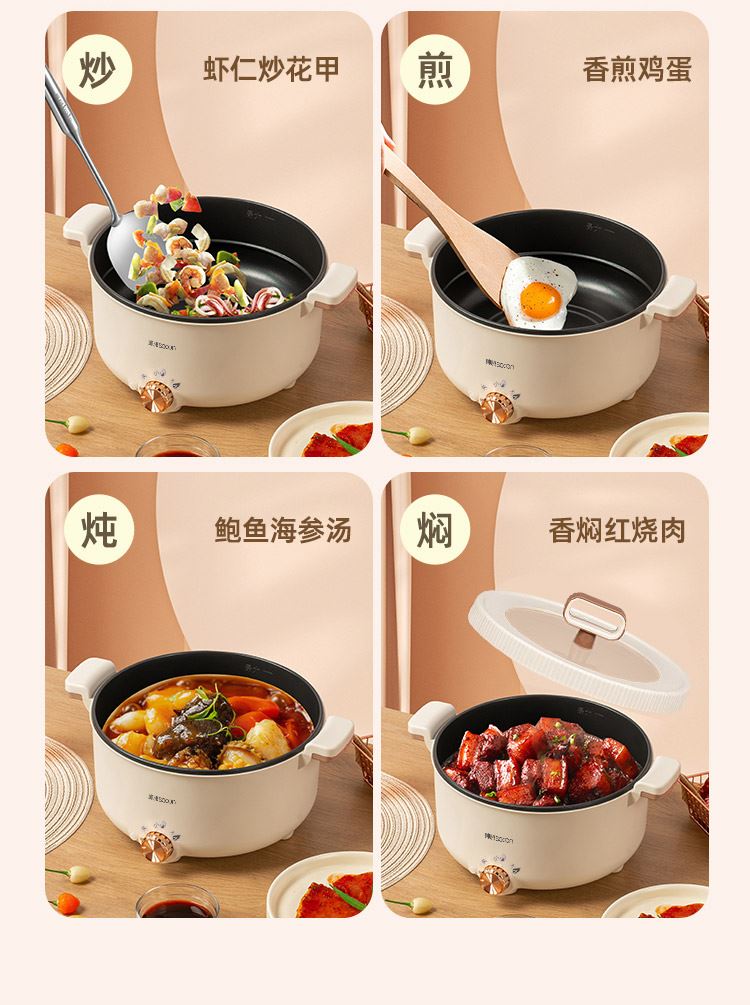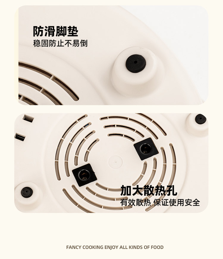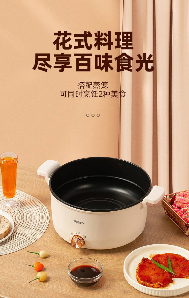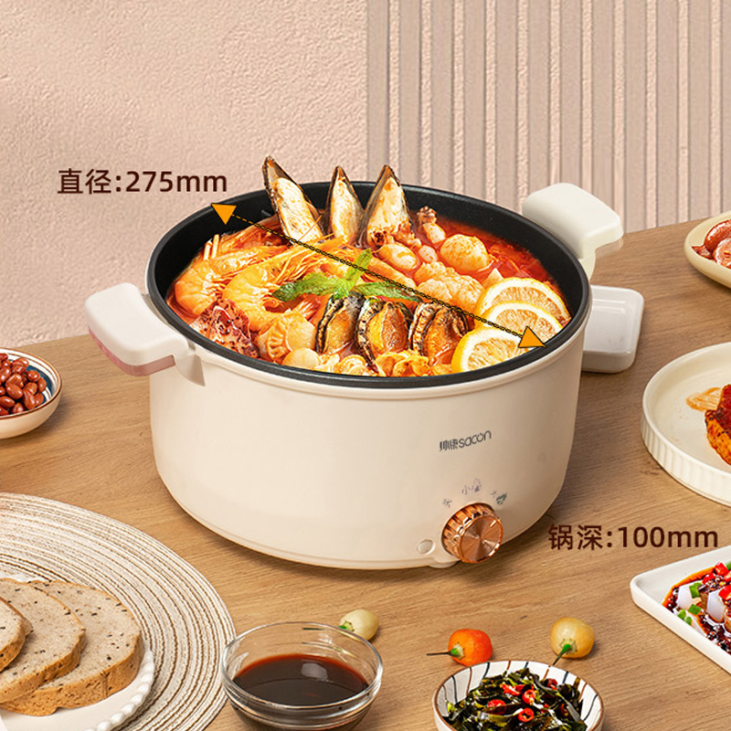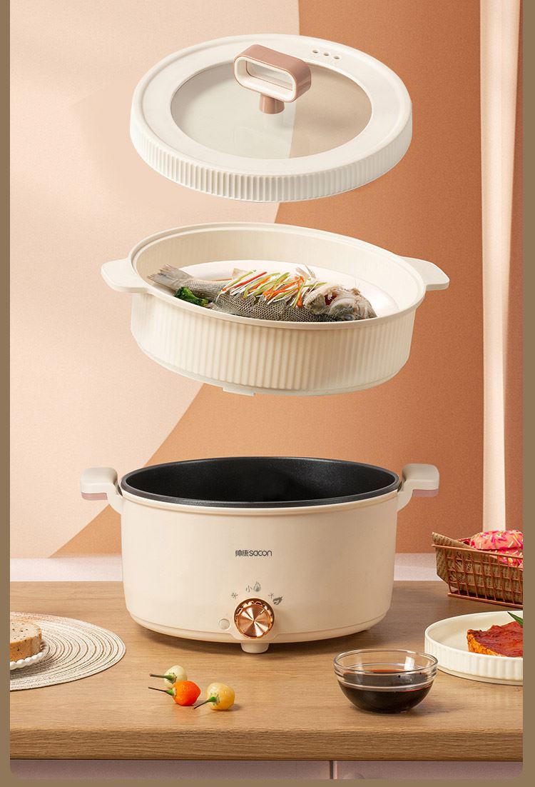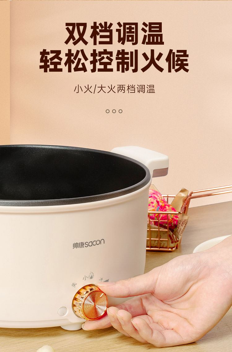 认证型号:HGGP-4AL 涂层材质:喷涂聚四氟乙烯涂层 锅体材质:不锈钢 颜色:米色系 容量:5L 额定电压:220V 额定功率:1400W 电源线长:0.8m 类型:电火锅 操控方式:旋钮式