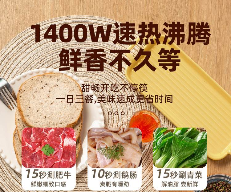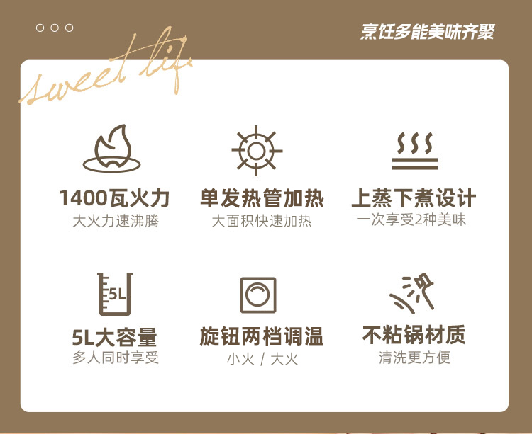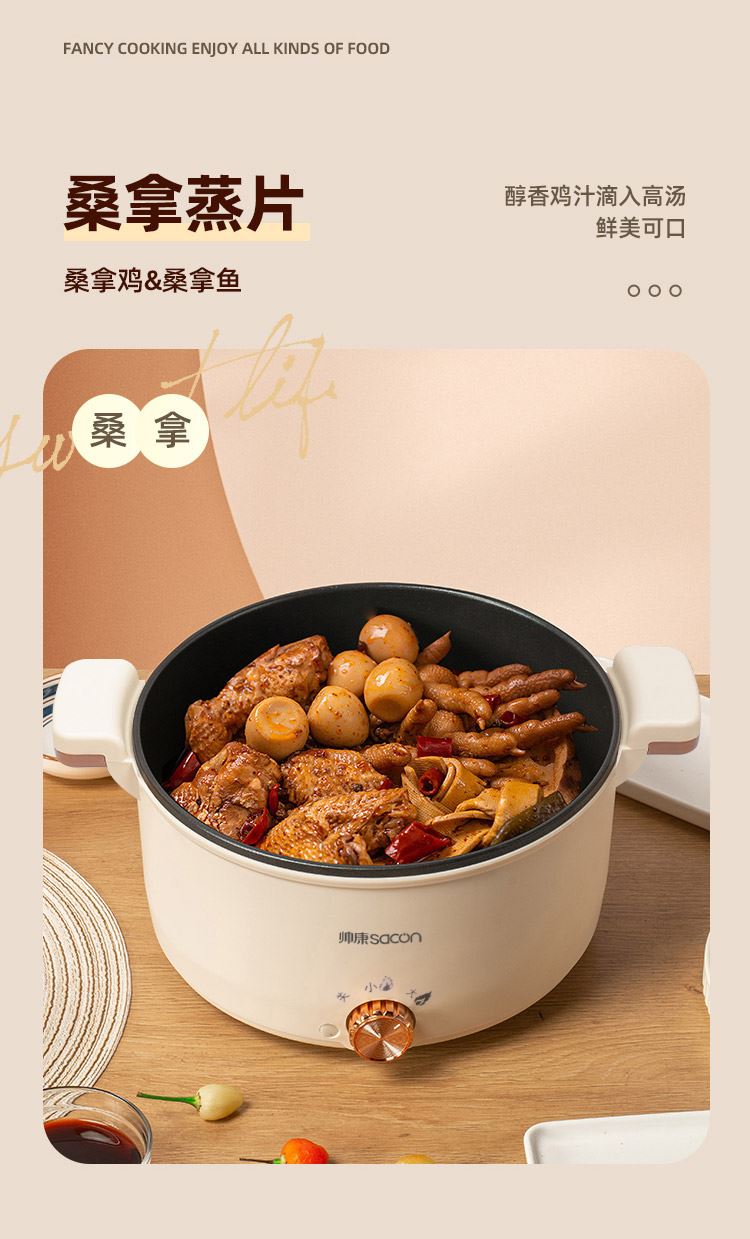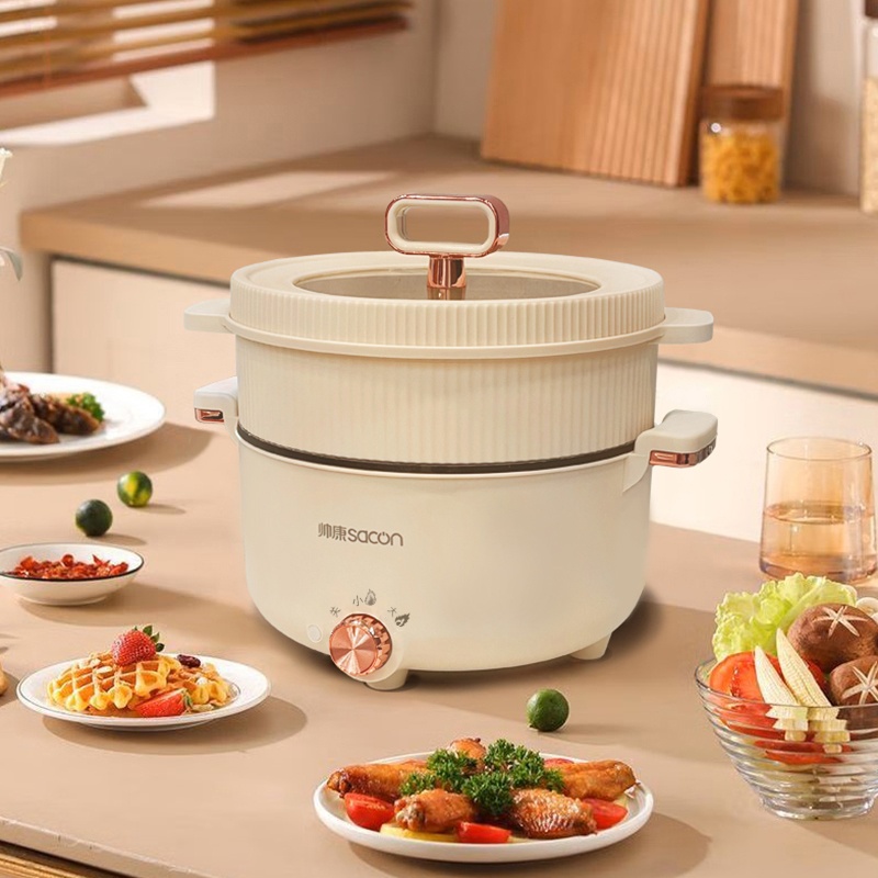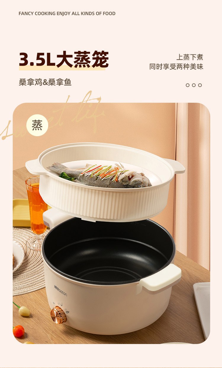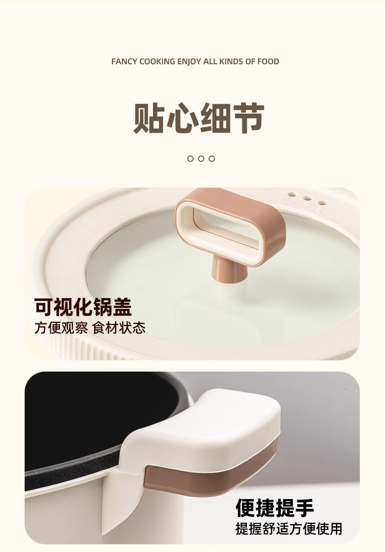 认证型号:HGGP-4AL 涂层材质:喷涂聚四氟乙烯涂层 锅体材质:不锈钢 颜色:米色系 容量:5L 额定电压:220V 额定功率:1400W 电源线长:0.8m 类型:电火锅 操控方式:旋钮式