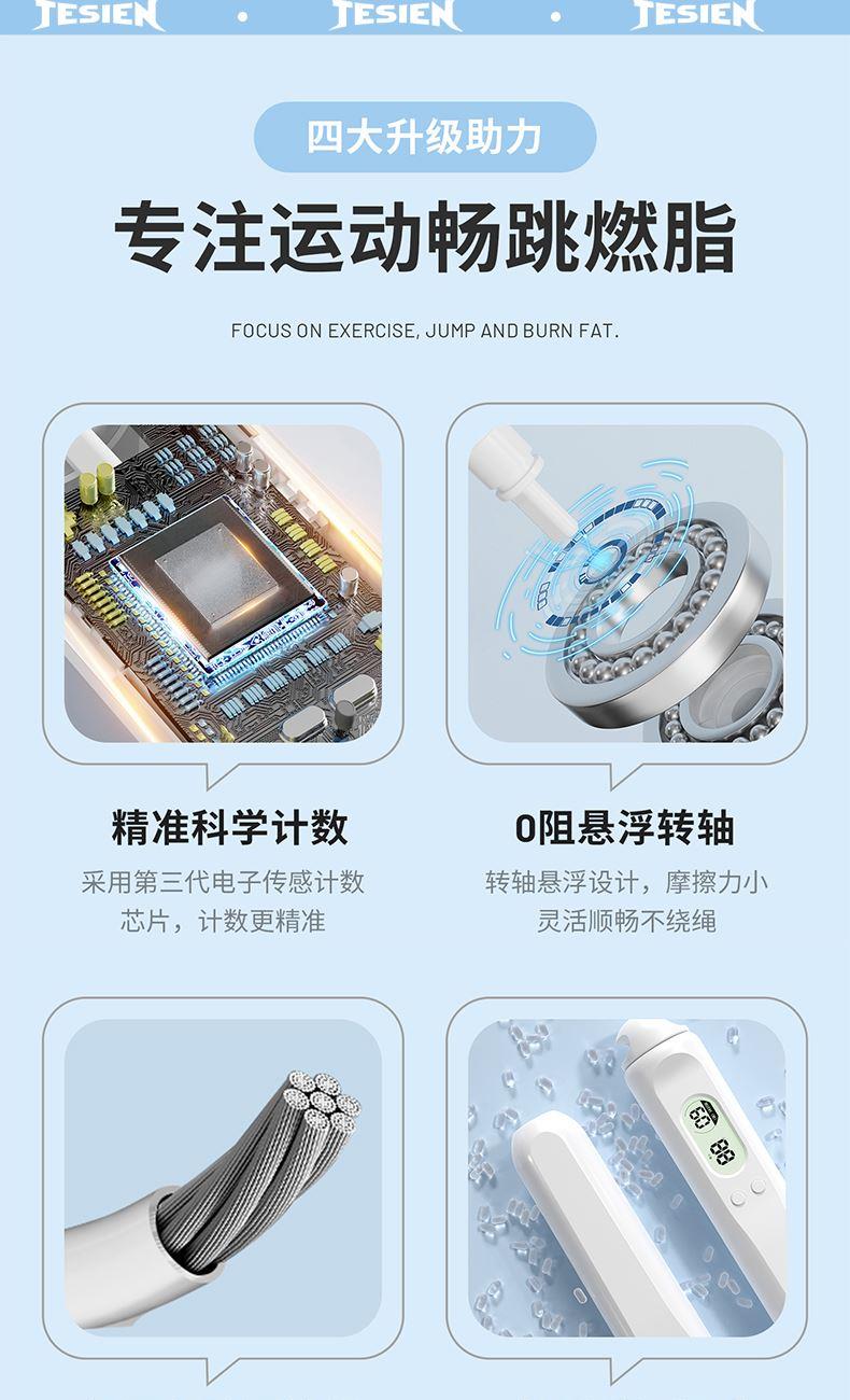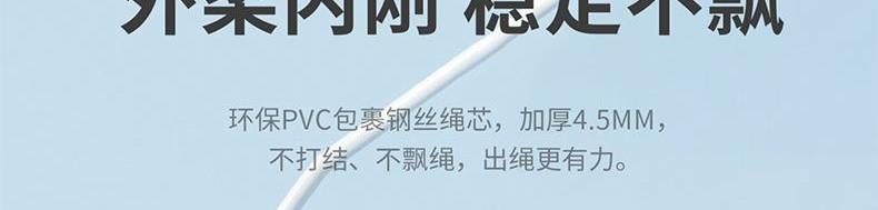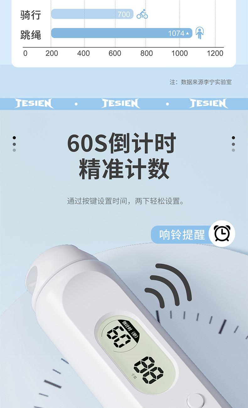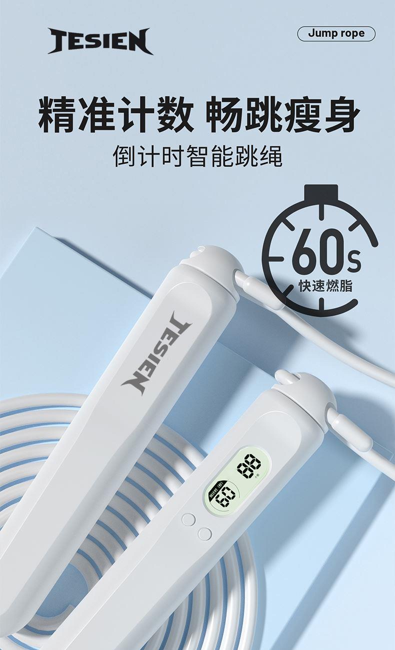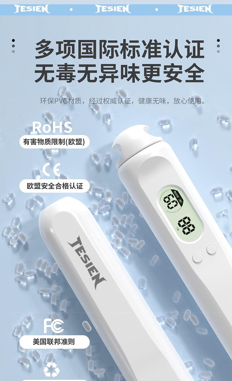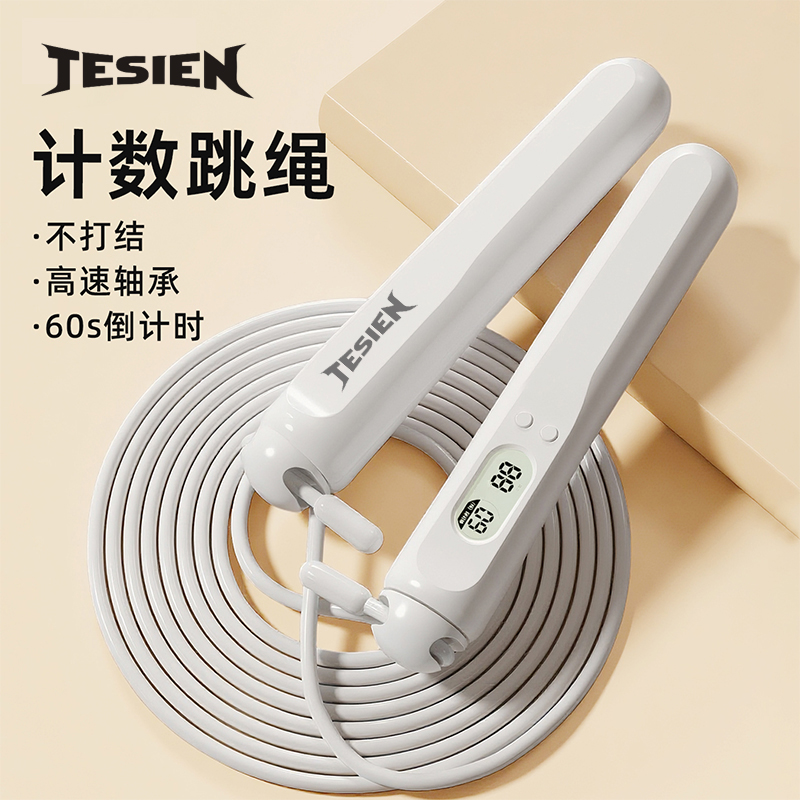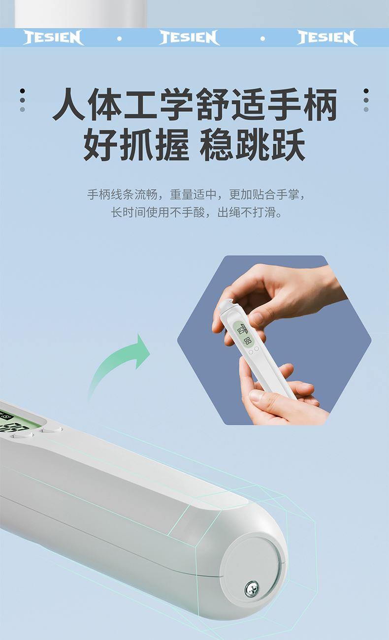 型号 TSN-EP23 材质 手柄:ABS 绳子:PVC+钢丝 颜色 白色 产品尺寸 绳长约2.8m 手柄2.5*17cm 包装尺寸:13*3.5*18cm 计数跳绳 人体工程学与便携性 流畅与耐用设计