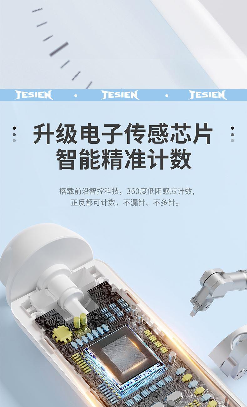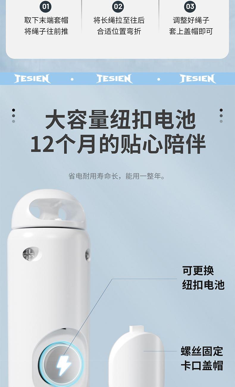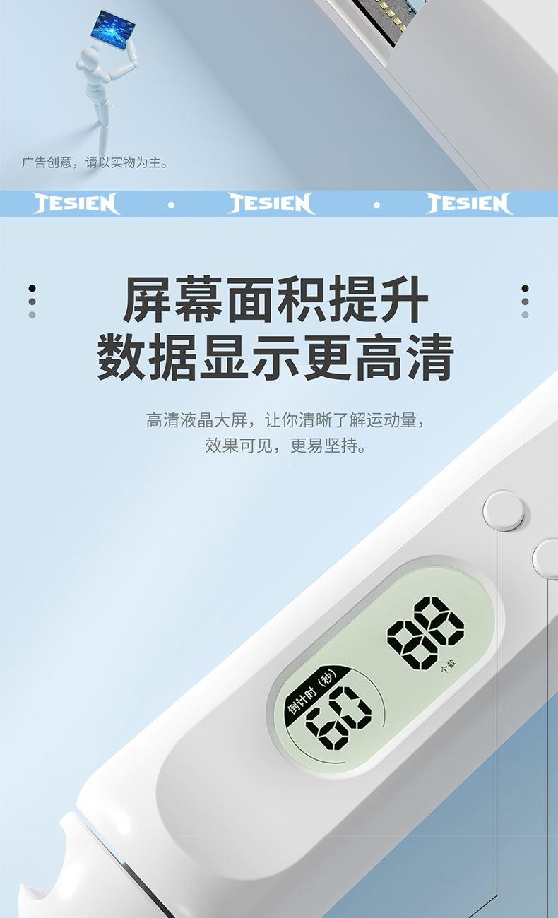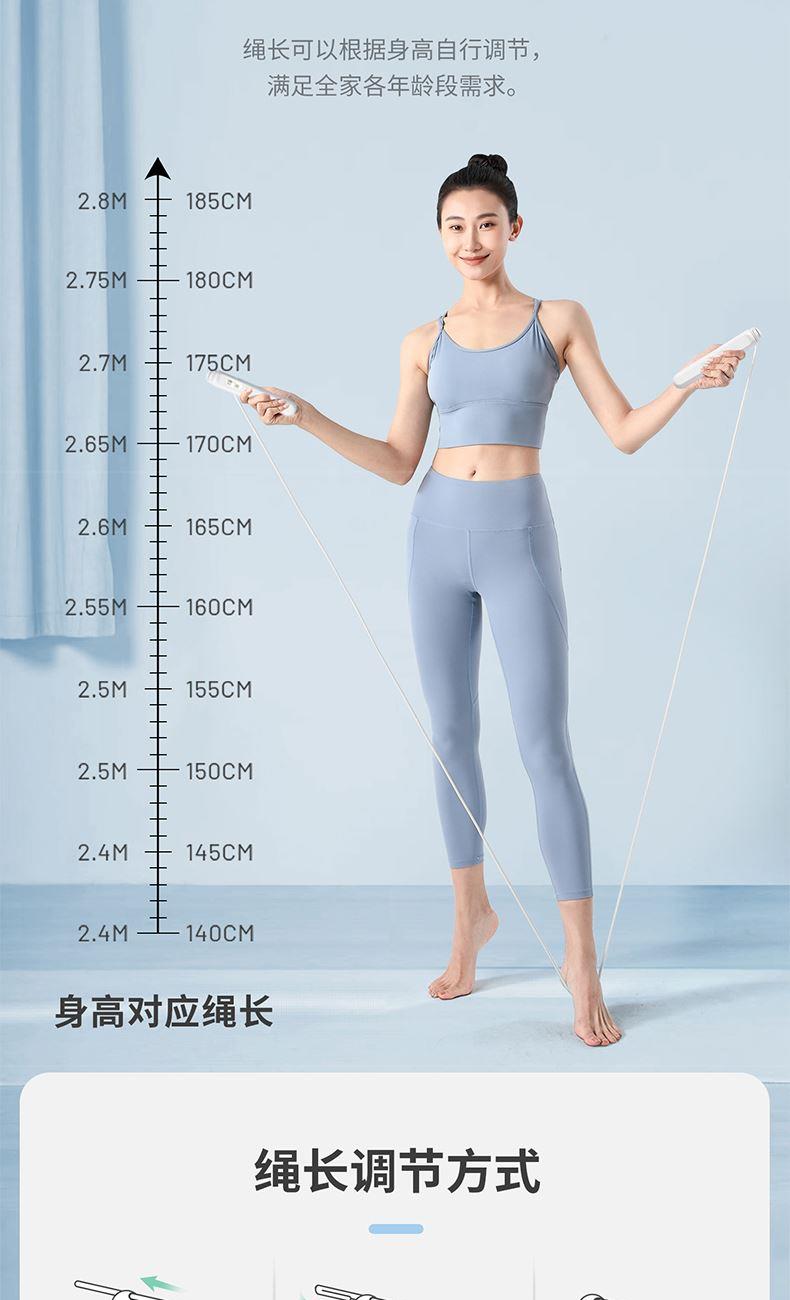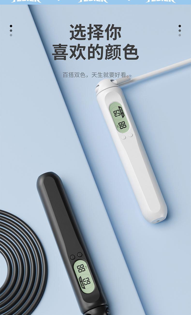 型号 TSN-EP23 材质 手柄:ABS 绳子:PVC+钢丝 颜色 白色 产品尺寸 绳长约2.8m 手柄2.5*17cm 包装尺寸:13*3.5*18cm 计数跳绳 人体工程学与便携性 流畅与耐用设计