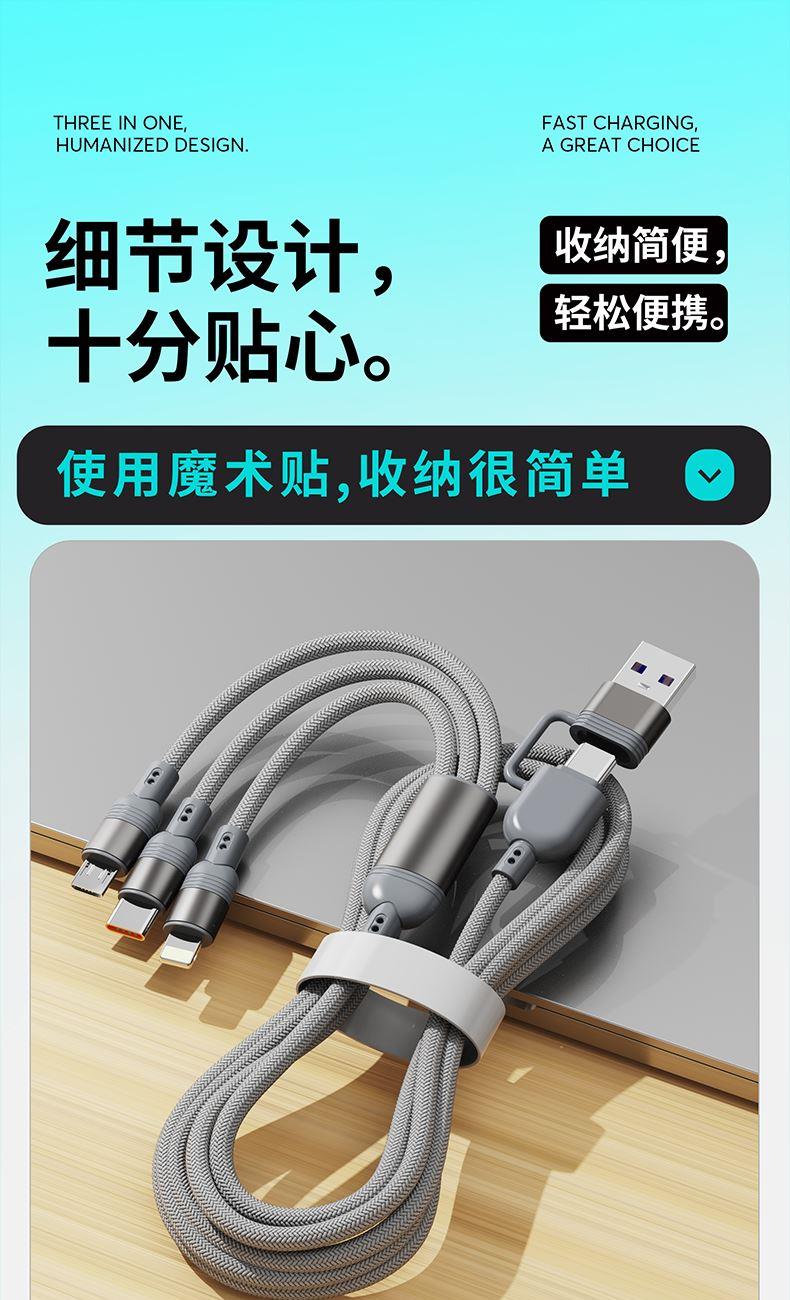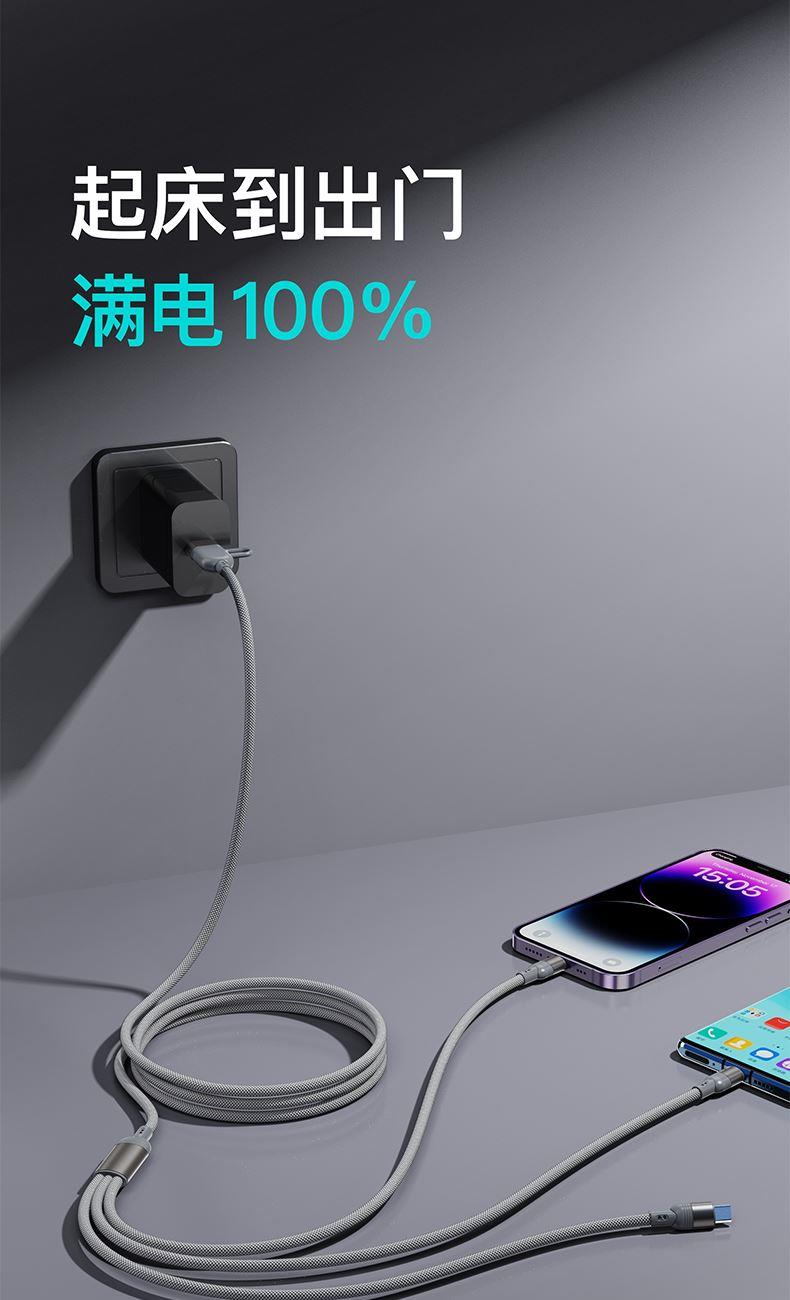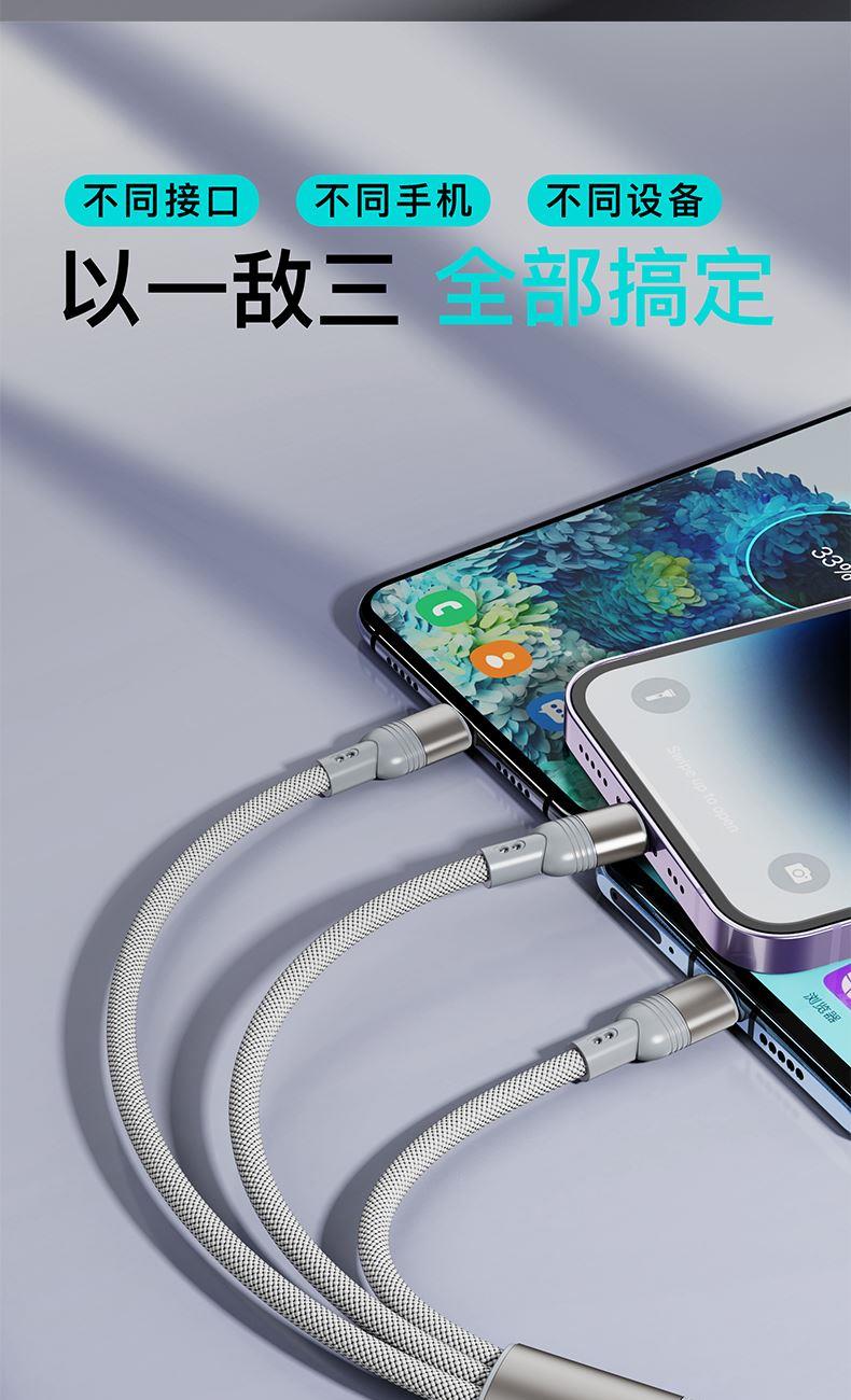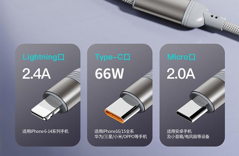 66W超级快充,充电更快 加粗编织线,一体成型充电头 二拖三设计,接口满足各种手机 1.2米长度设计,使用方便 编织线耐磨耐用,不易折断
