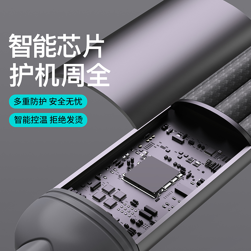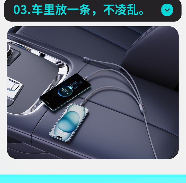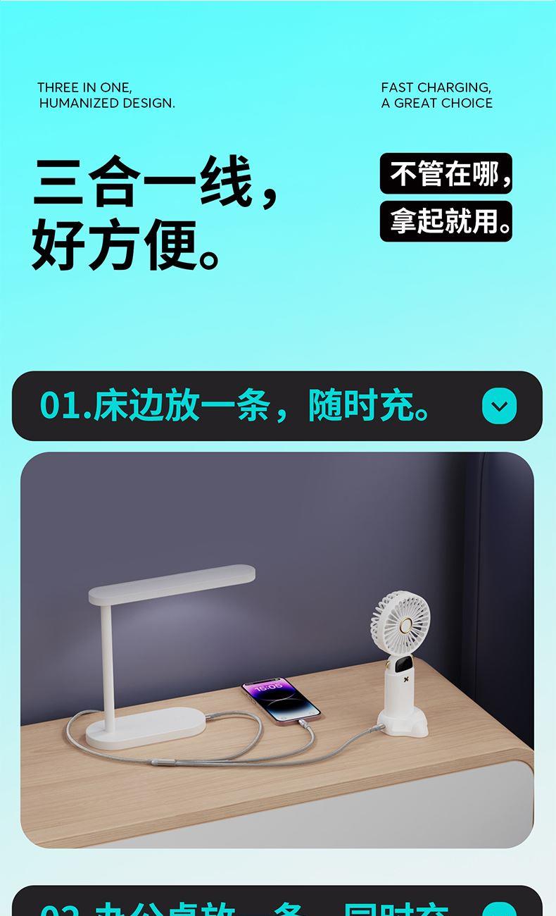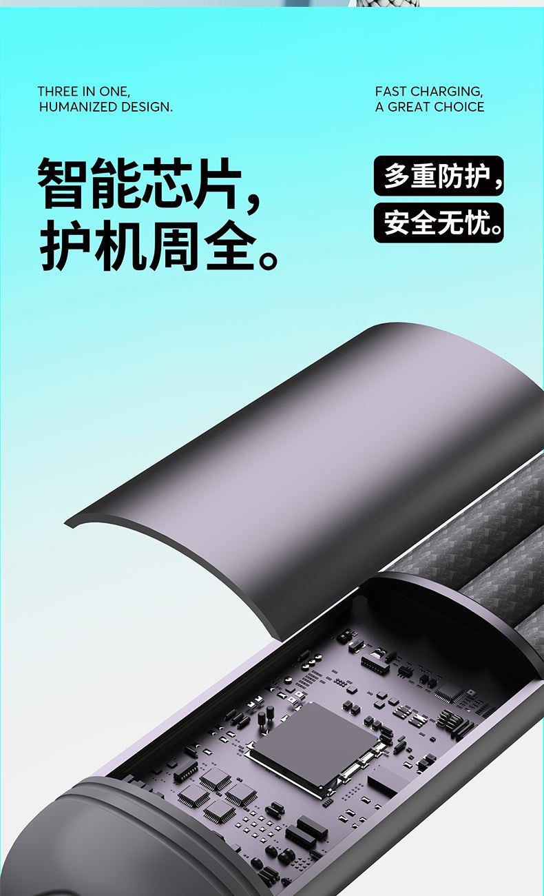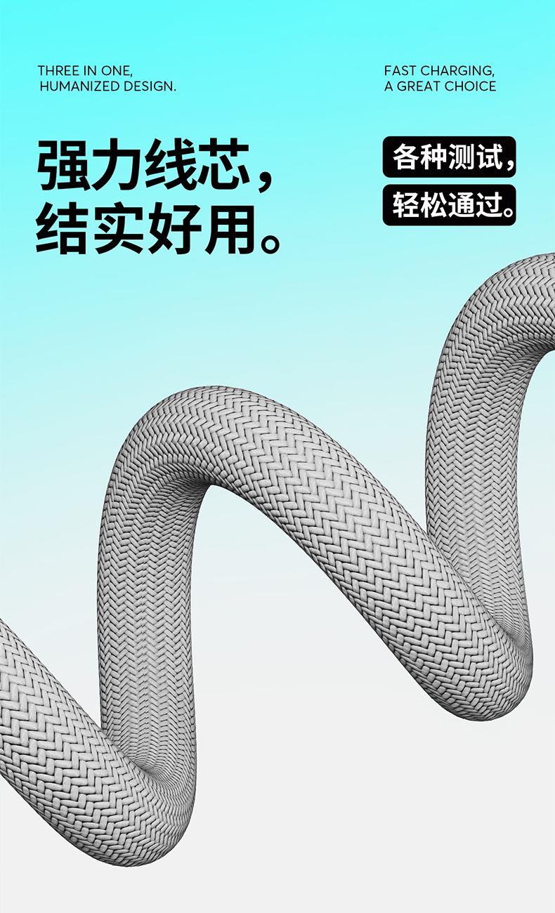 66W超级快充,充电更快 加粗编织线,一体成型充电头 二拖三设计,接口满足各种手机 1.2米长度设计,使用方便 编织线耐磨耐用,不易折断