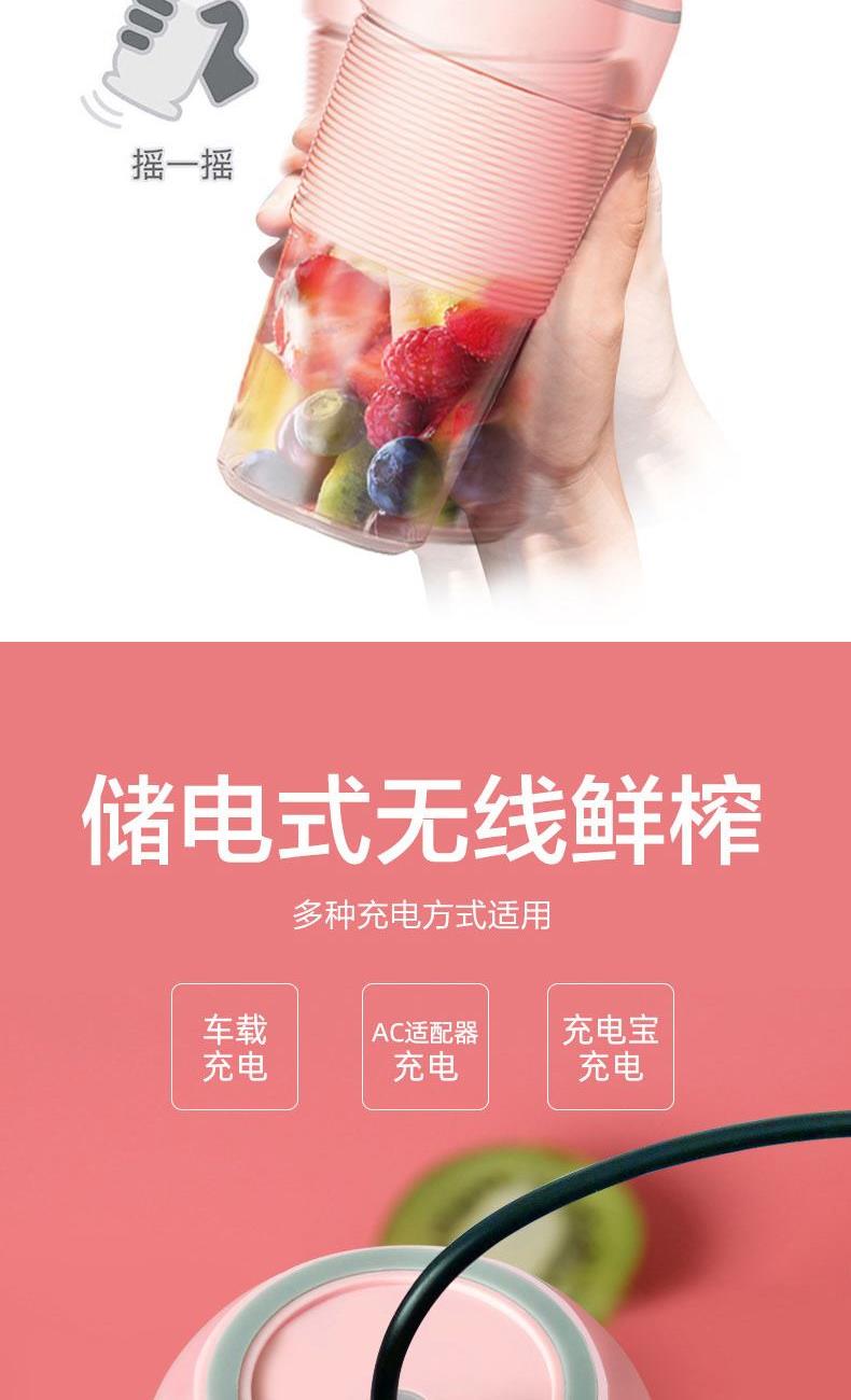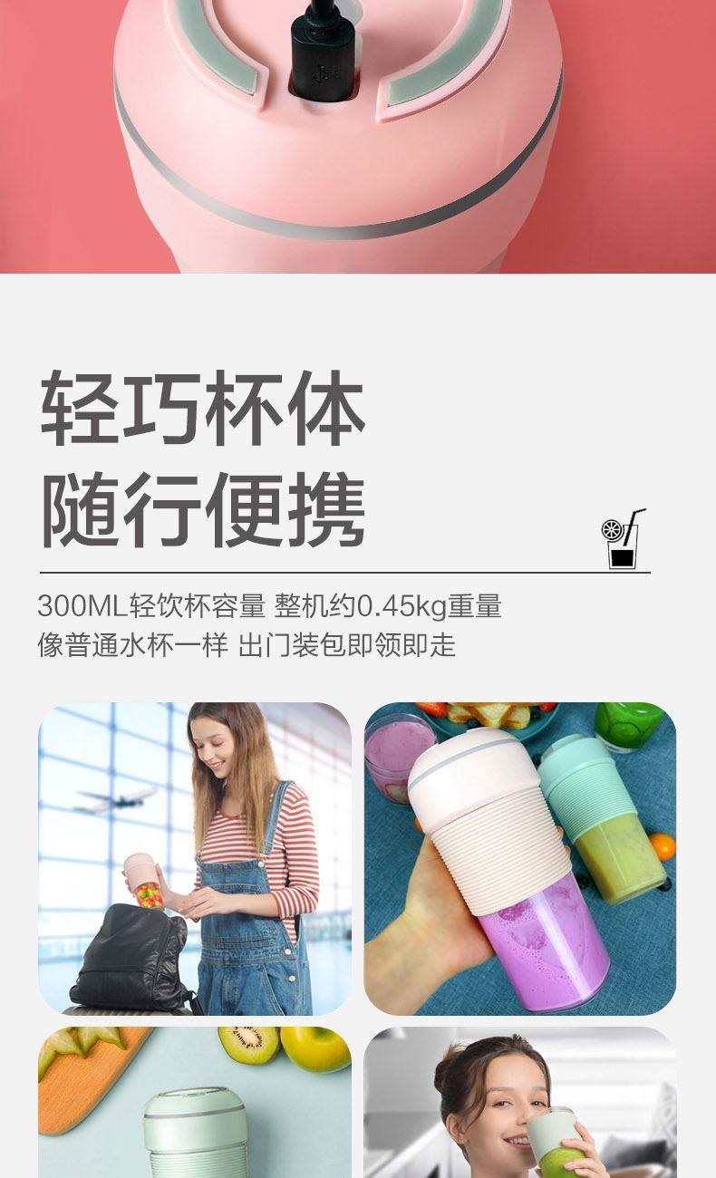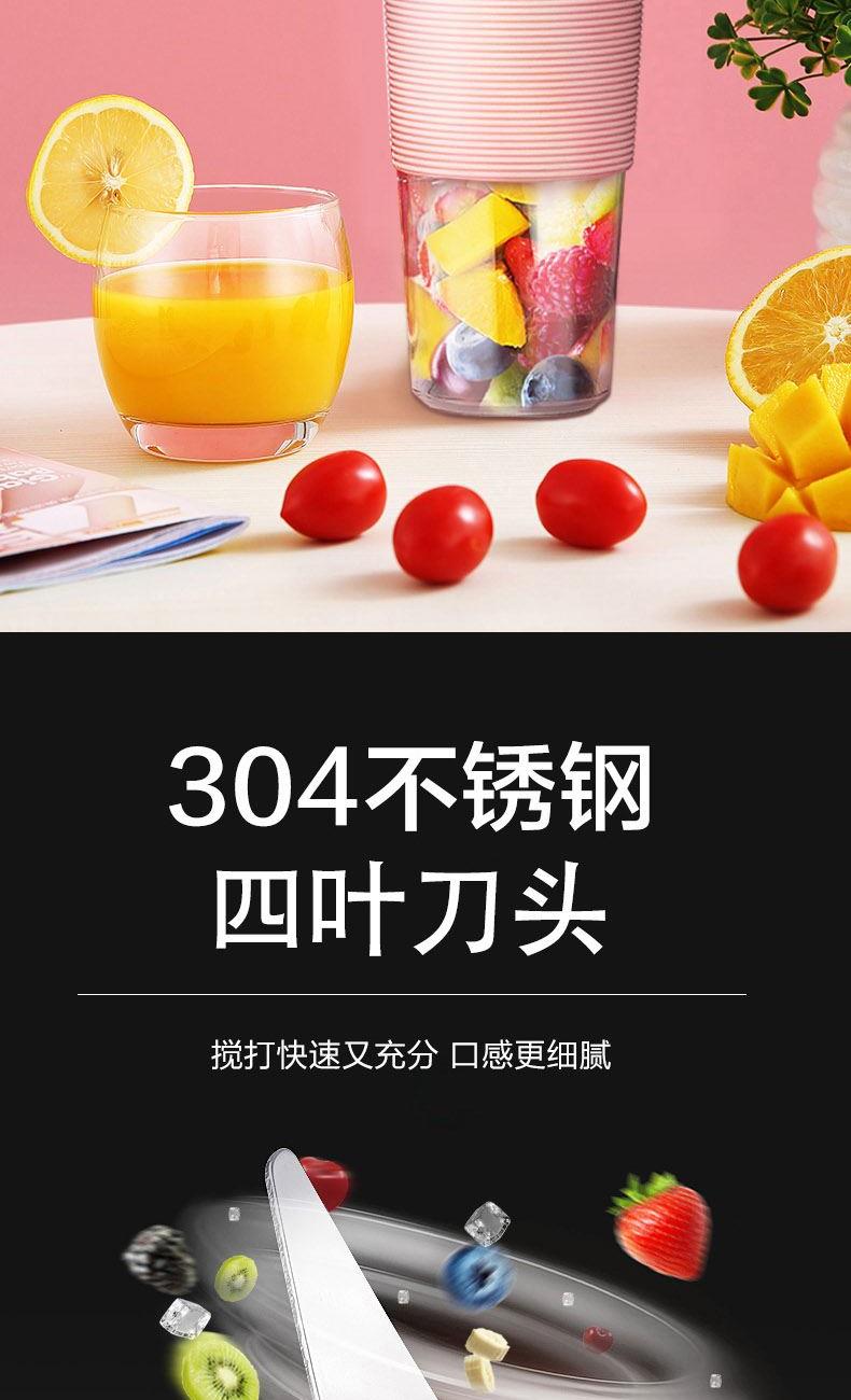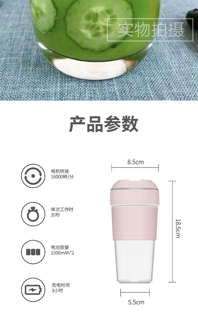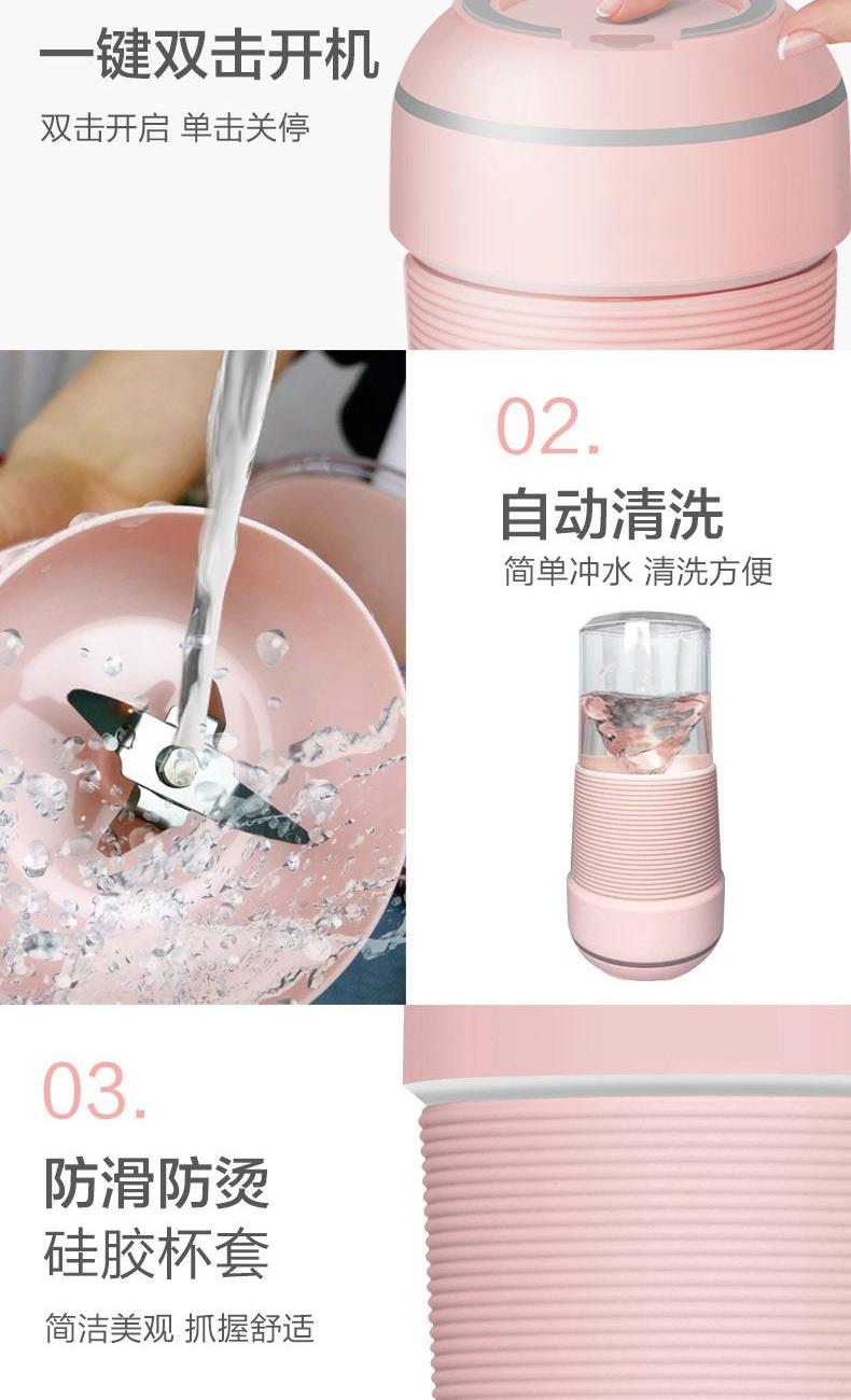 1.轻巧杯体随行便带,304不锈钢刀360°立体旋风无死角搅拌 2.USB便捷充电,3小时充电超长续航USB口充电不受限,3.1500mAh增压动力锂电池 4.无复杂刀组结构,只需简单冲洗即可打理干净 容量:300ML 颜色:粉色