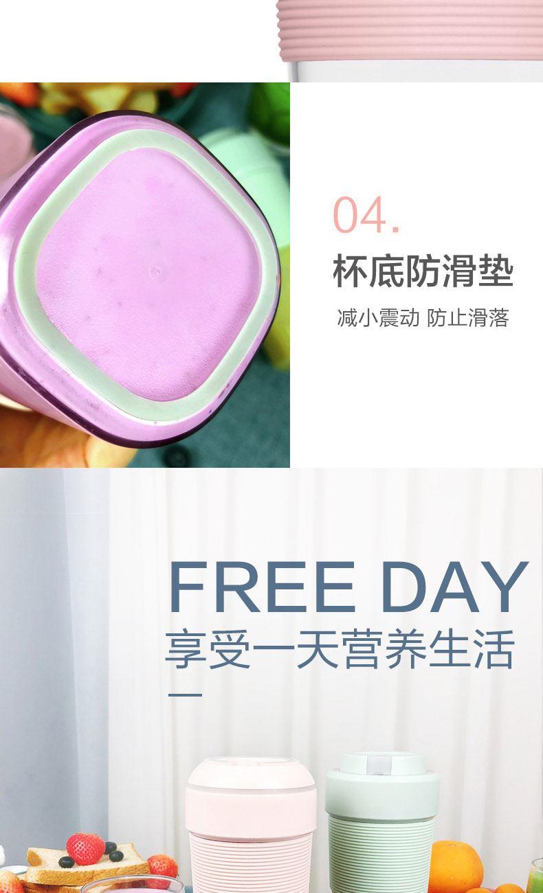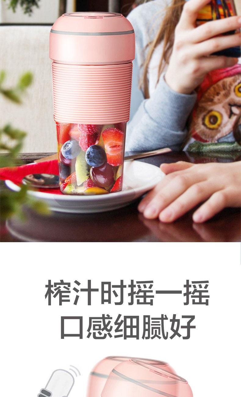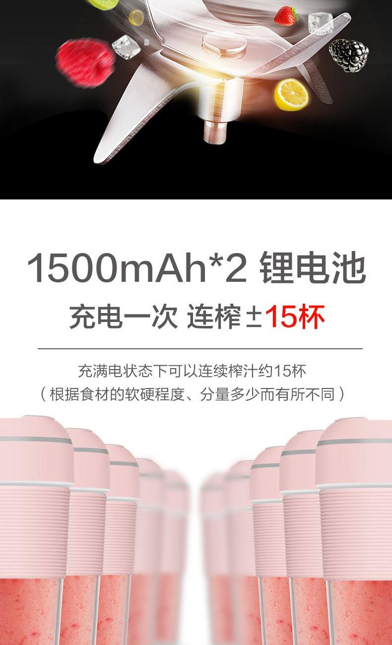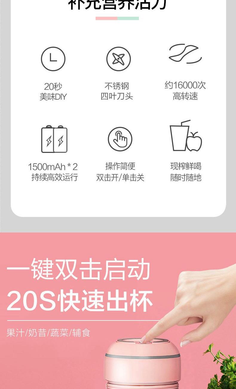 1.轻巧杯体随行便带,304不锈钢刀360°立体旋风无死角搅拌 2.USB便捷充电,3小时充电超长续航USB口充电不受限,3.1500mAh增压动力锂电池 4.无复杂刀组结构,只需简单冲洗即可打理干净 容量:300ML 颜色:粉色