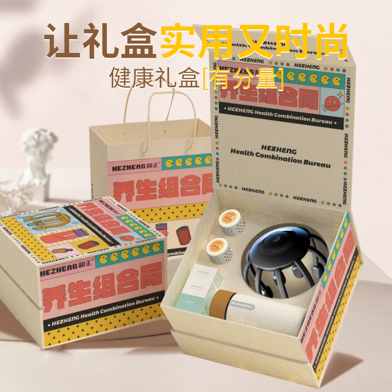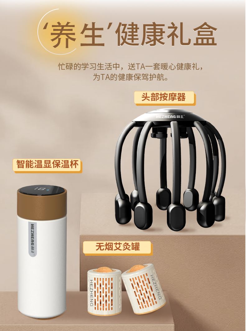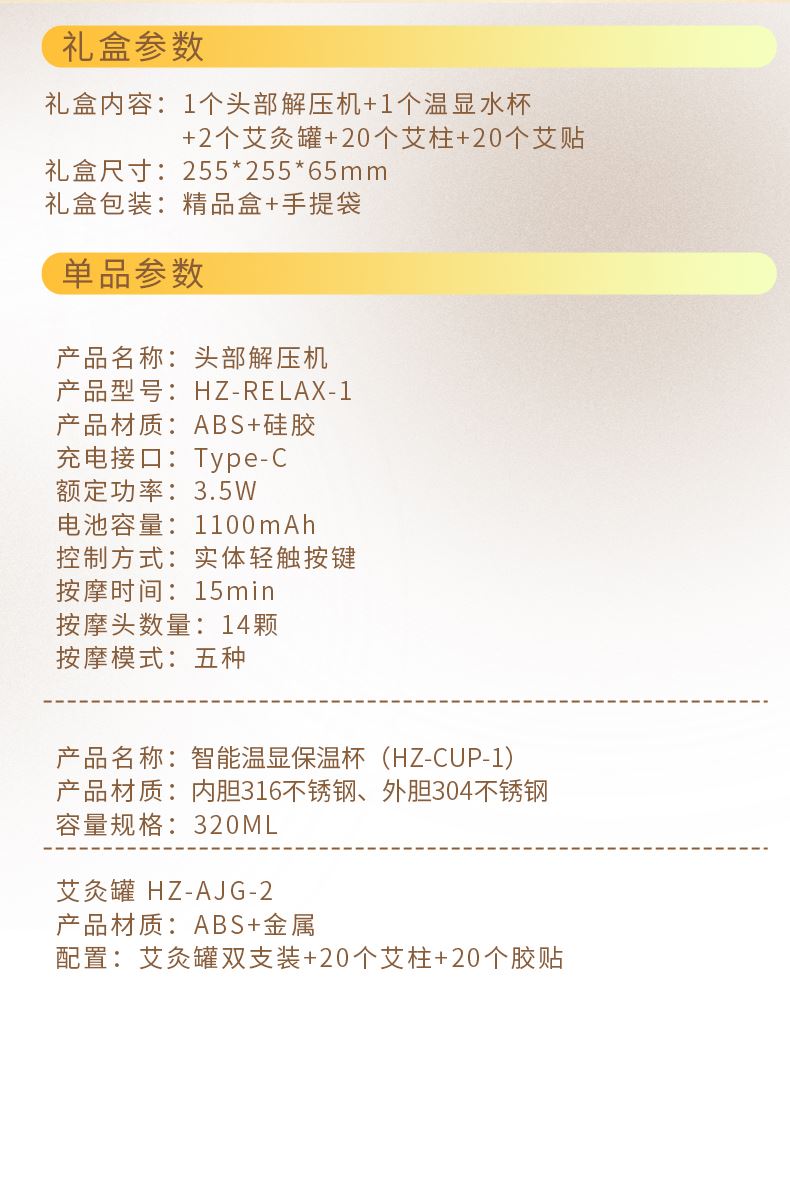 产品内容: 1个多维度头部解压机 +1个智能温显保温杯 +2个艾灸罐+20个艾柱+20个胶贴 包装尺寸:255×255×65mm 69码:6921311513703 包装方式:精品盒+手提袋 外箱尺寸:520*520*380mm 产品卖点: 这是一款组合式养生套装, 由1个多维度头部解压机 +2个艾灸罐+1个智能温显保温杯组成: