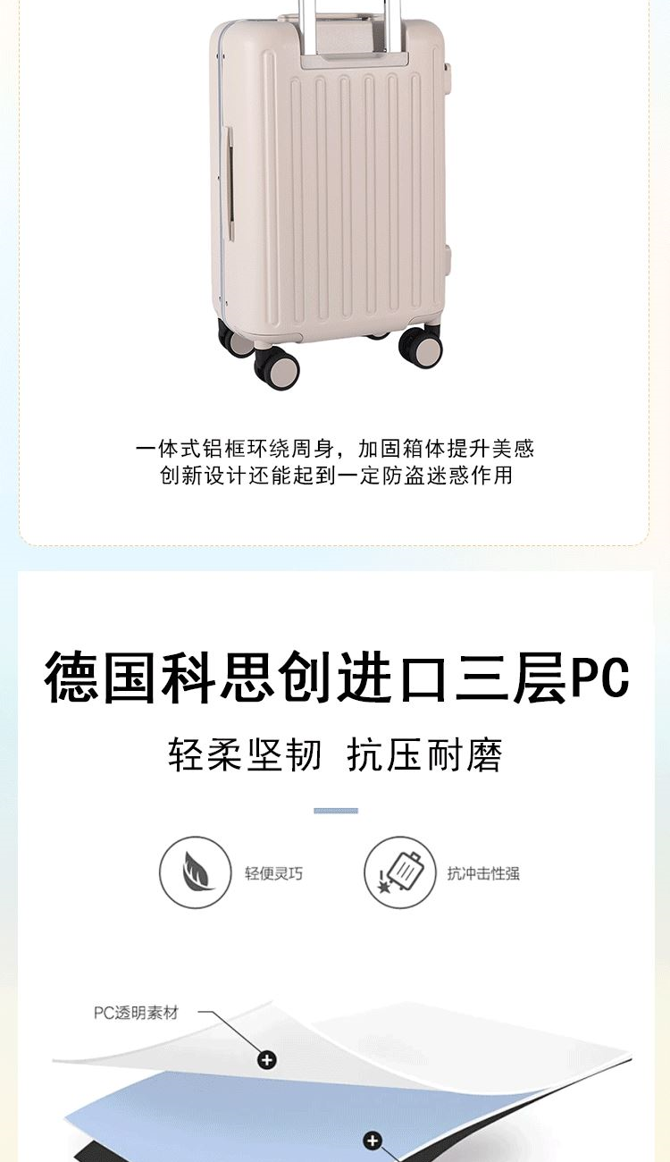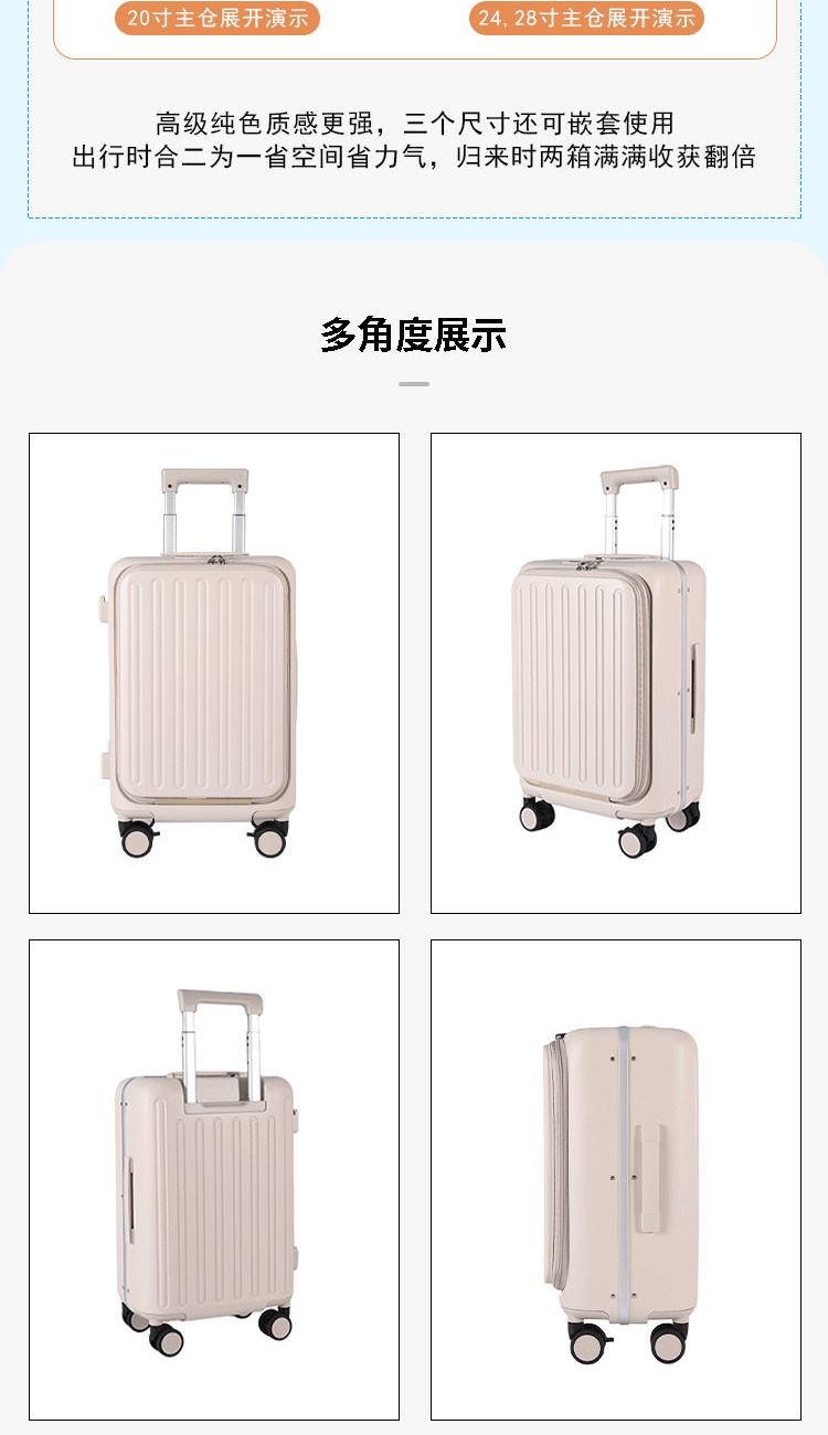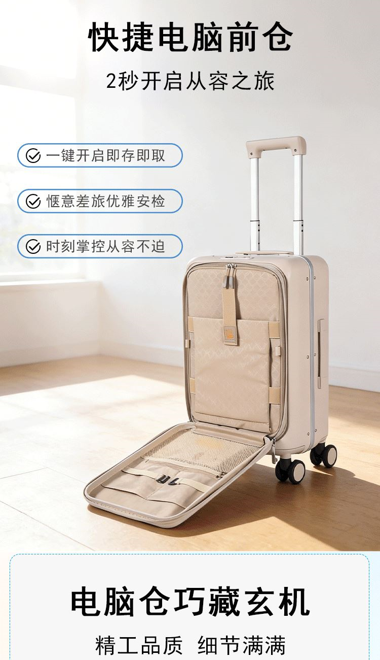 1、极简美学圆润设计,轮廓精致典雅靓丽 2、纯然同配色哑光工艺,自带轻奢质感 3、前置电脑快捷仓,随取随用从容办公快速安检 4、黄金1:9比例布局,科学释放近 99% 储物空间 5、浑然一体大深仓,多层分类归置尽享温度与安心 6、多处创新工艺暗藏巧思,贴心诠释移动出行助理