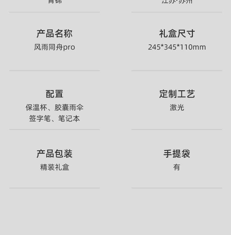 配置 名仕保温杯350ML*1 颜色:红色 坐标签字笔*1 颜色 红色/黑色 青马笔记本*1 颜色红色/白胶囊雨伞*1 手提袋套*1 精装礼盒手提袋*1 材质 保温杯:304钢 签字笔:金属 笔记本:皮革千越象牙白纸100克80张 雨伞:碰击布过黑胶 晴雨两用 可以遮阳 尺寸 笔记本:130*212mm 签字笔:141*10mm 雨伞:175*50mm 保温杯:200*60*60mm 礼盒:245*345*110mm