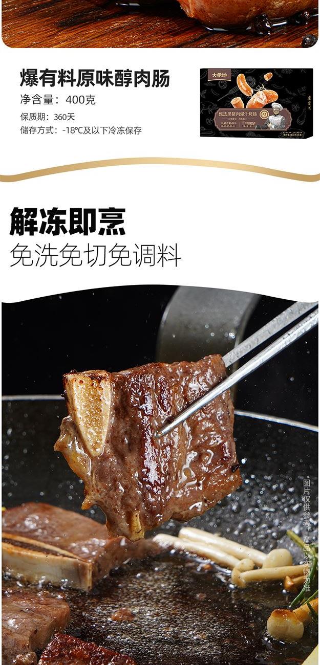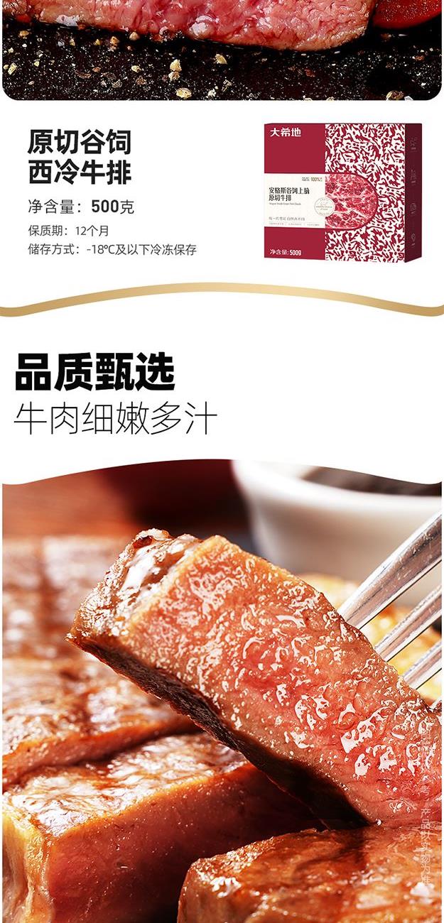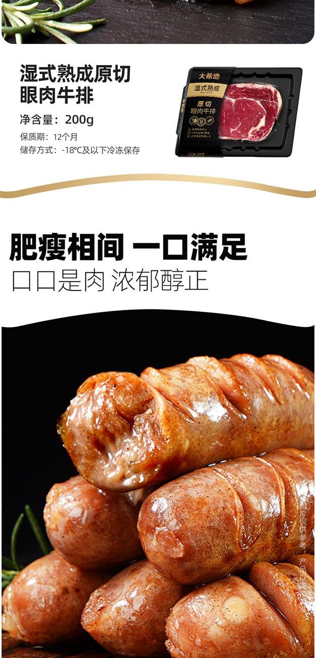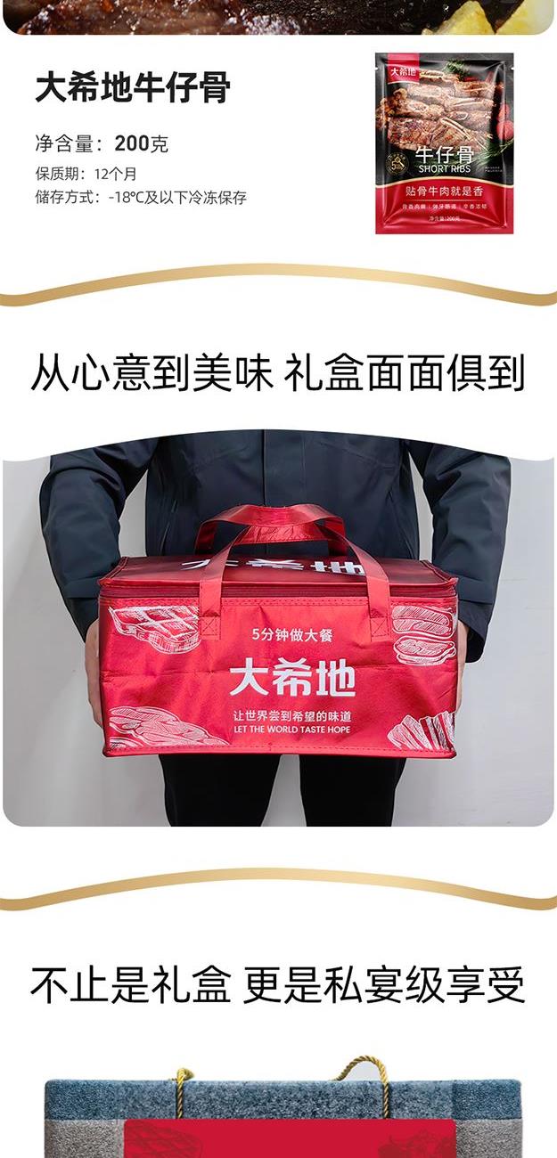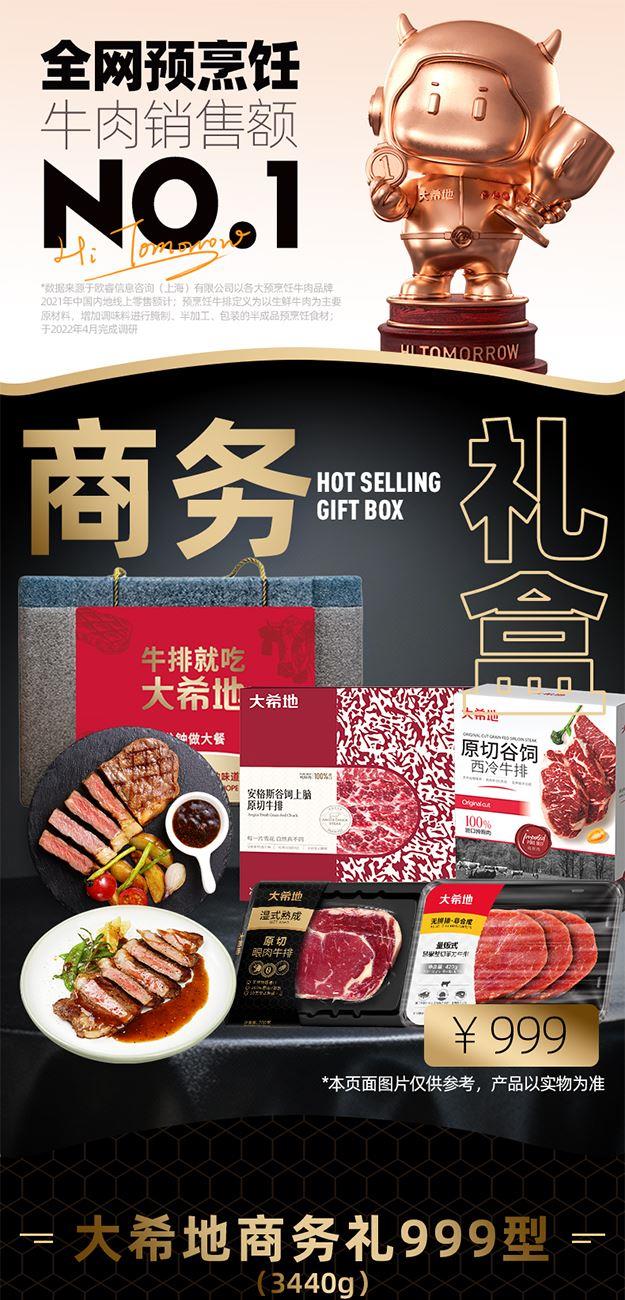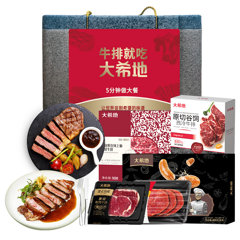 DXDSW-07 大希地商务礼999型 "大希地原切谷饲上脑牛排500g*1 大希地原切谷饲西冷牛排500g*1 大希地湿式熟成原切眼肉牛排200g*2 大希地量贩式黑椒整切菲力牛排420g*2 大希地甄选黑猪肉爆汁烤肠400g*2 大希地牛仔骨200g*2 精美刀叉一副 精美刀叉一副"