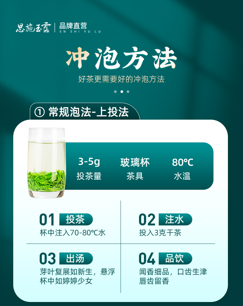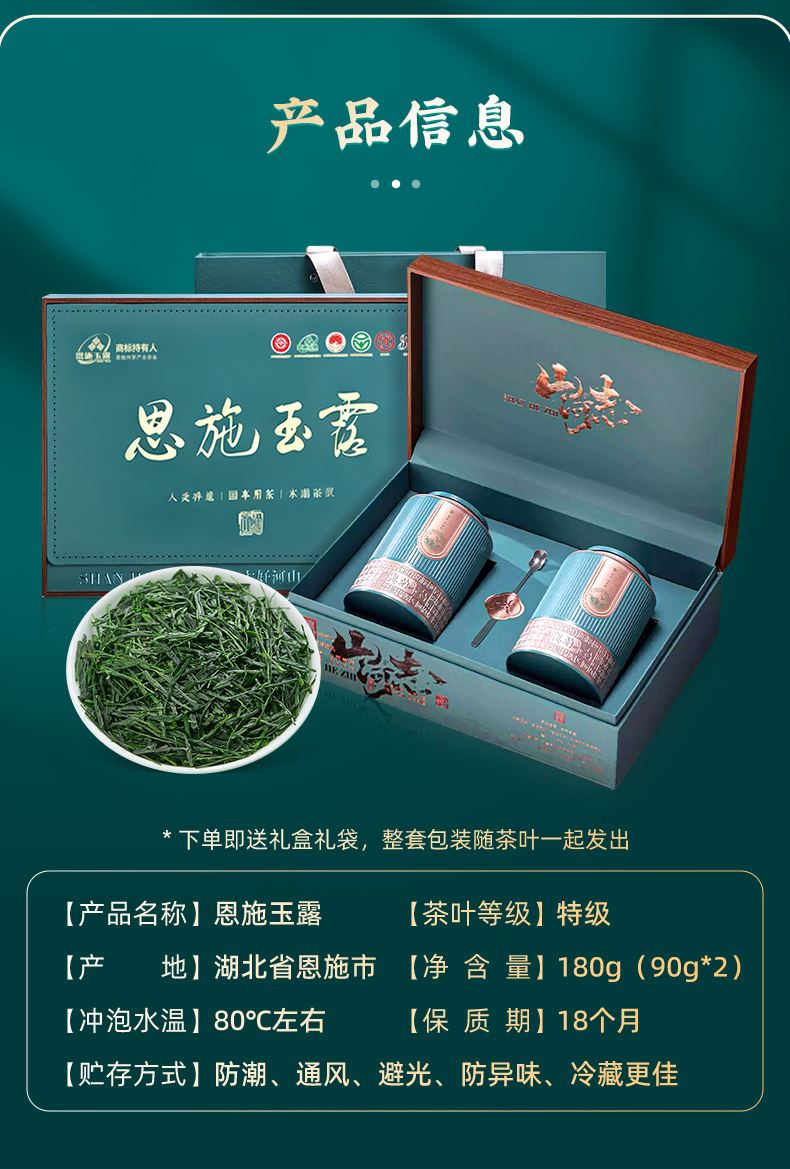 【茶叶等级】特级 【产地】湖北省恩施市 【净 含 量】180g(90g*2) 【冲泡水温】80℃左右 【保 质 期】18个月 【贮存方式】防潮、通风、避光、防异味、冷藏更佳 卖点: 1、京东自营评论数2w+,京东热销礼盒爆款 2、“世界硒都” 黄金产茶带天然含硒 3、开园头采,特级甄选,优中选优 4、采用非遗蒸青工艺,很大程度保留茶叶的叶绿素、氨基酸等天然物质,形成 “干茶翠绿、茶汤嫩绿、叶底鲜绿” 的 “三绿” 独特风貌。 5、干茶紧细圆直、色泽翠绿油润;冲泡后茶汤嫩绿明亮,入口鲜爽清甜,栗香与山野清香交织弥漫,汤体细腻顺滑无涩感,回甘悠长且带有天然甜润感 6、华美精致礼盒包装尊雅大气,内含2罐,共180克,适合商务,待客,送礼