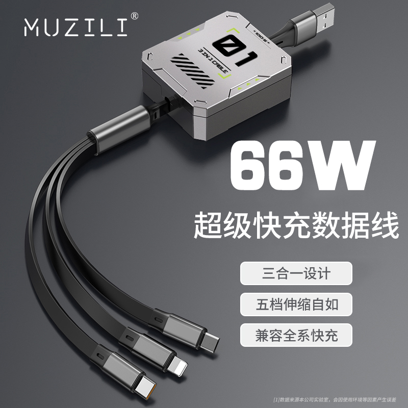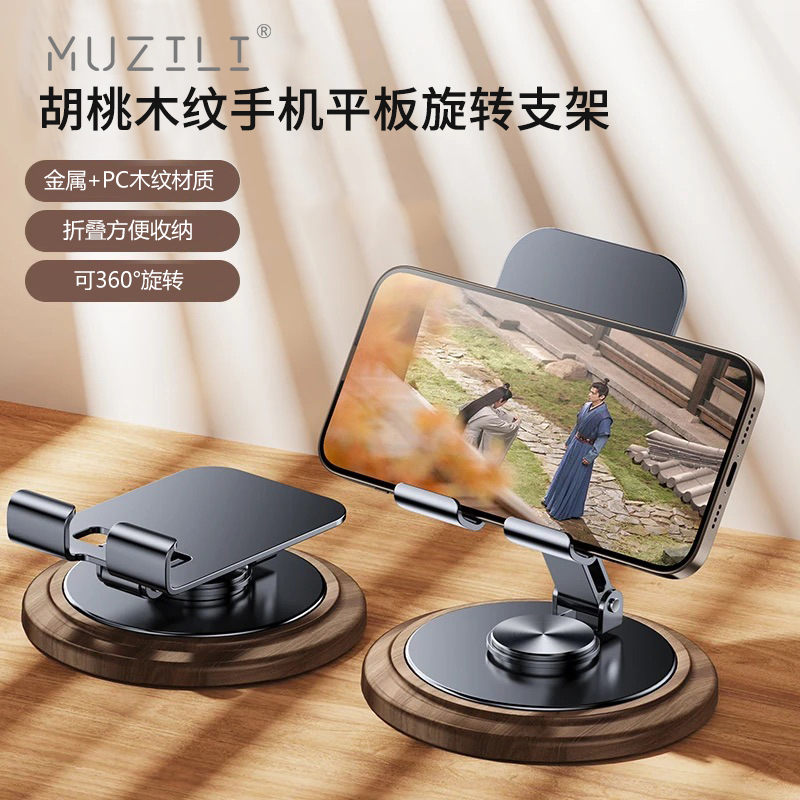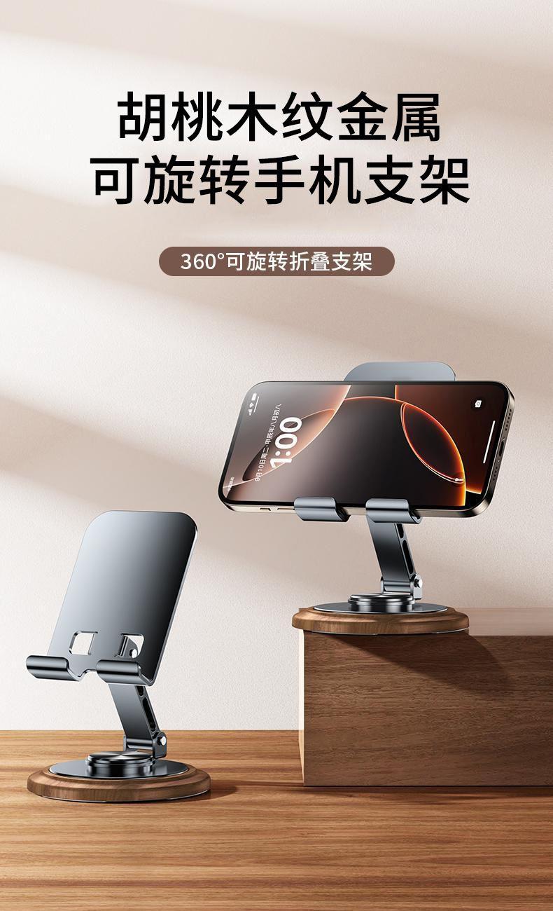 1、商务款手机平板桌面旋转支架 仿黑胡桃木纹 商务大气 360°可旋转金属支架 支撑力强劲,预留充电口位 2、66W超级快充一拖三伸缩数据线 兼容苹果15系列 五档伸缩调节 1.2米长度设计 TPE材质经久耐用 三种充电接口满足各种手机