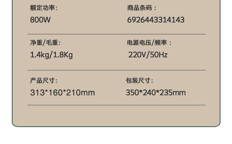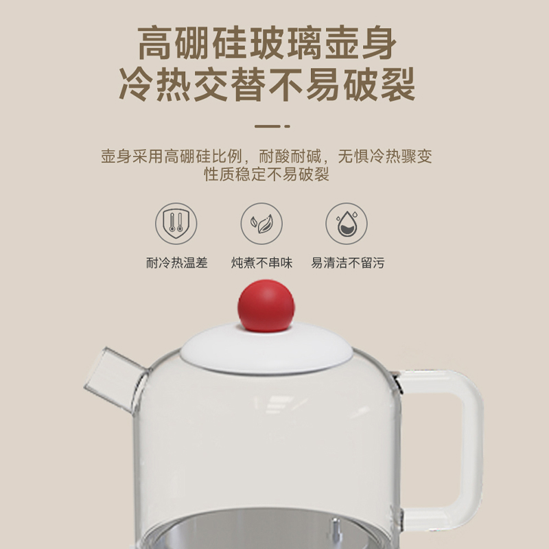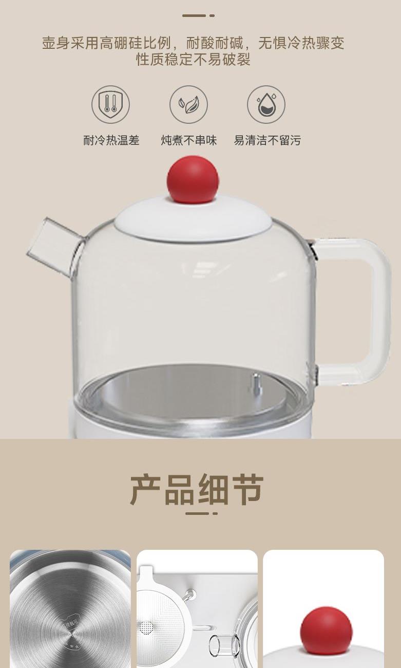 额定电压:220V~ 额定功率:800W 额定频率:50Hz 容 量:0.9L 功能:烧水、黑茶、普洱、乌龙、绿茶、红茶花茶、保温 多档控温、8种模式、暖杯设计,触控面板控温,多种模式满足不同需求 加厚高硼硅玻璃,耐高温耐冷热交替,经久耐用 不锈钢滤茶网,无异味,不易生锈 食品级PP塑料,无毒无味,安心使用
