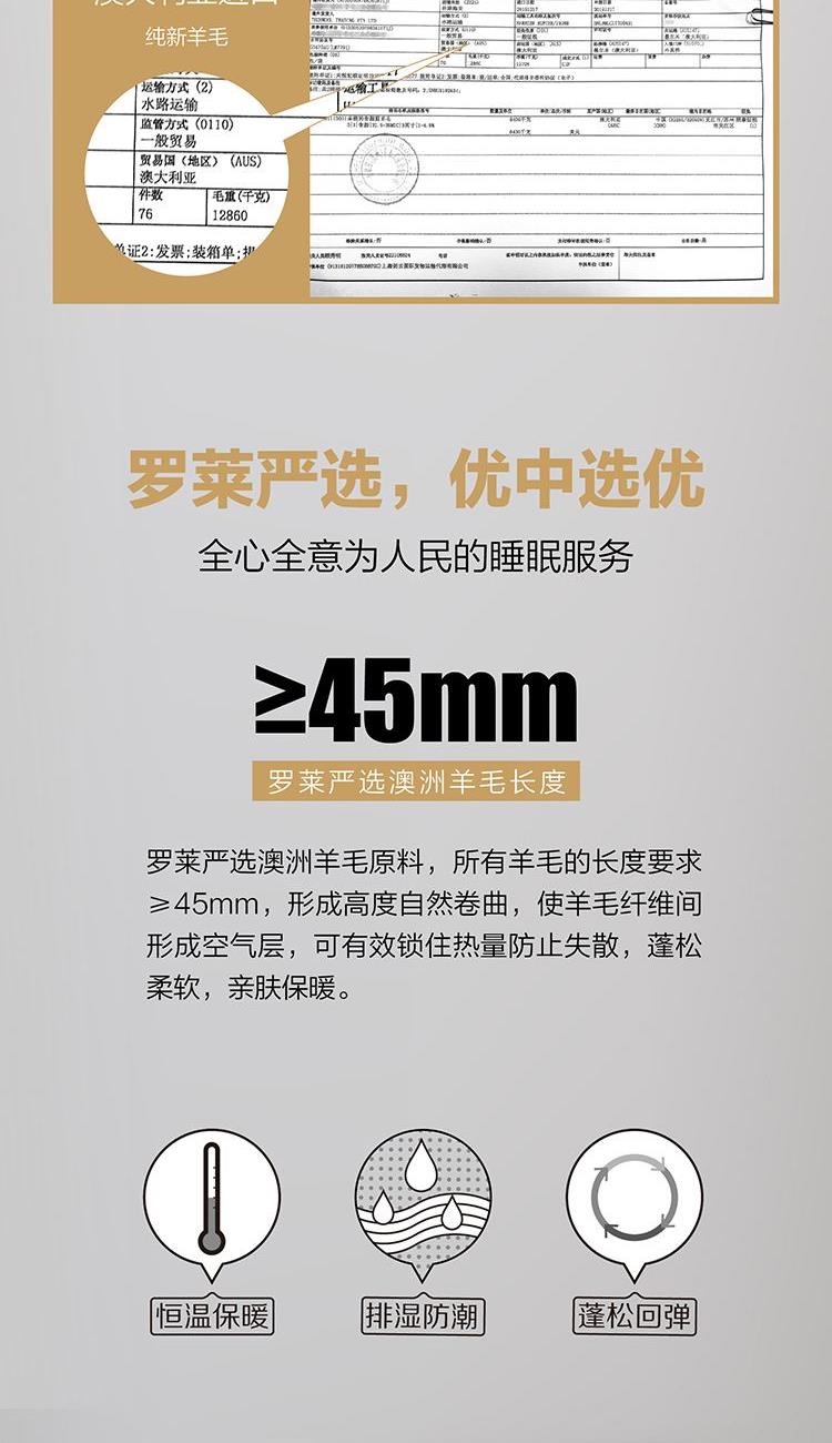 填充物精选澳大利亚羊毛填充,澳毛是国际公认的高质羊毛,羊毛的长度,白度以及重量、柔软度、强度、耐用性和外观持久性方面均较为出色,毛质柔软细腻,吸湿能力强,恒温保暖,天然回弹性佳;并对白色念珠菌、大肠杆菌、金黄色葡萄球菌,有明显的抑制效果。