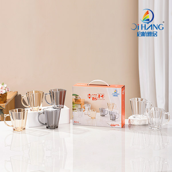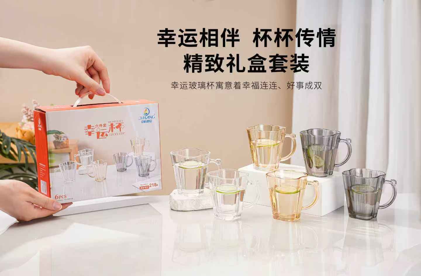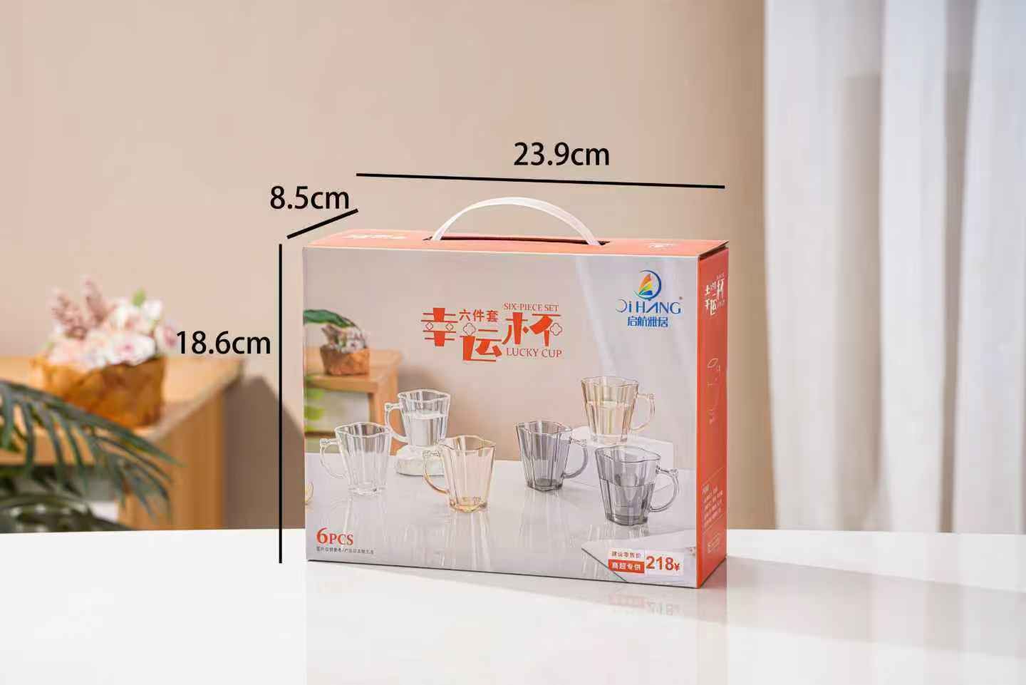 型号:幸运把杯六件套{离子镀) 货号:XYB-L6 配置:200ML*6 尺寸:口径8.4CM/杯高8.8CM 材质:高白料玻璃防烫把手杯,将文化气息融入产品中,给消费者不一样的视觉体验,器皿容积大小适中,实用方便,是促销、商务、会议和福利礼品。