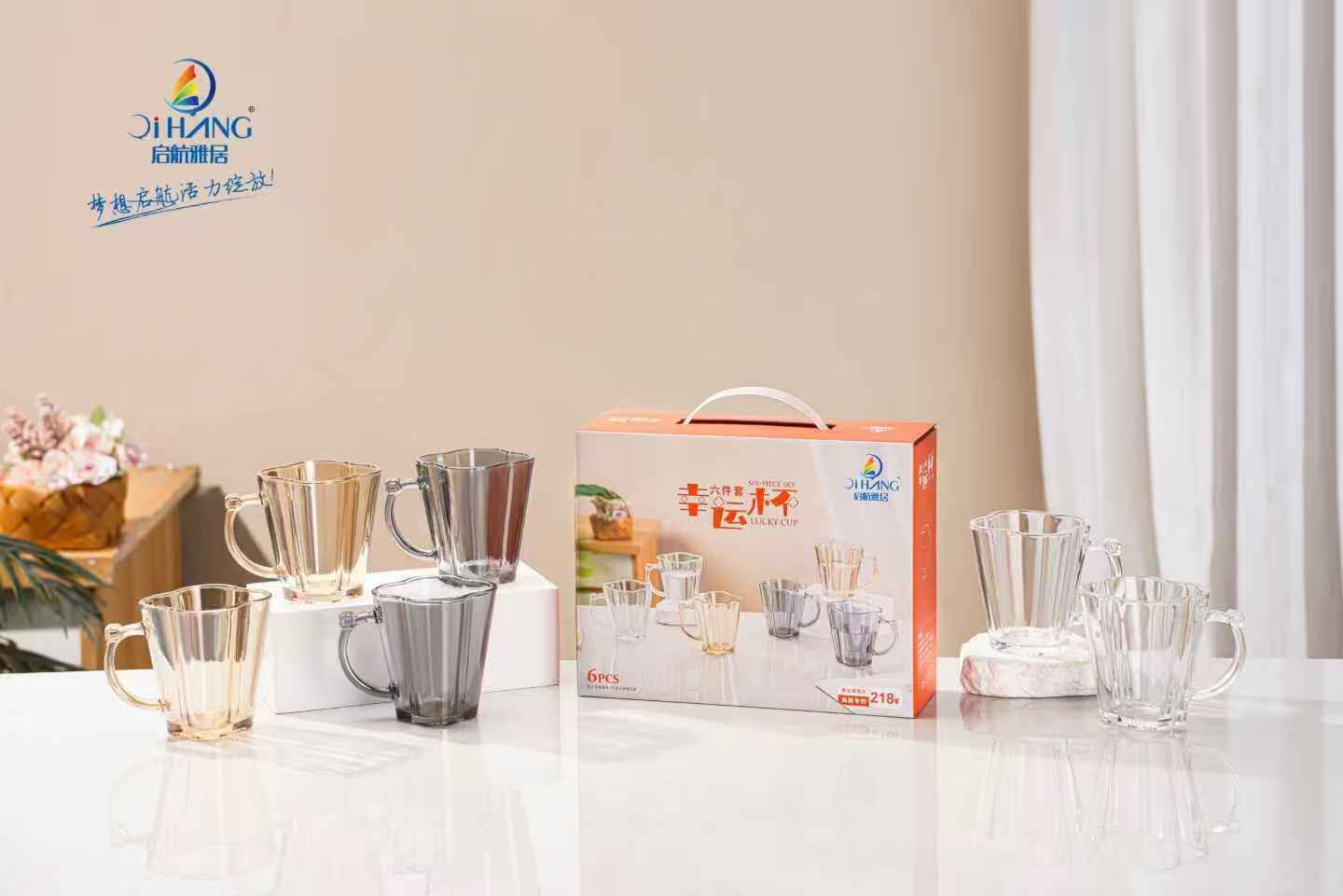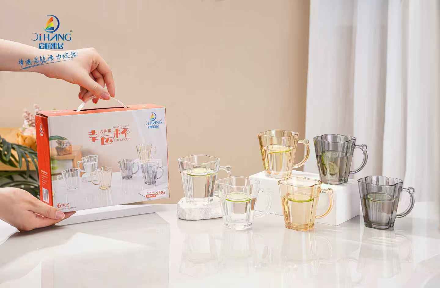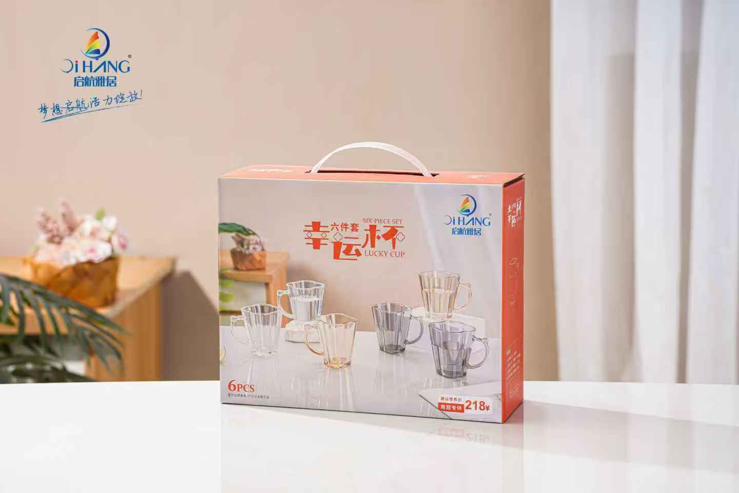 型号:幸运把杯六件套{离子镀) 货号:XYB-L6 配置:200ML*6 尺寸:口径8.4CM/杯高8.8CM 材质:高白料玻璃防烫把手杯,将文化气息融入产品中,给消费者不一样的视觉体验,器皿容积大小适中,实用方便,是促销、商务、会议和福利礼品。