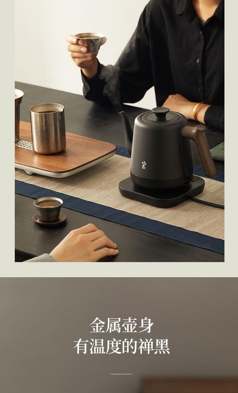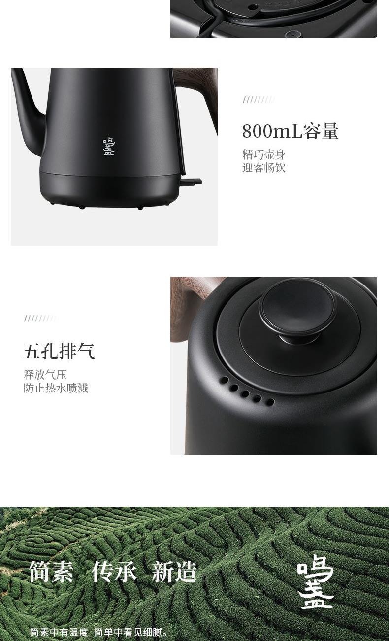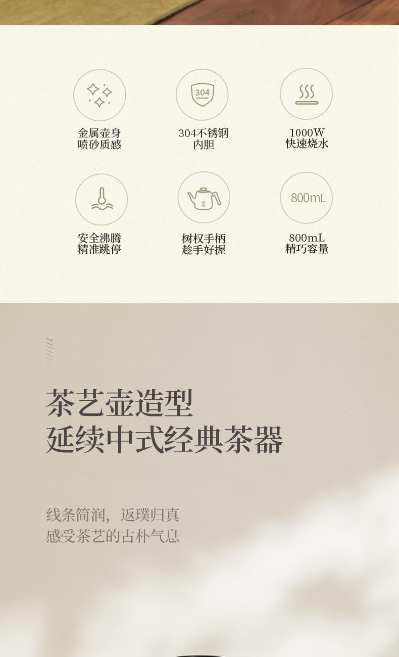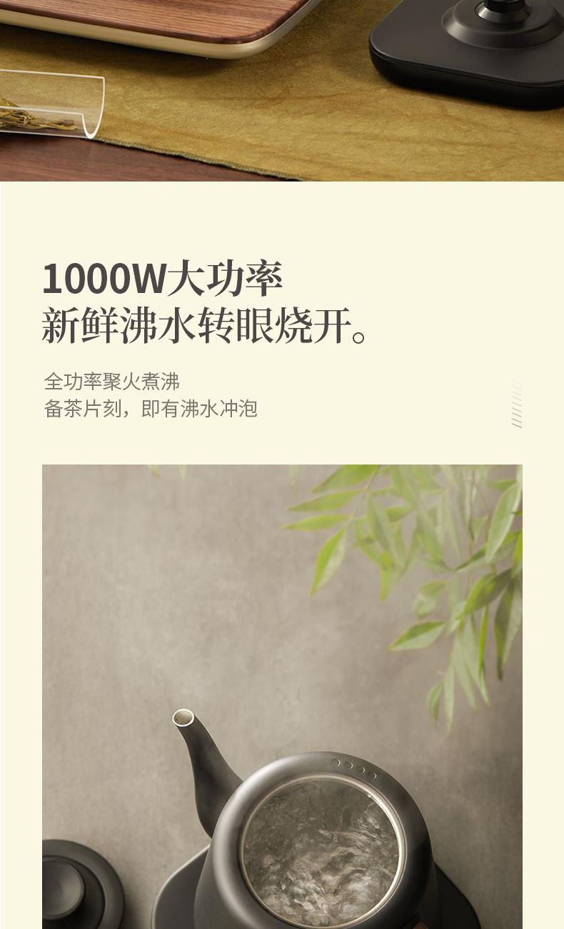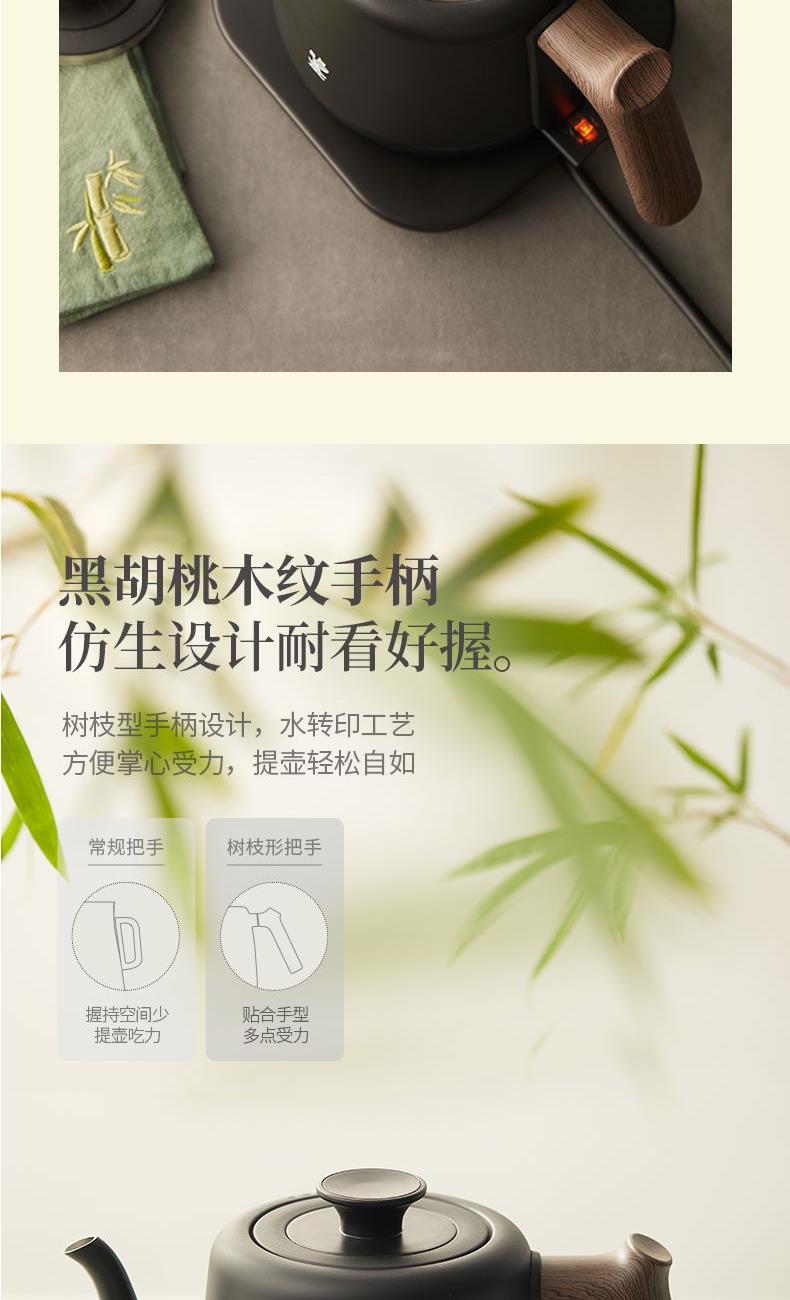 电源:220V~50Hz 额定功率:1000W 产品容量:800mL 产品颜色:禅黑 产品尺寸:产品230Lx155Wx186H / 彩盒260Lx240Wx196H / 邮购盒274Lx250Wx214H 产品重量:产品净重0.78kg / 邮盒毛重1.44kg 材质:304不锈钢、硅胶、ABS 标准配件:壶盖、壶体、底座 一把趁手的电水壶,经典禅黑的外观,专为冲泡设计。延续经典的茶艺壶造型,采用304不锈钢金属壶身,树枝型手柄采用木纹水转印工艺,放茶桌上更有质感,提升茶艺氛围。800mL的容量,搭配1000W大功率,内置英国Strix温控器,烧水速度快。简化复杂的功能,煮沸后自动跳停,是兼顾质感与性价比之选。