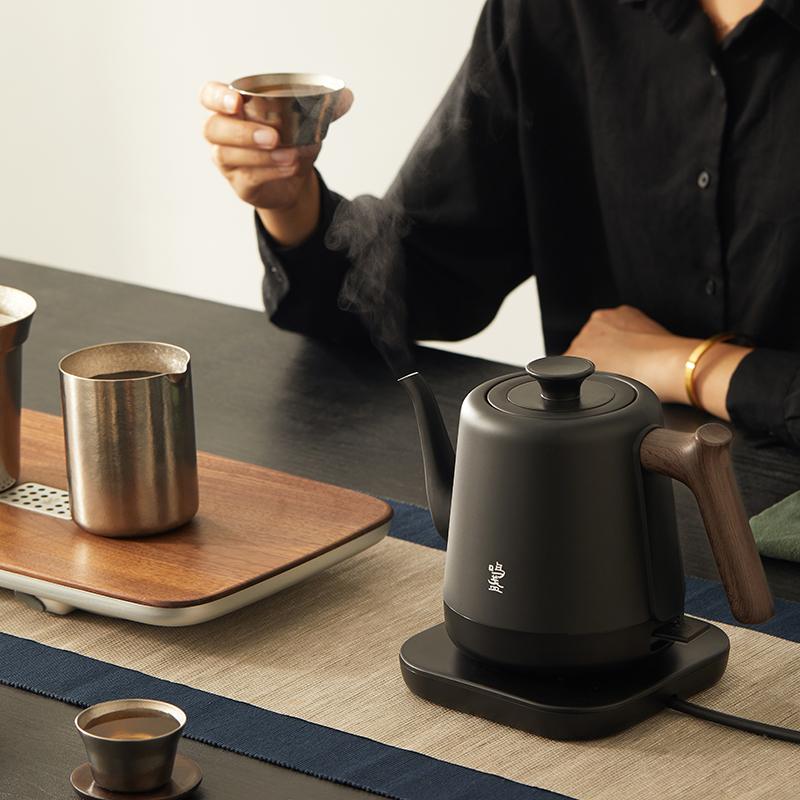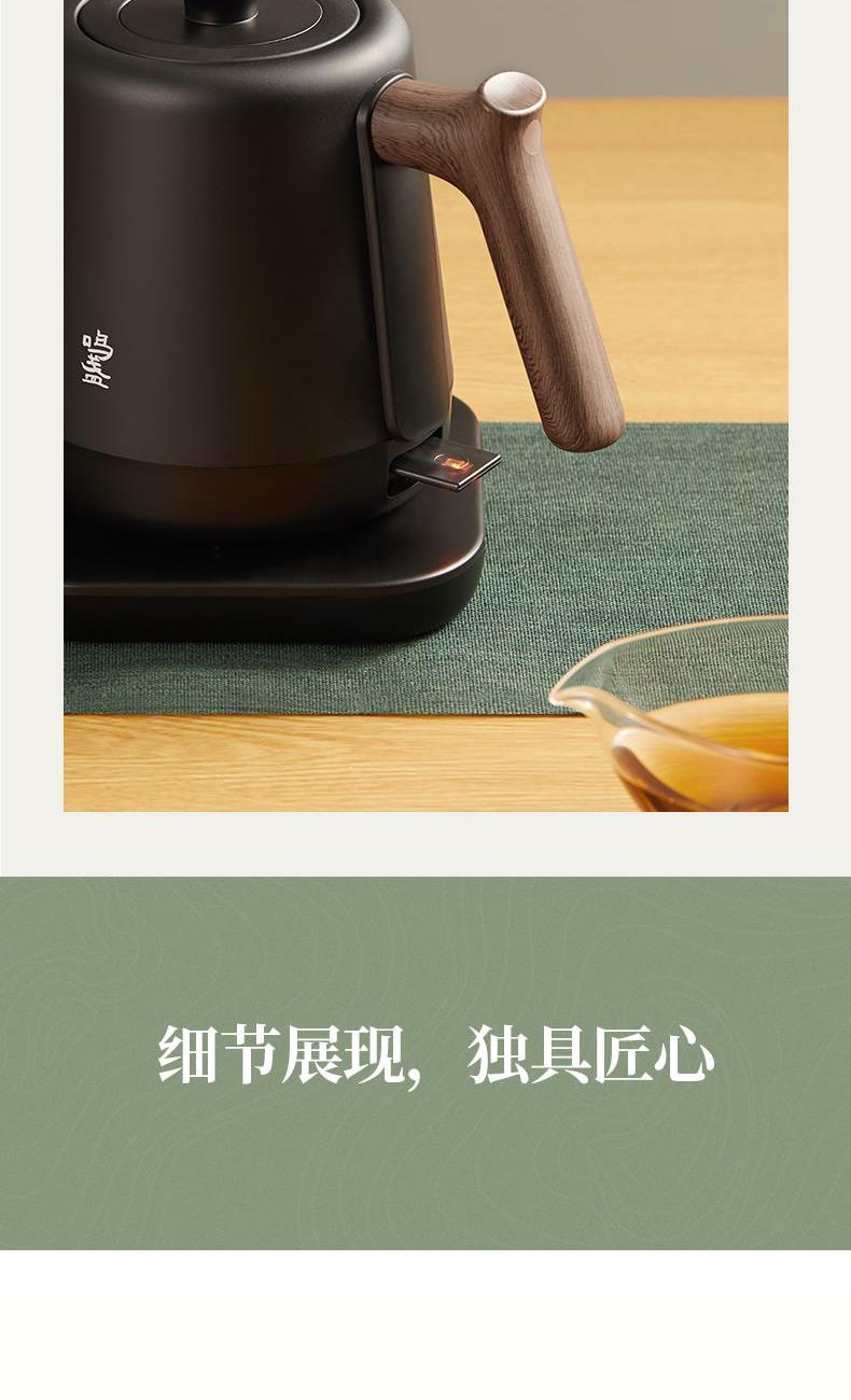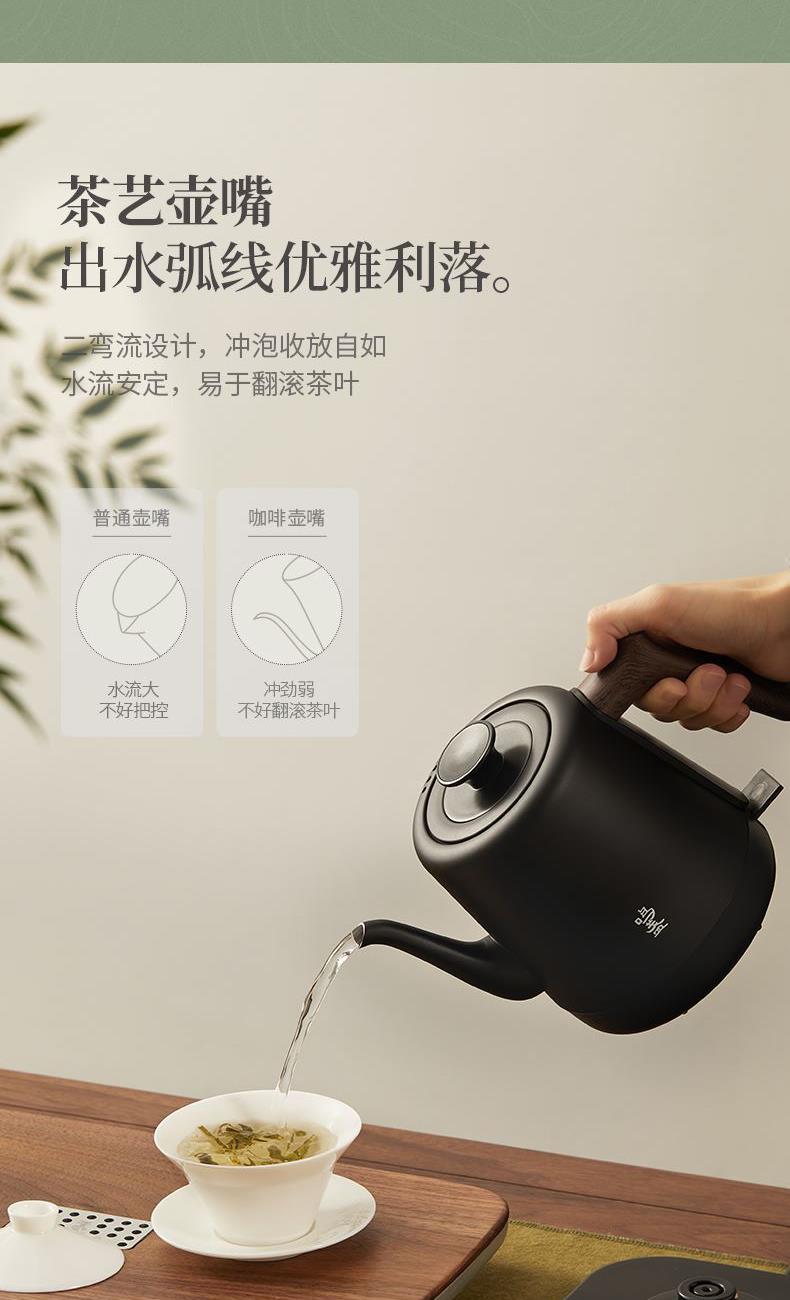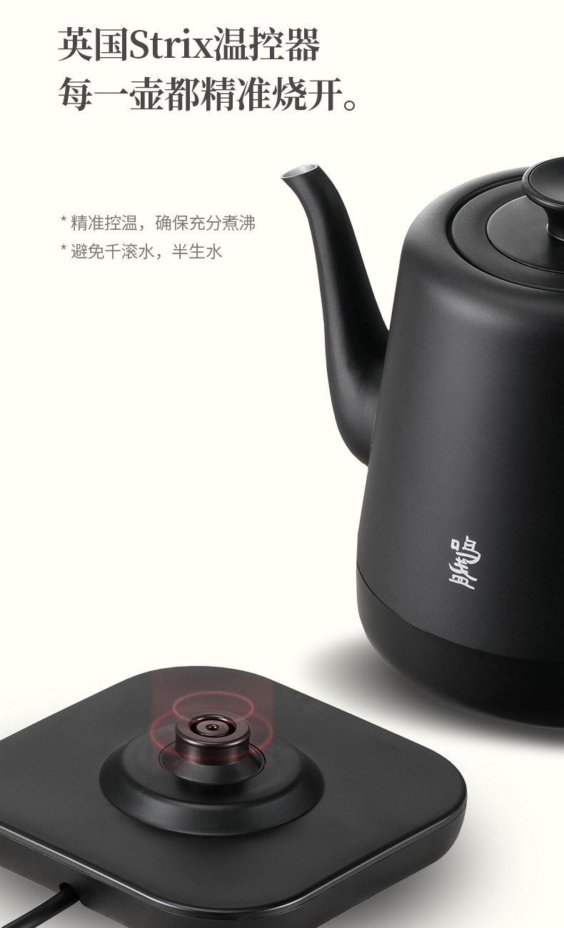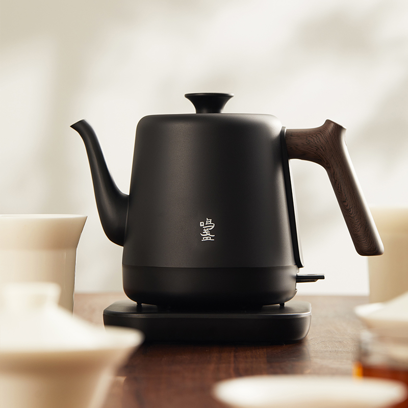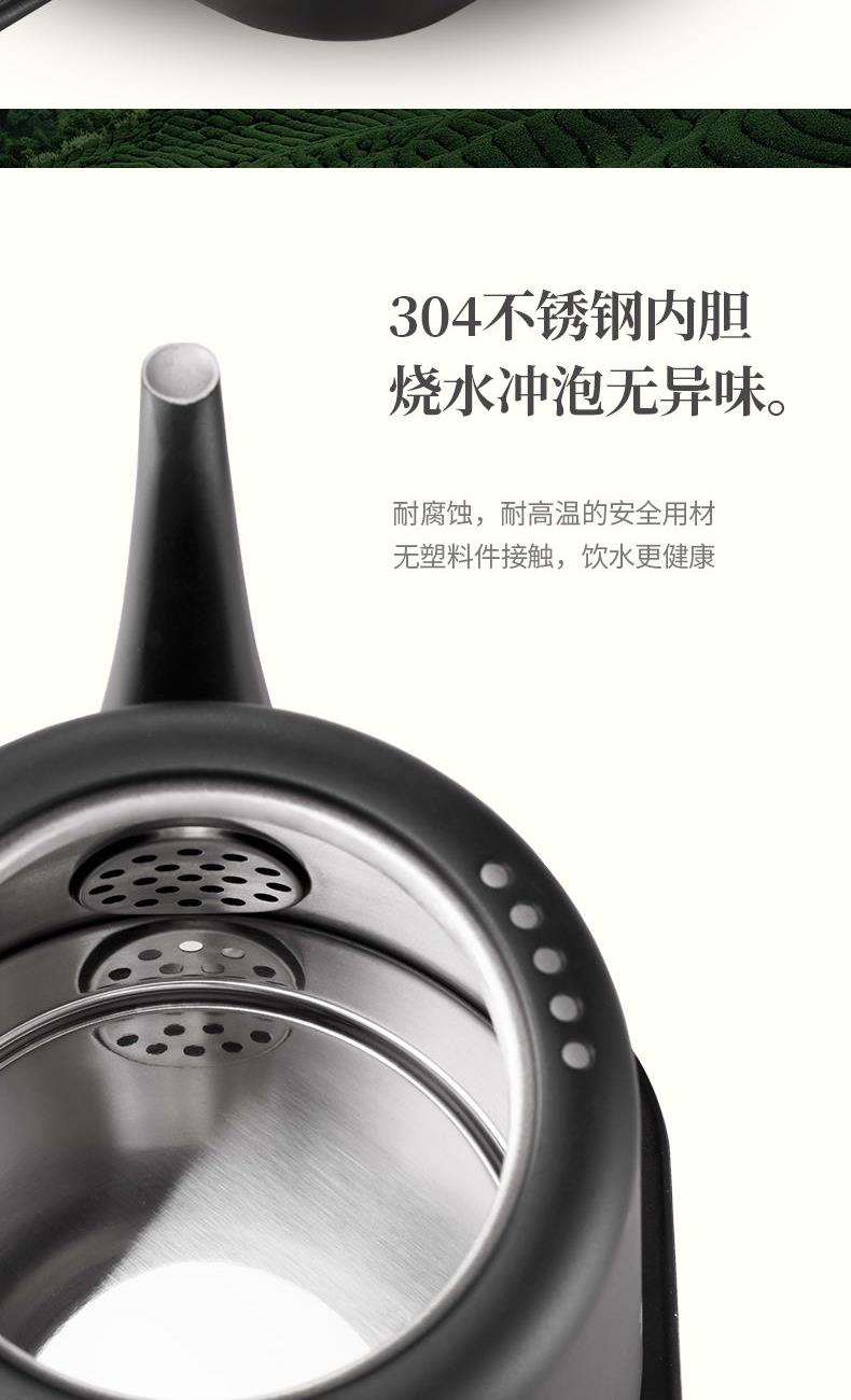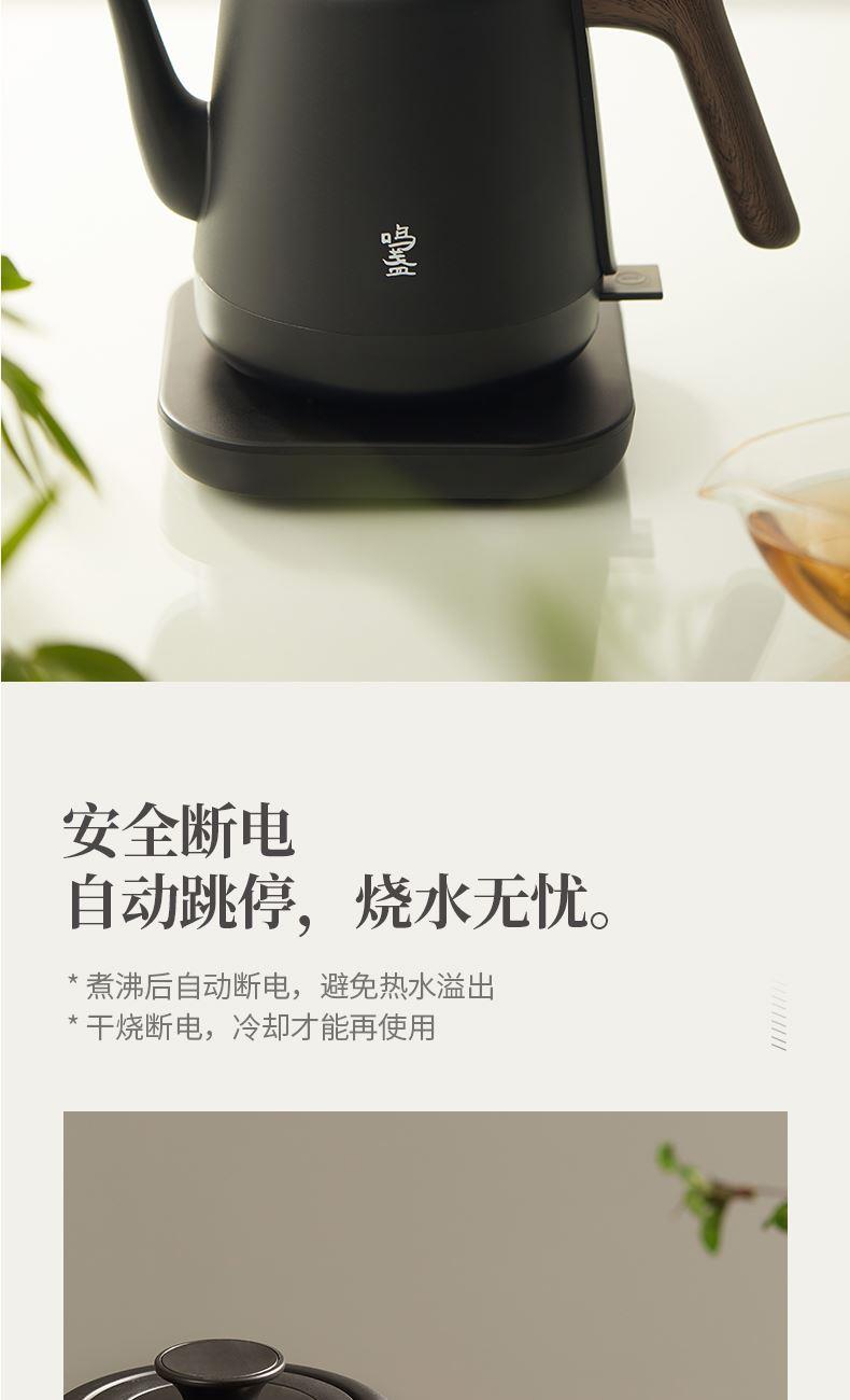 电源:220V~50Hz 额定功率:1000W 产品容量:800mL 产品颜色:禅黑 产品尺寸:产品230Lx155Wx186H / 彩盒260Lx240Wx196H / 邮购盒274Lx250Wx214H 产品重量:产品净重0.78kg / 邮盒毛重1.44kg 材质:304不锈钢、硅胶、ABS 标准配件:壶盖、壶体、底座 一把趁手的电水壶,经典禅黑的外观,专为冲泡设计。延续经典的茶艺壶造型,采用304不锈钢金属壶身,树枝型手柄采用木纹水转印工艺,放茶桌上更有质感,提升茶艺氛围。800mL的容量,搭配1000W大功率,内置英国Strix温控器,烧水速度快。简化复杂的功能,煮沸后自动跳停,是兼顾质感与性价比之选。