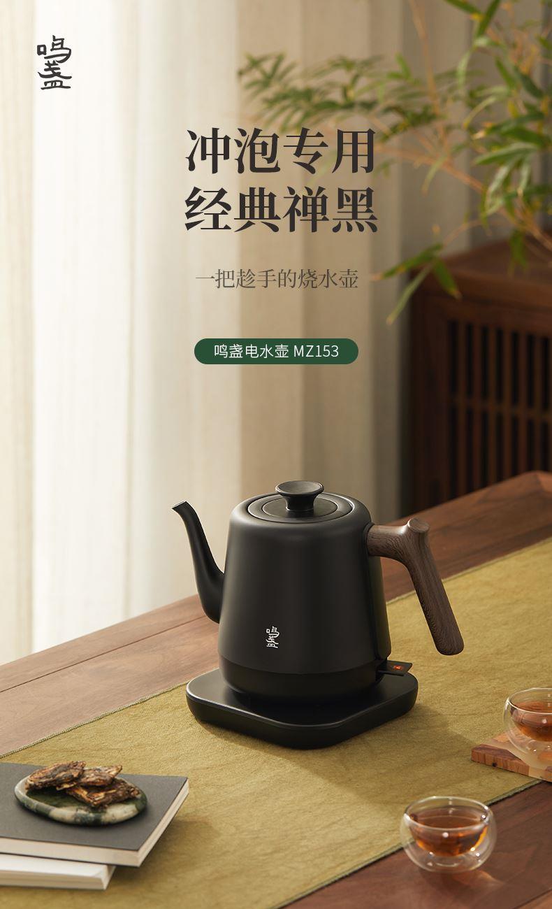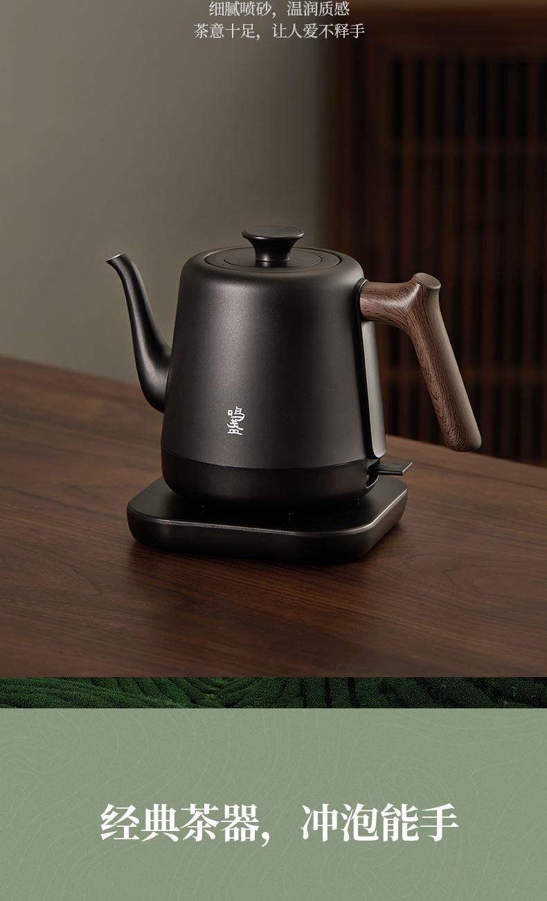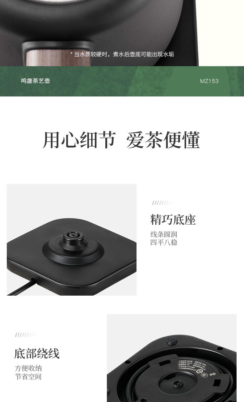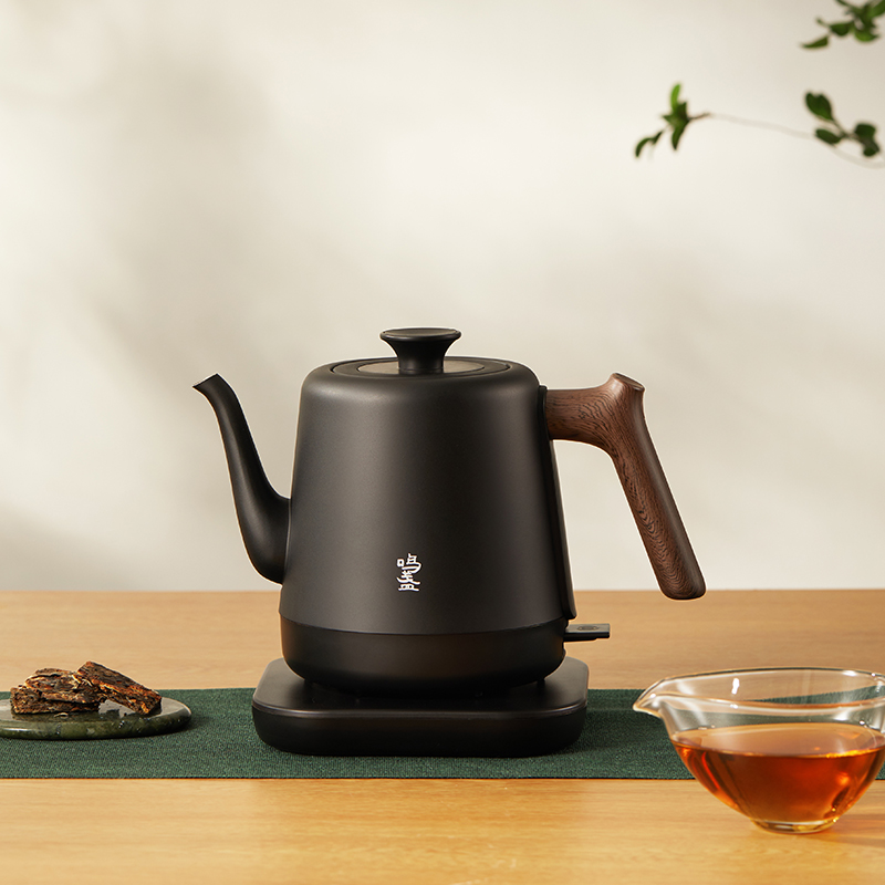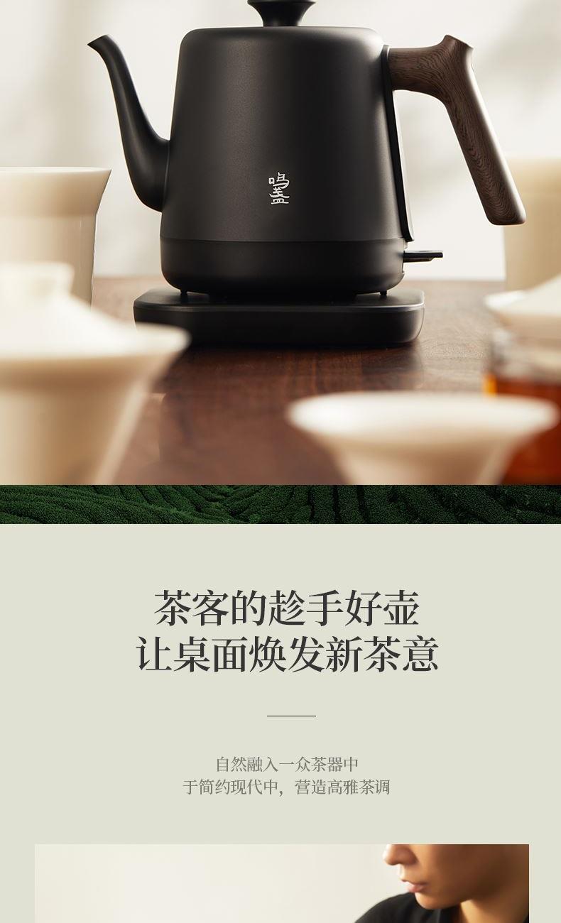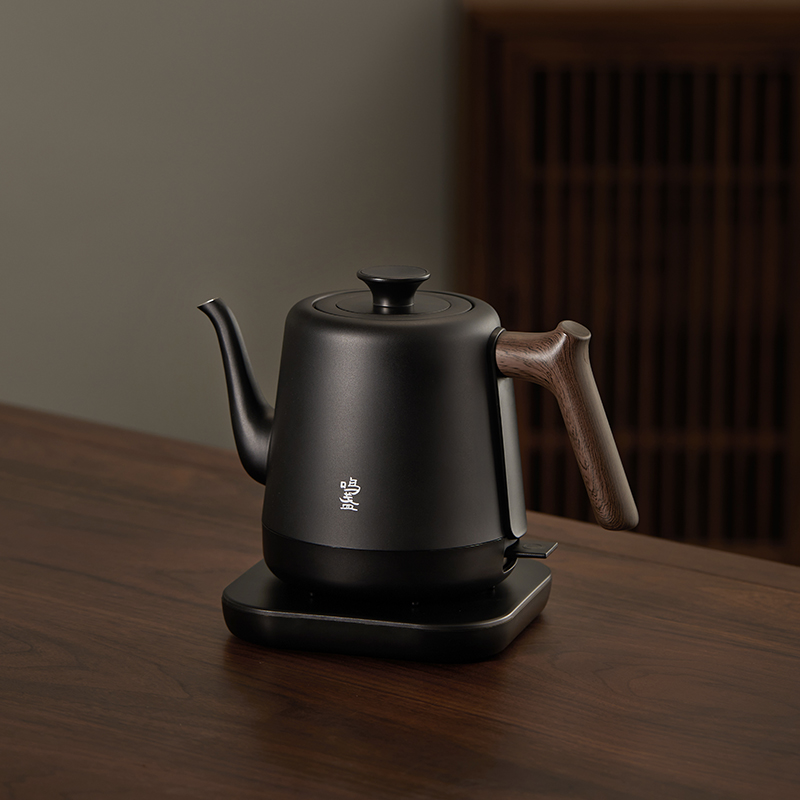 电源:220V~50Hz 额定功率:1000W 产品容量:800mL 产品颜色:禅黑 产品尺寸:产品230Lx155Wx186H / 彩盒260Lx240Wx196H / 邮购盒274Lx250Wx214H 产品重量:产品净重0.78kg / 邮盒毛重1.44kg 材质:304不锈钢、硅胶、ABS 标准配件:壶盖、壶体、底座 一把趁手的电水壶,经典禅黑的外观,专为冲泡设计。延续经典的茶艺壶造型,采用304不锈钢金属壶身,树枝型手柄采用木纹水转印工艺,放茶桌上更有质感,提升茶艺氛围。800mL的容量,搭配1000W大功率,内置英国Strix温控器,烧水速度快。简化复杂的功能,煮沸后自动跳停,是兼顾质感与性价比之选。