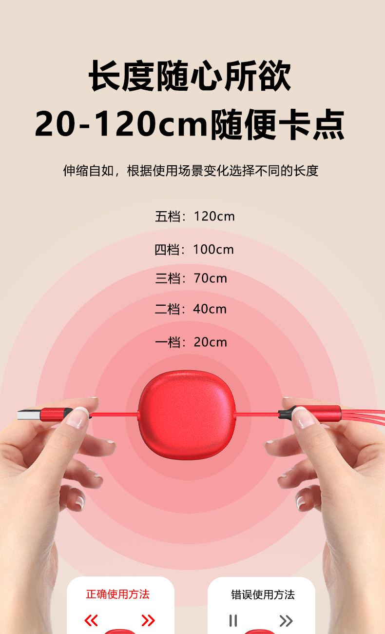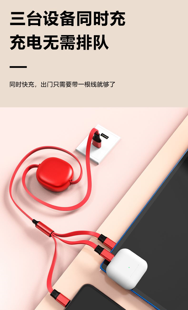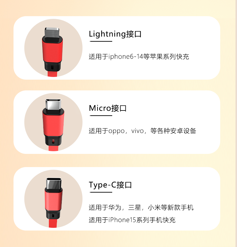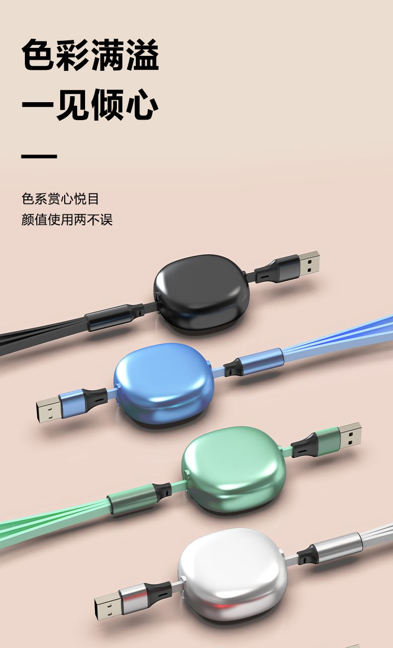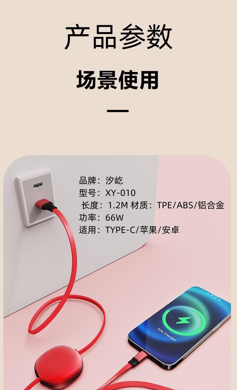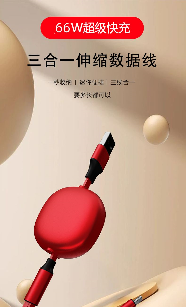 长度:1.2M 材质:TPE/ABS/铝合金 功率:66W 适用:TYPE-C/苹果/安卓 颜色:红色,蓝色,绿色,白色,黑色 产品重量:约46g 产品包装尺寸:140*90*27mm(彩盒) 产品卖点:Type-c接口支持快充, TPE环保材质,防缠绕,耐拉伸,经久耐用,加固接头,广泛兼容,适用市面绝大多数手机。