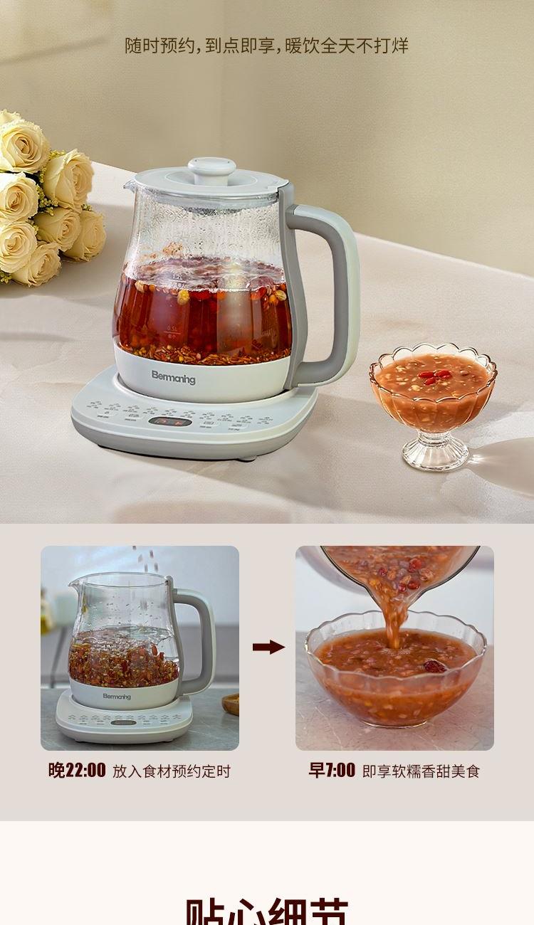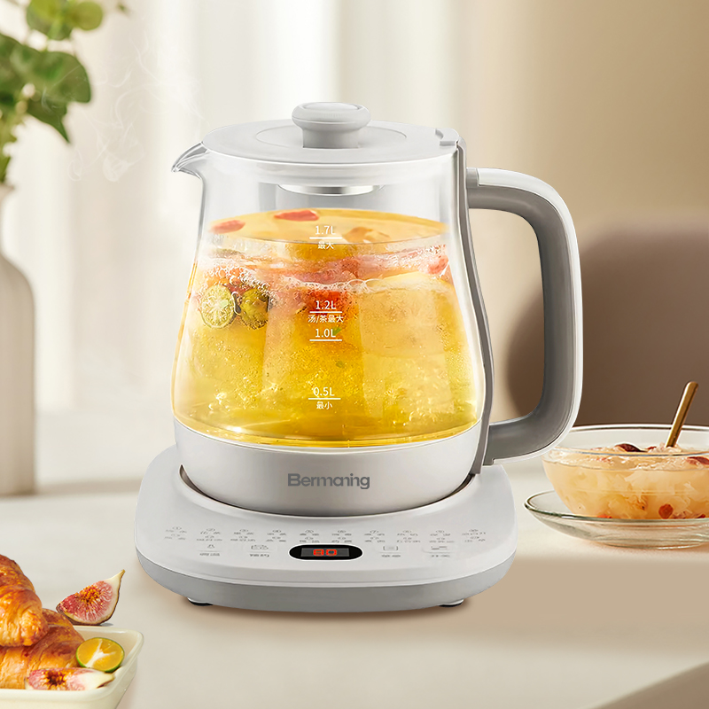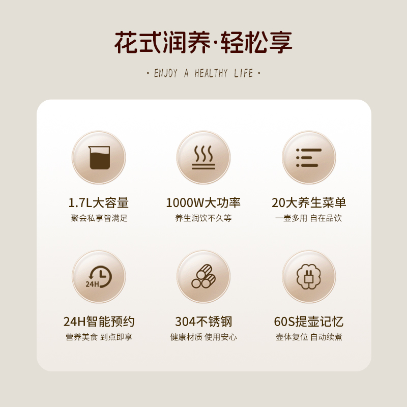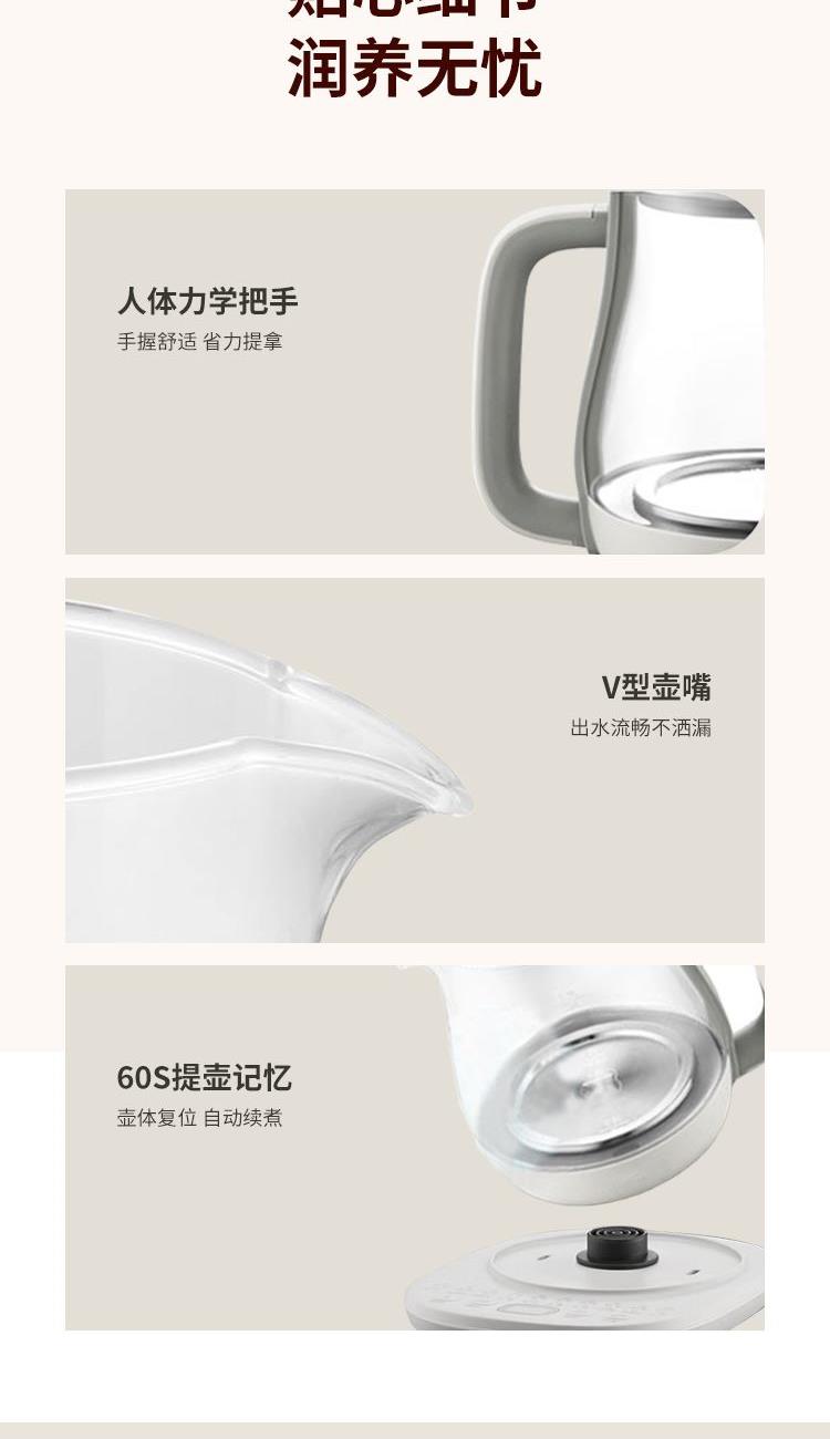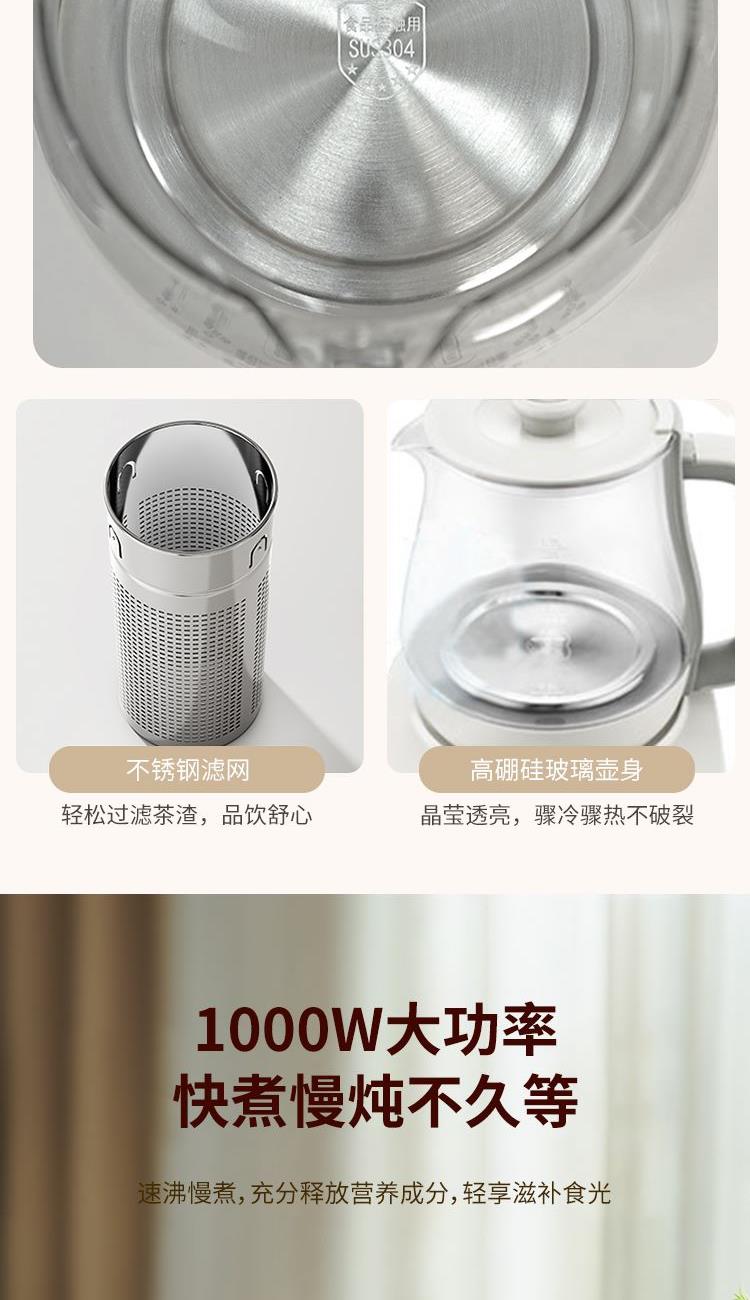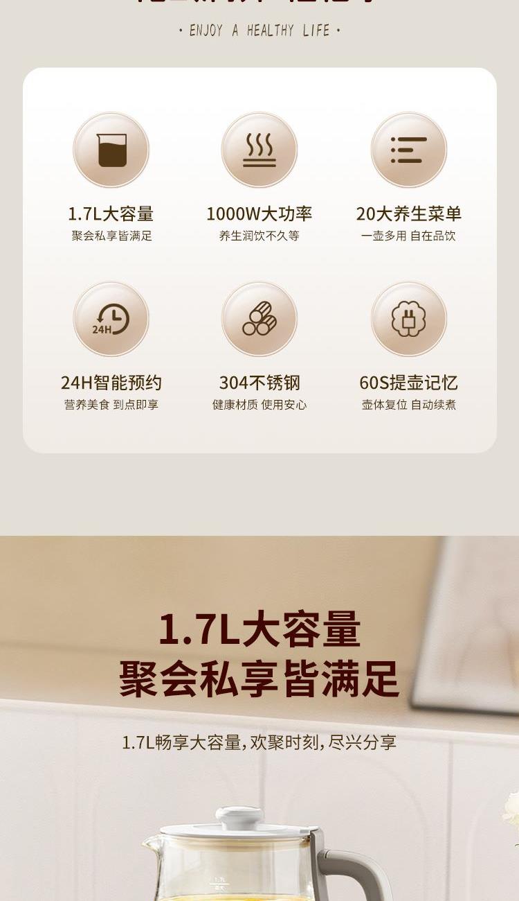 功 率:1000W 容 量:1700ML 材 质:高硼硅玻璃 净 重:1.3kg 毛 重:1.7kg 操作模式:按键版 1000W大功率 热力强劲,煮得快,美味不等待 1.7L黄金容量 容量刚刚好,养生自在,全家畅饮无压力 20大润养功能,一味一程序,道道都专业 304不锈钢发热盘,食品级材质,安心每一口 智能变频温控,火候自动适配 NTC灵敏温控 实时测温,防干烧,防糊底,防溢锅,安全加倍 24H长效预约,美味准时赴约,无需苦等。