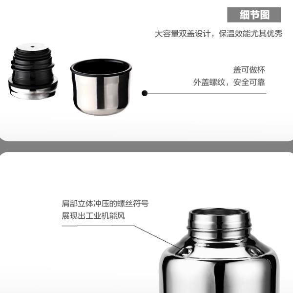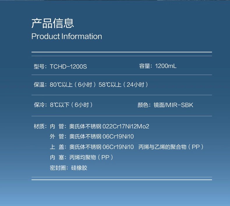 颜 色:MIR-SBK 容 量:1200ml 类 型:逐光系列 316不锈钢 定 制:可以定制 材 质:316钢 保 温:6小时约60°C 保 冷:6小时约11°C以下