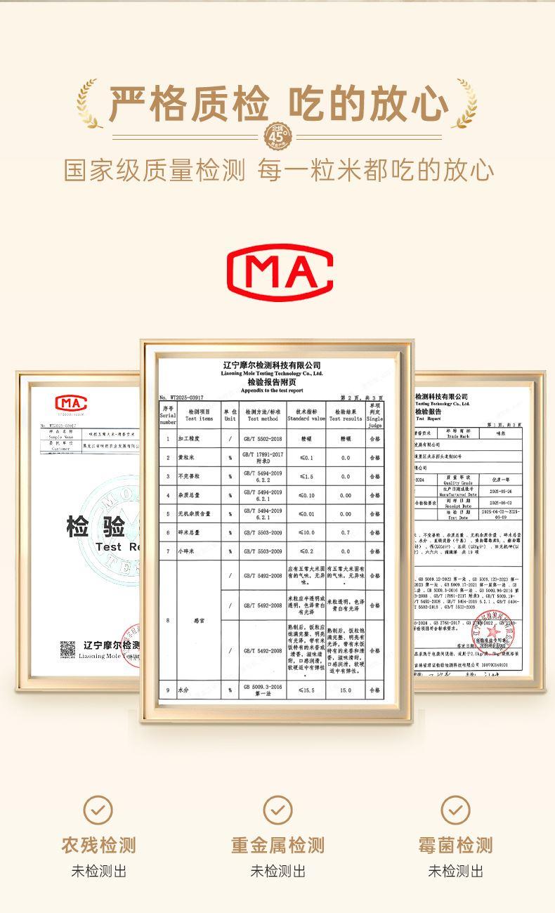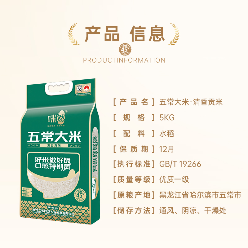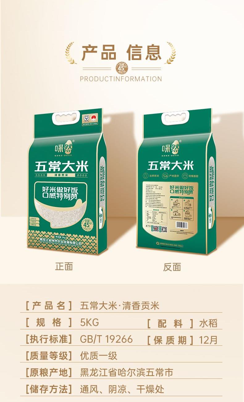 产 品 :五常大米-清香贡米5kg 执行标准 :GB/T 19266 保 质 期 :12个月 产 地 : 黑龙江省五常市 箱 规 : 4*5kg