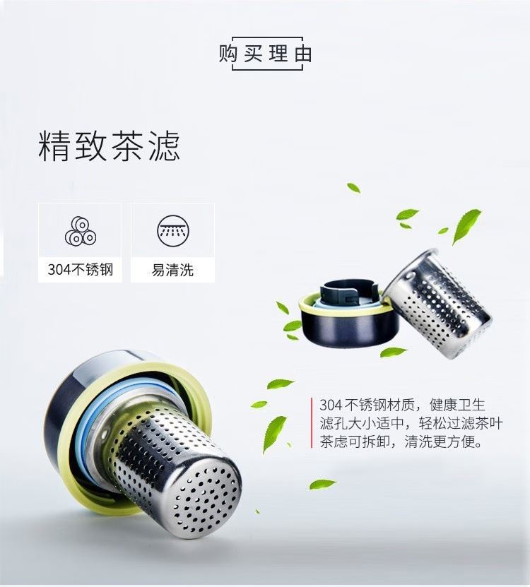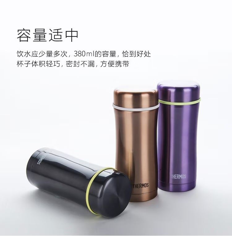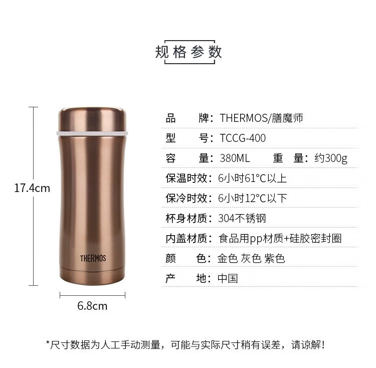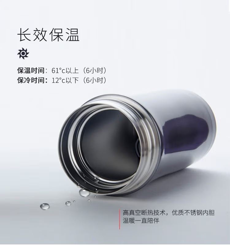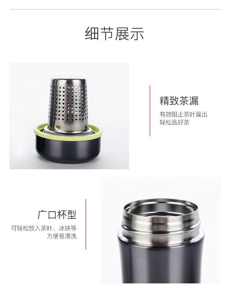 颜 色:GL金色 CGY灰色 PL紫色 BK黑色 容 量:380ml 保温效力:63C以上(6小时) 保冷效力:10C以下(6小时) 外管材质:304不锈钢 内管材质:304不锈钢 密封圈:食品级硅胶 茶漏材质:304不锈钢