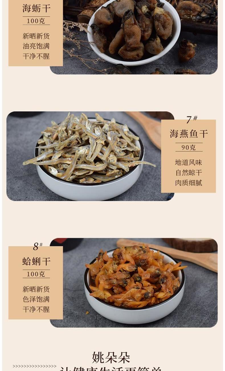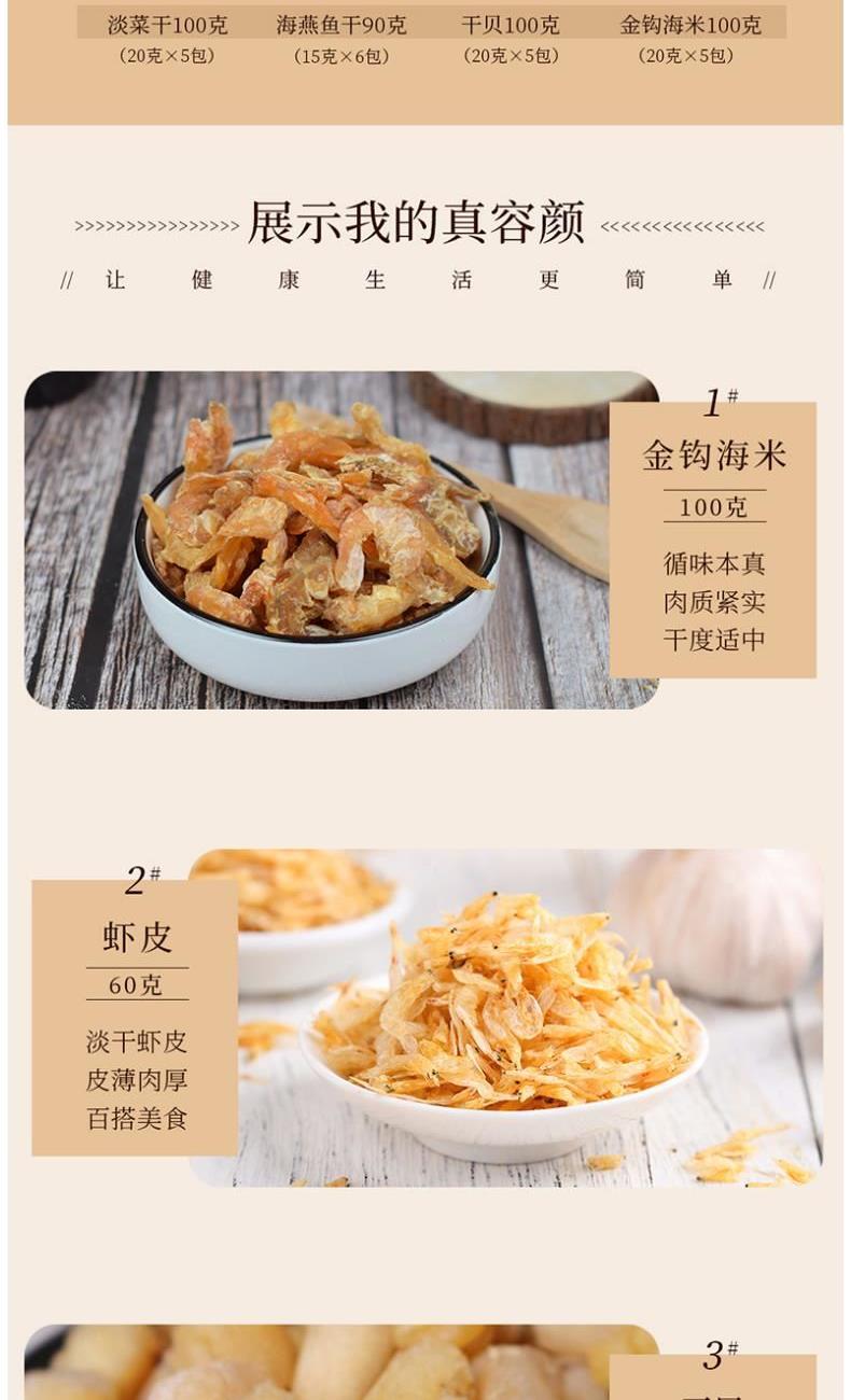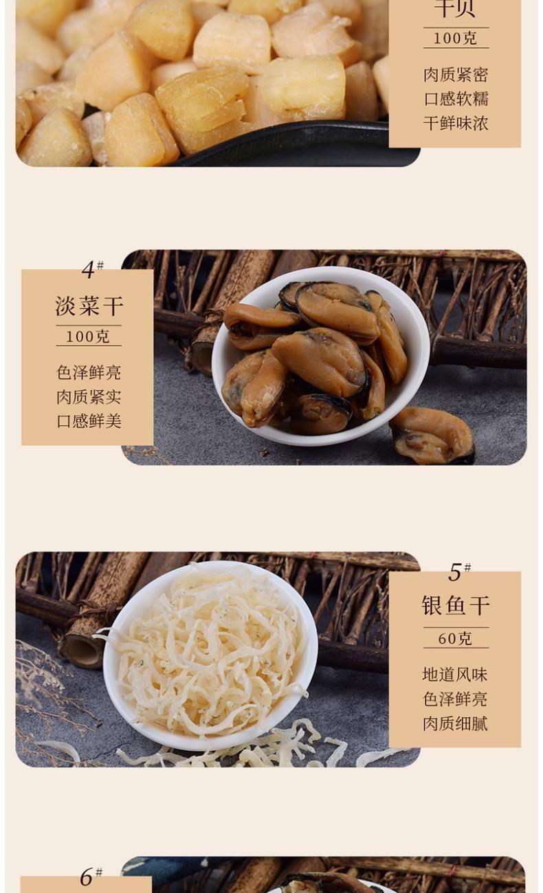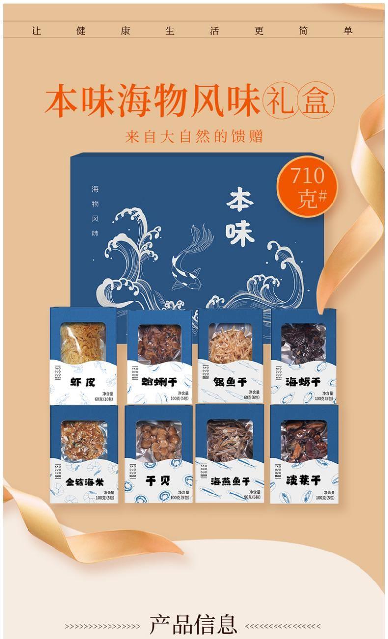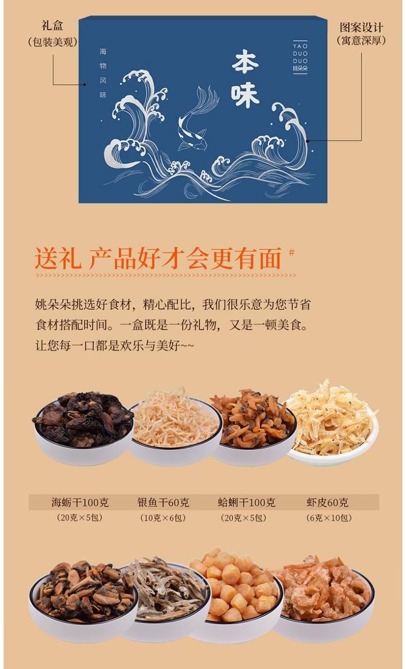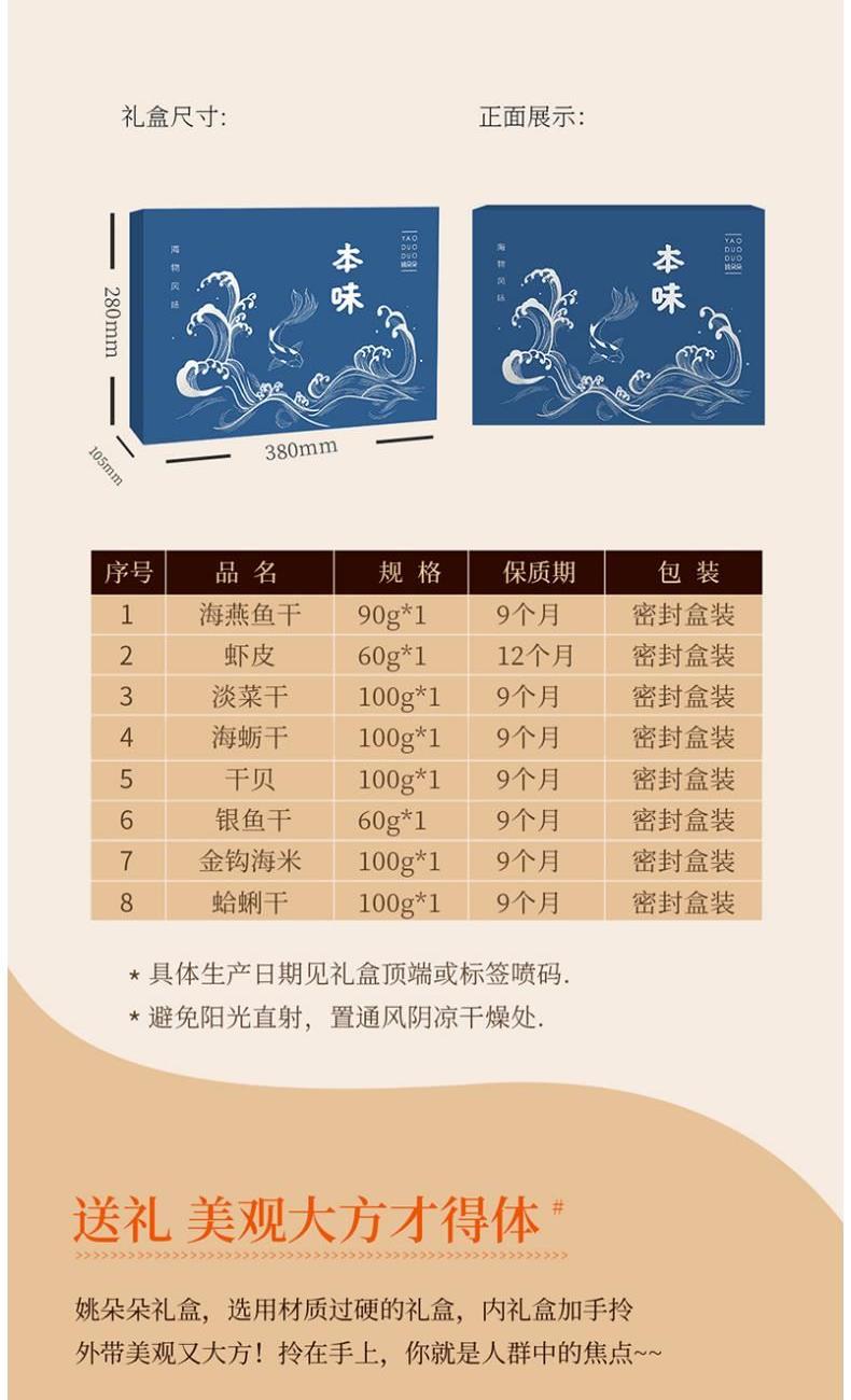 虾皮60克 蛤蜊干100克 海蛎干100克 淡菜干100克 海燕鱼干90克 干贝100克 银鱼干60克 金钩海米100克 本味海产品礼盒