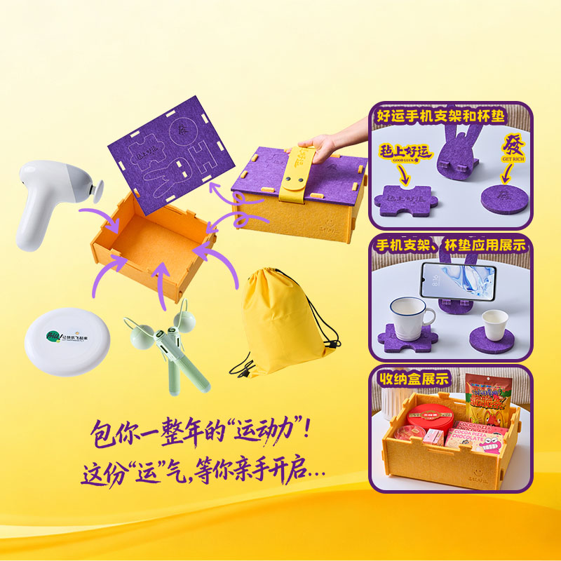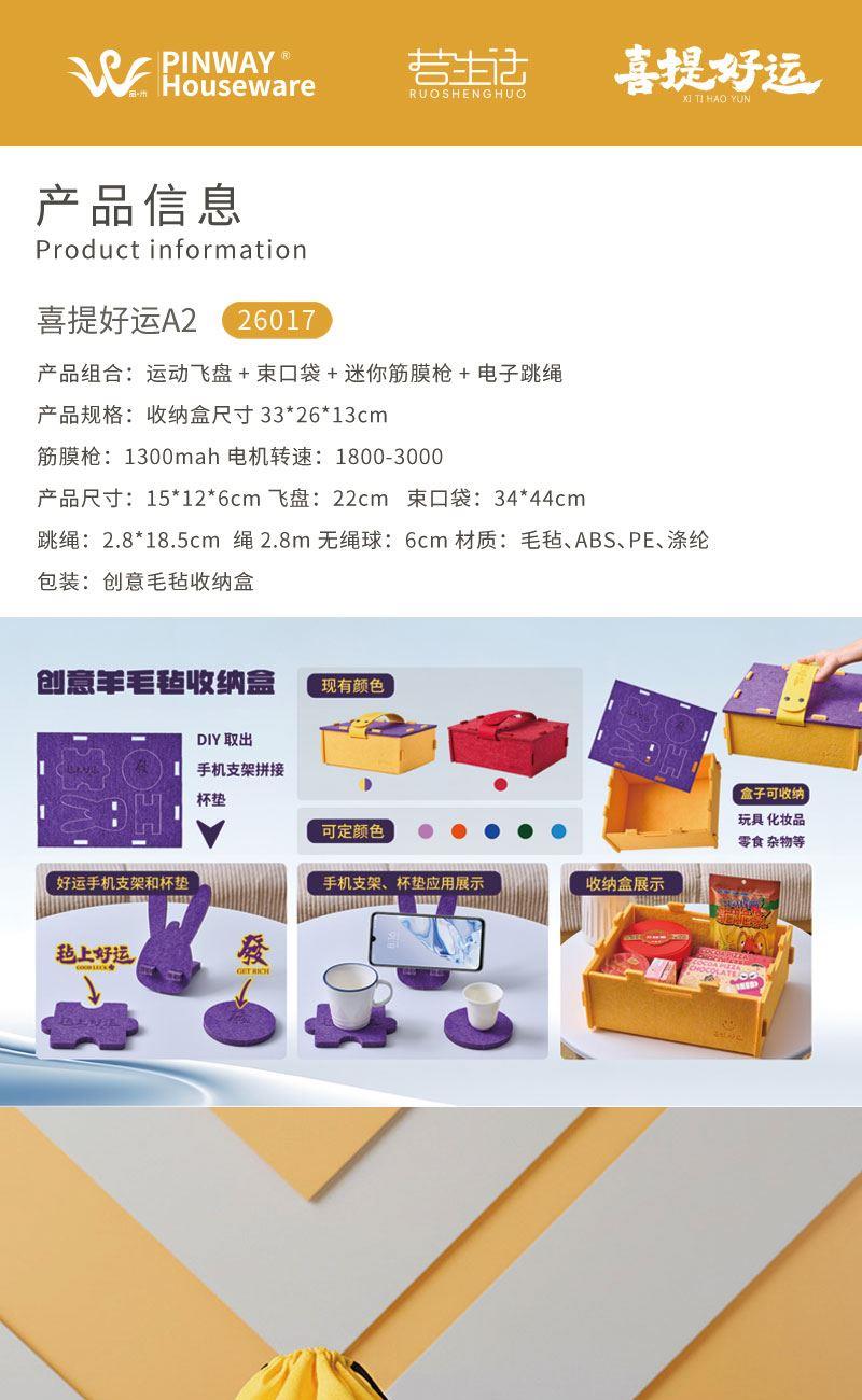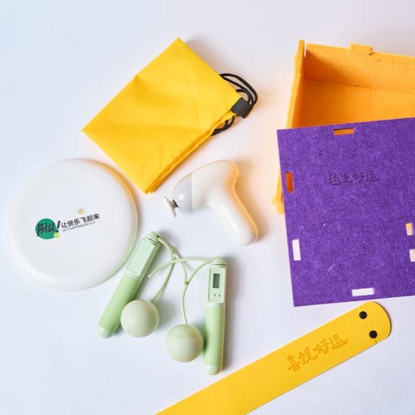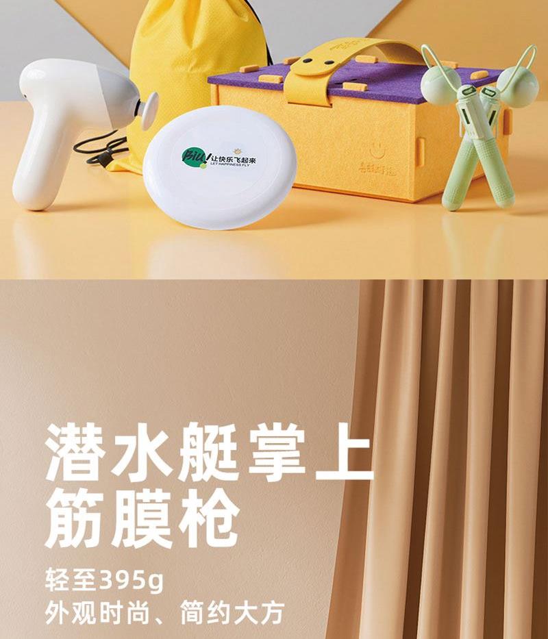 产品组合:运动飞盘+束口袋 +迷你筋膜枪+电子跳绳 产品规格:收纳盒尺寸33*26*13cm 筋膜枪:1300mah 电机转速:1800-3000 产品尺寸:15*12*6cm 飞盘:22cm 束口袋:34*44cm 跳绳:2.8*18.5cm 绳2.8m 无绳球:6cm 材质:毛毡、ABS、PE、涤纶 包装:创意毛毡收纳盒