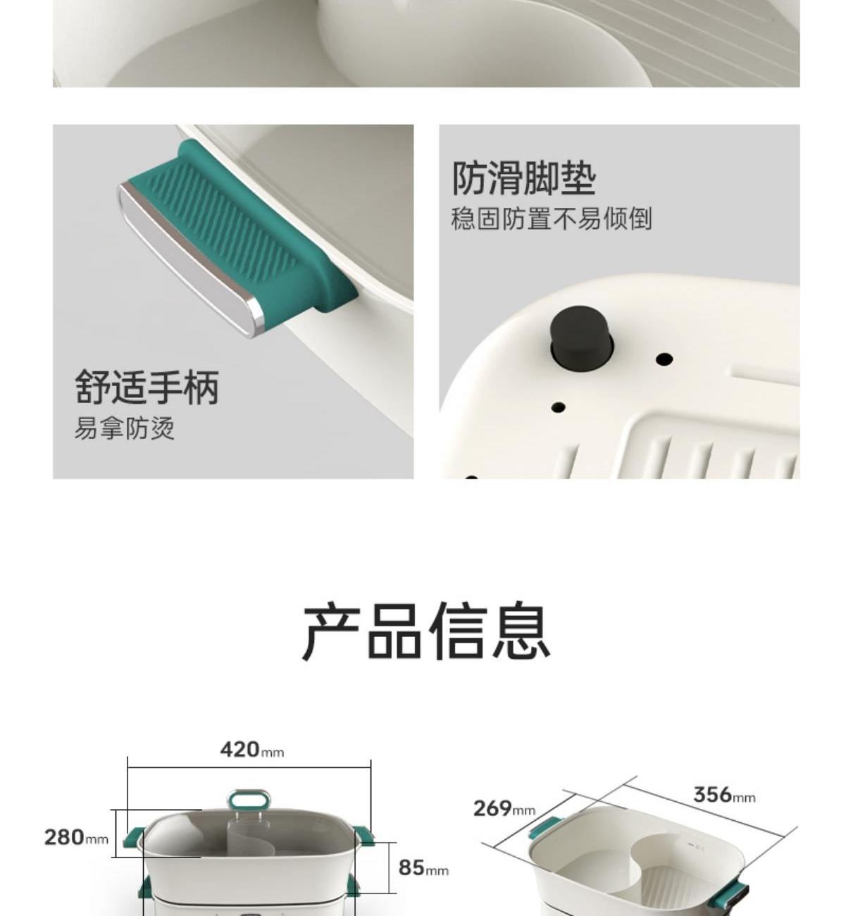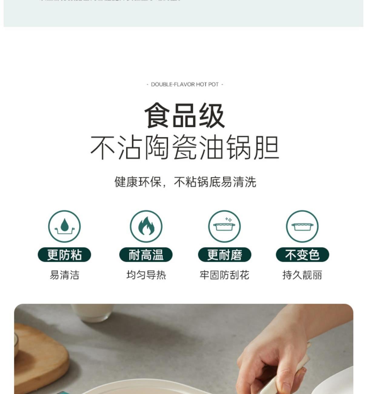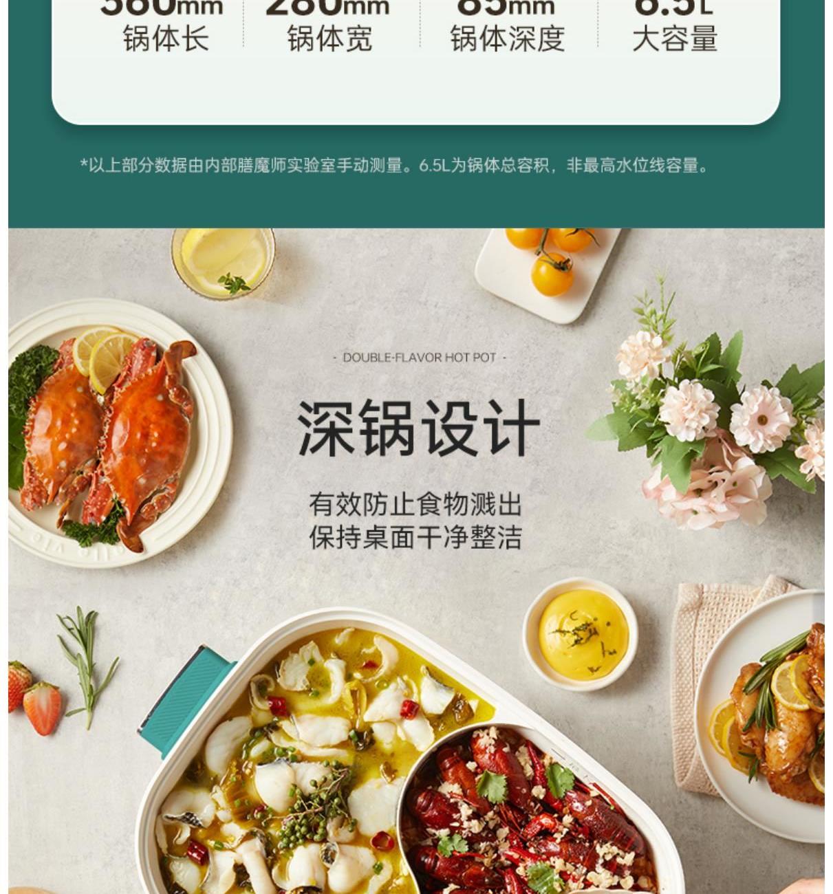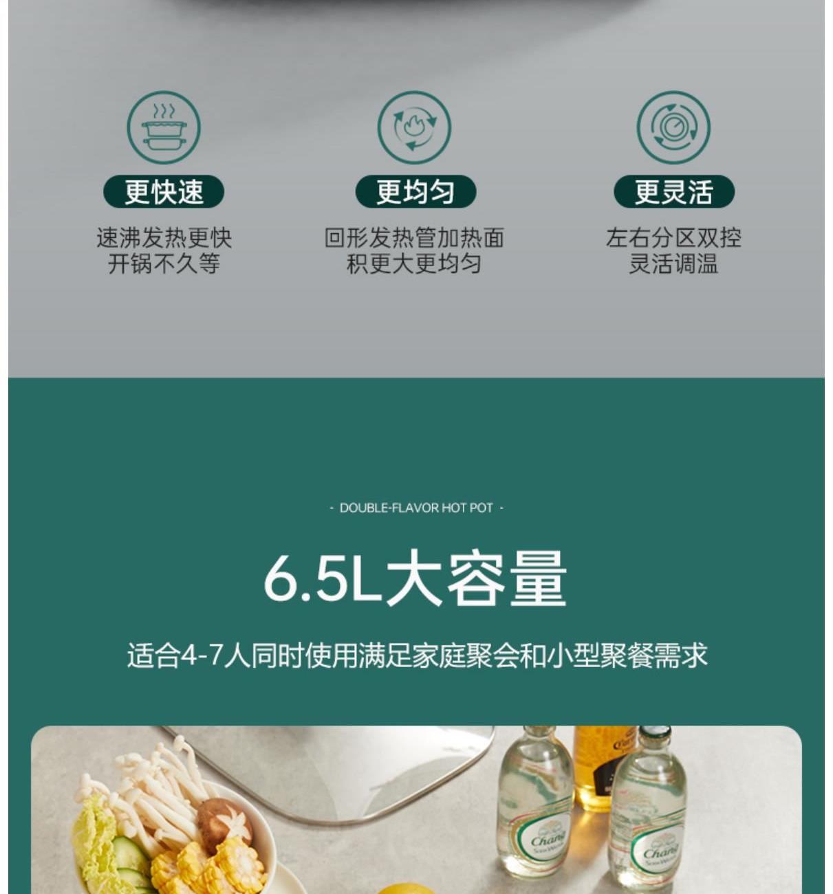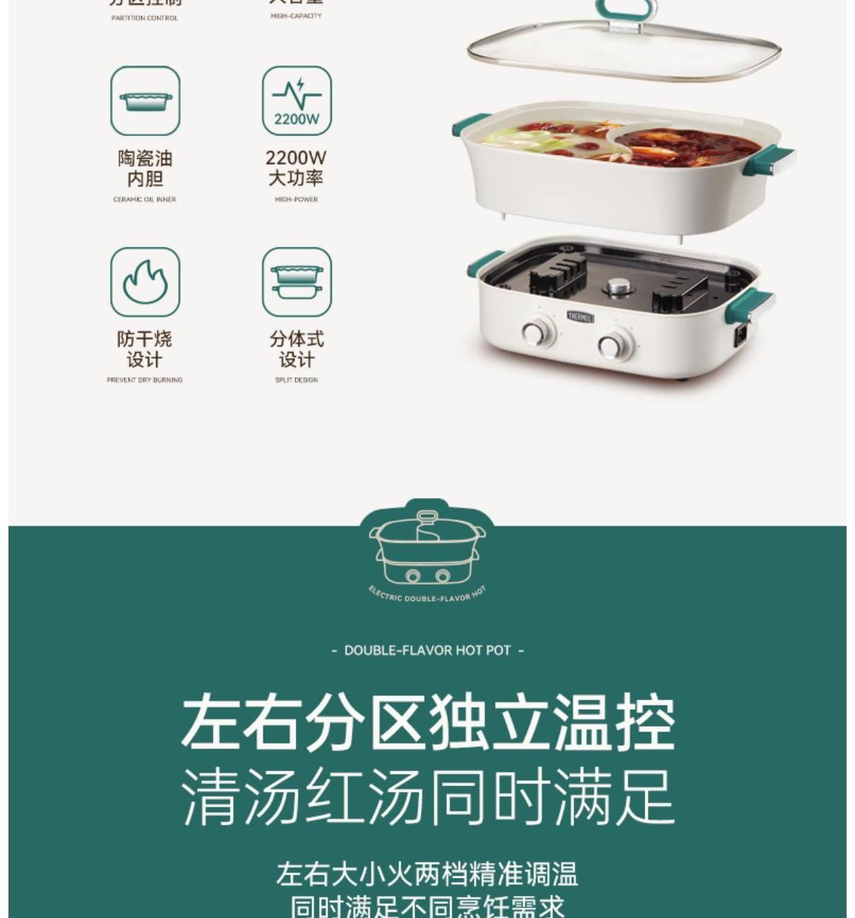 额定电源 :220V~50Hz 额定功率 : 2200W(单边1100w) 额定大容量:6.5L 净 重 :3.48kg 产品尺寸:主机:383*252*94mm 鸳鸯锅:421*276*102mm 电源线:3*1.0mm²*1m,可拆式 2200W大功率,加热快 低碳环保安全可靠 抗腐蚀性能好 锅胆采用食品级压铸铝,不易变形 食品级不粘涂层,耐磨性能好,更耐用 不粘涂层,易清洁 具备过热保护功能 多种功能,一锅百味,蒸煮煎炒焖,样样精通 旋钮调温,简单易操作,三档火力调节,烹饪更省心 6.5L大容量,满足6-8人使用,锅体深度81mm, 火锅不再飞溅 金属外壳,易清洁,久用不变色 分体可拆,灵活使用可上桌