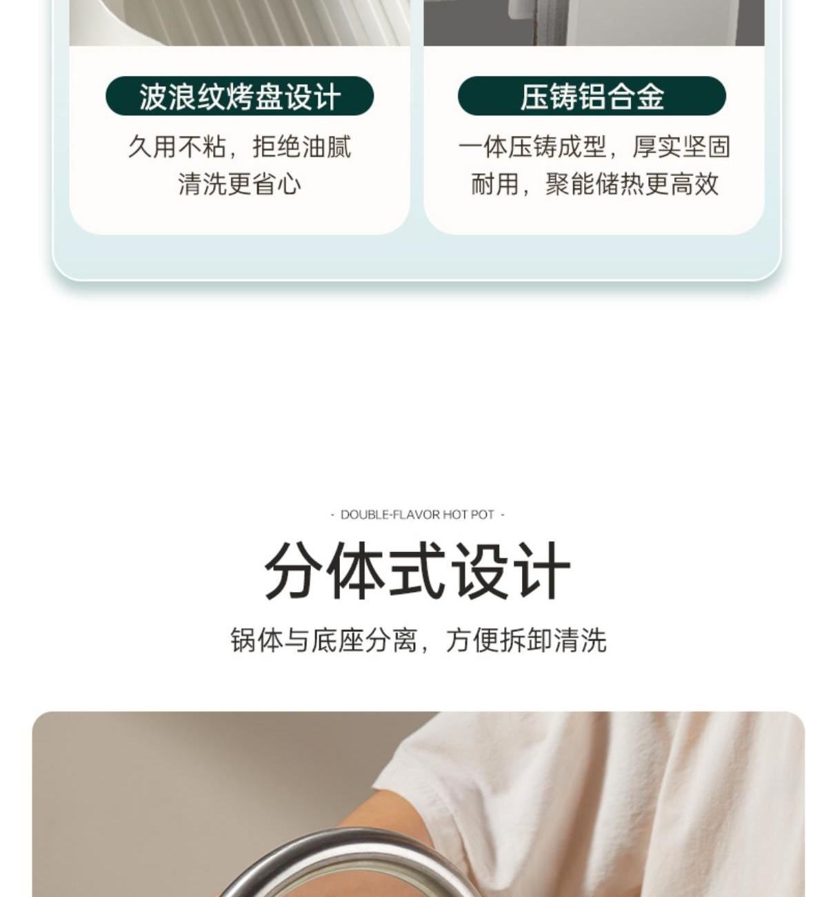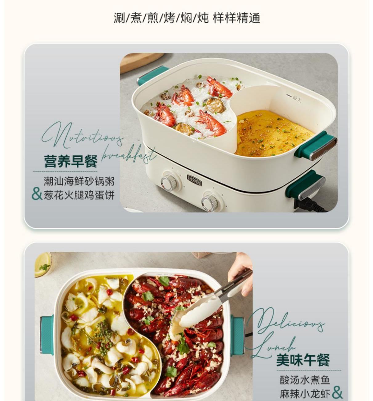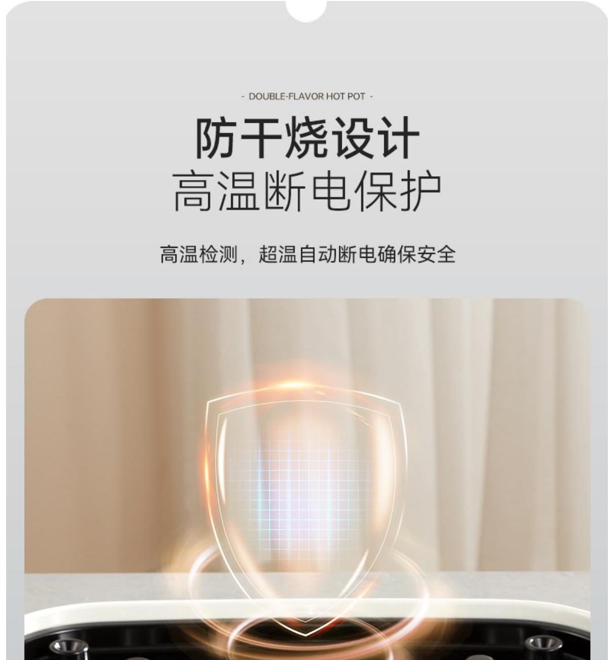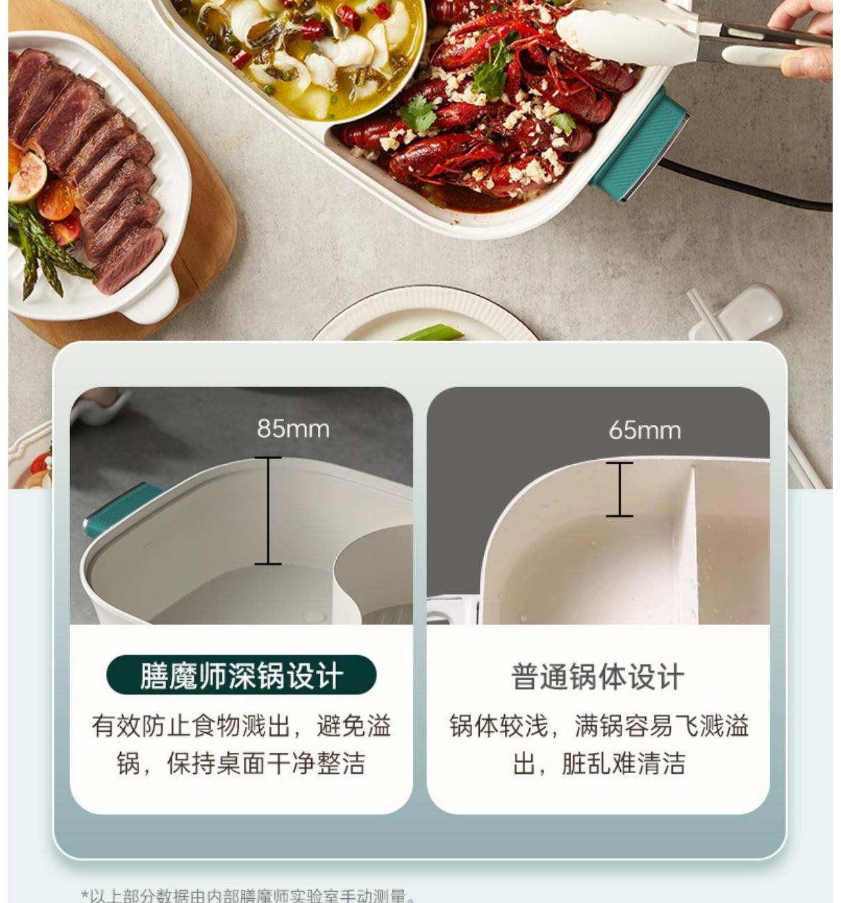 额定电源 :220V~50Hz 额定功率 : 2200W(单边1100w) 额定大容量:6.5L 净 重 :3.48kg 产品尺寸:主机:383*252*94mm 鸳鸯锅:421*276*102mm 电源线:3*1.0mm²*1m,可拆式 2200W大功率,加热快 低碳环保安全可靠 抗腐蚀性能好 锅胆采用食品级压铸铝,不易变形 食品级不粘涂层,耐磨性能好,更耐用 不粘涂层,易清洁 具备过热保护功能 多种功能,一锅百味,蒸煮煎炒焖,样样精通 旋钮调温,简单易操作,三档火力调节,烹饪更省心 6.5L大容量,满足6-8人使用,锅体深度81mm, 火锅不再飞溅 金属外壳,易清洁,久用不变色 分体可拆,灵活使用可上桌