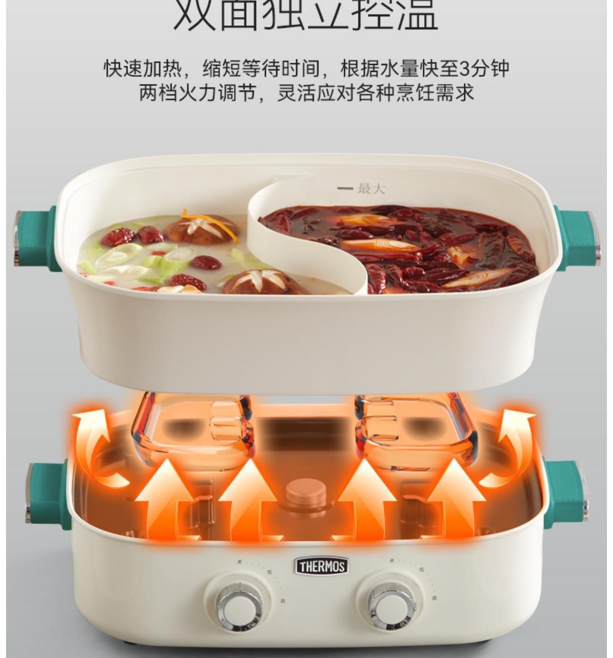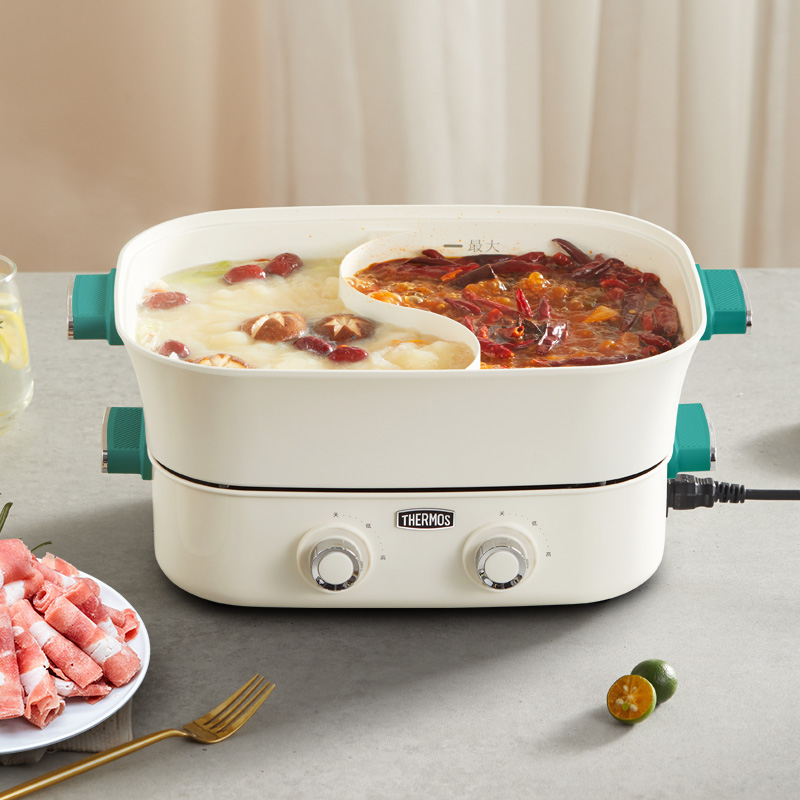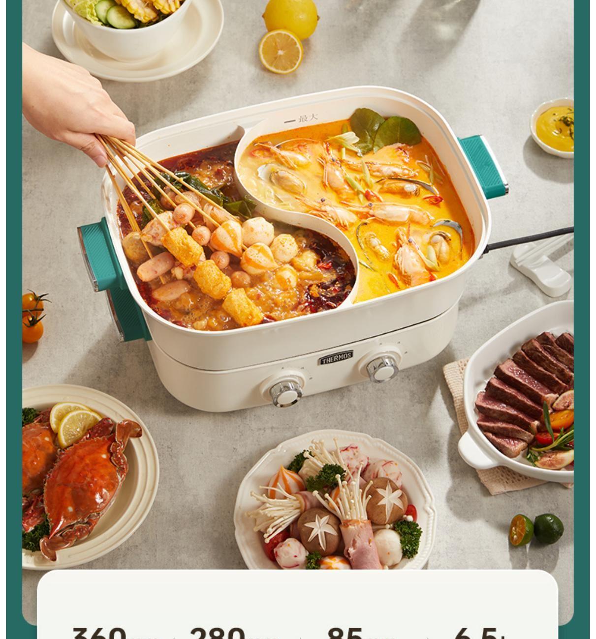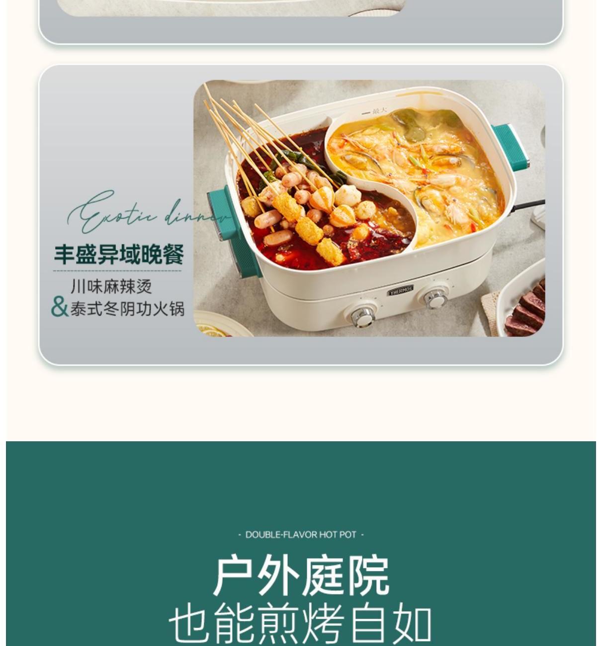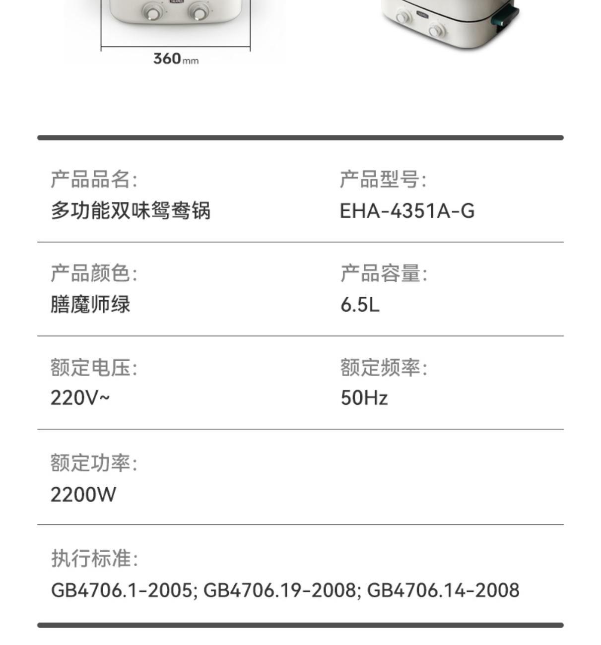 额定电源 :220V~50Hz 额定功率 : 2200W(单边1100w) 额定大容量:6.5L 净 重 :3.48kg 产品尺寸:主机:383*252*94mm 鸳鸯锅:421*276*102mm 电源线:3*1.0mm²*1m,可拆式 2200W大功率,加热快 低碳环保安全可靠 抗腐蚀性能好 锅胆采用食品级压铸铝,不易变形 食品级不粘涂层,耐磨性能好,更耐用 不粘涂层,易清洁 具备过热保护功能 多种功能,一锅百味,蒸煮煎炒焖,样样精通 旋钮调温,简单易操作,三档火力调节,烹饪更省心 6.5L大容量,满足6-8人使用,锅体深度81mm, 火锅不再飞溅 金属外壳,易清洁,久用不变色 分体可拆,灵活使用可上桌
