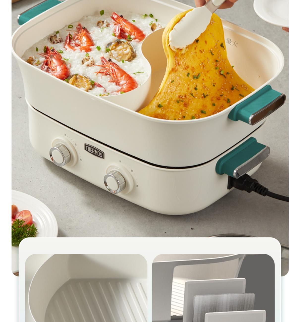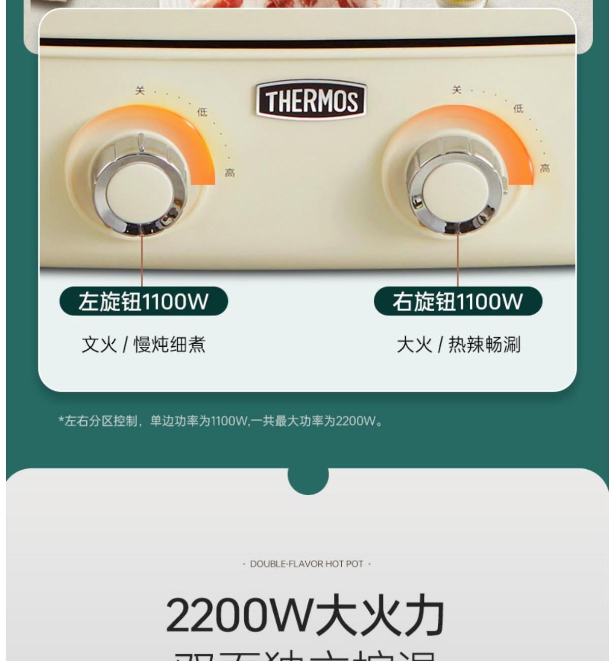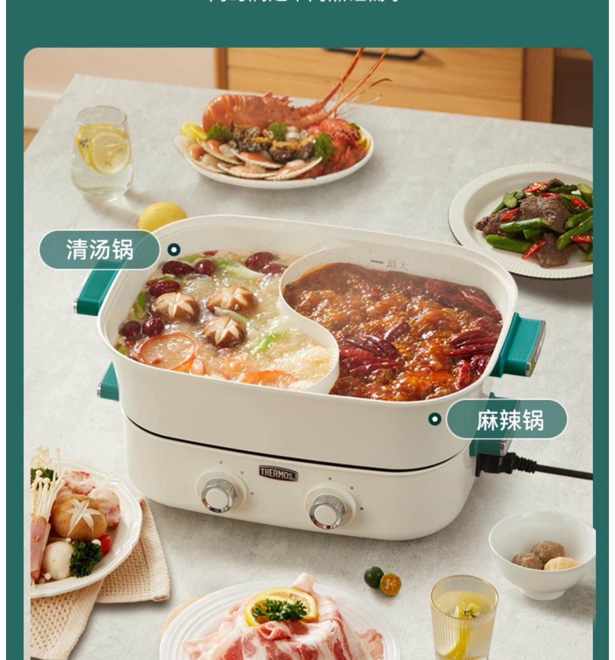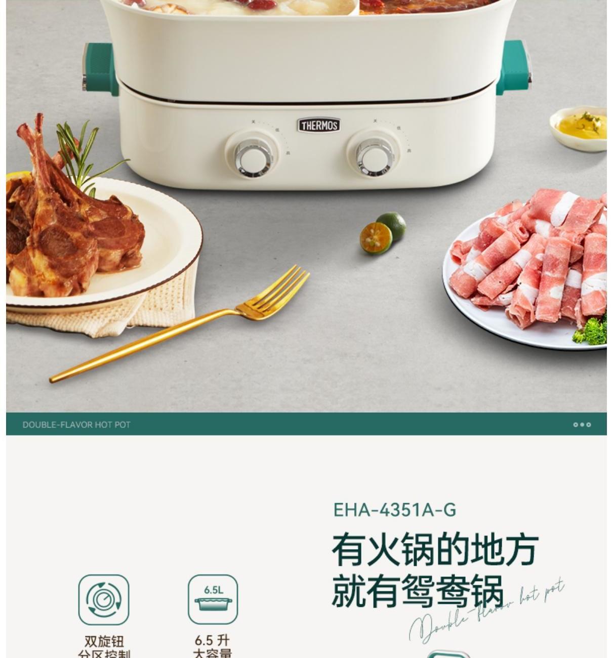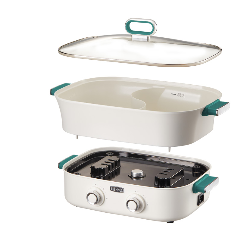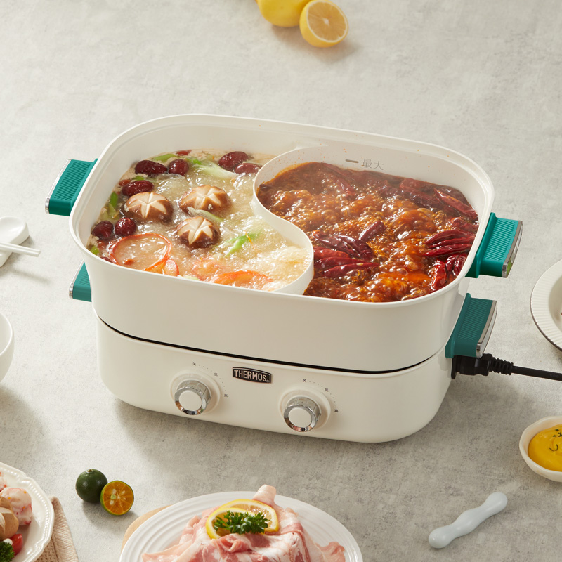 额定电源 :220V~50Hz 额定功率 : 2200W(单边1100w) 额定大容量:6.5L 净 重 :3.48kg 产品尺寸:主机:383*252*94mm 鸳鸯锅:421*276*102mm 电源线:3*1.0mm²*1m,可拆式 2200W大功率,加热快 低碳环保安全可靠 抗腐蚀性能好 锅胆采用食品级压铸铝,不易变形 食品级不粘涂层,耐磨性能好,更耐用 不粘涂层,易清洁 具备过热保护功能 多种功能,一锅百味,蒸煮煎炒焖,样样精通 旋钮调温,简单易操作,三档火力调节,烹饪更省心 6.5L大容量,满足6-8人使用,锅体深度81mm, 火锅不再飞溅 金属外壳,易清洁,久用不变色 分体可拆,灵活使用可上桌