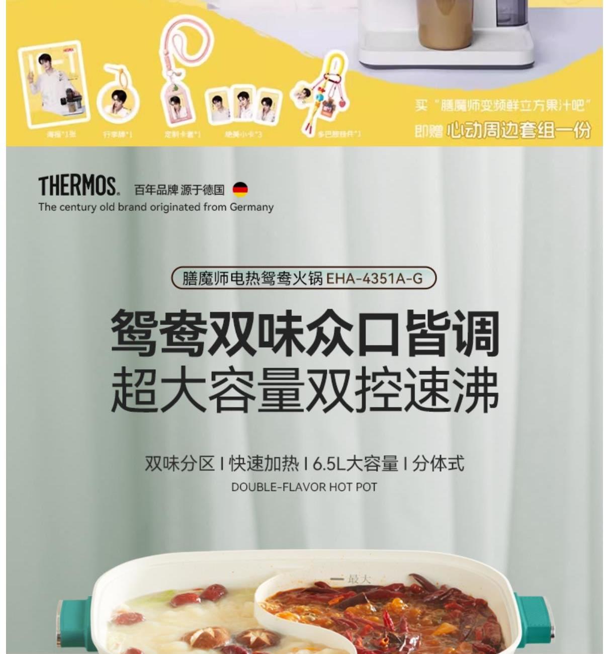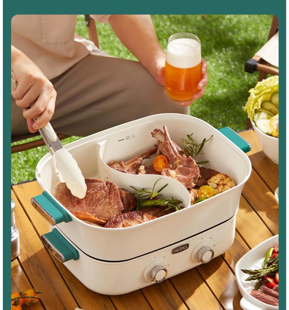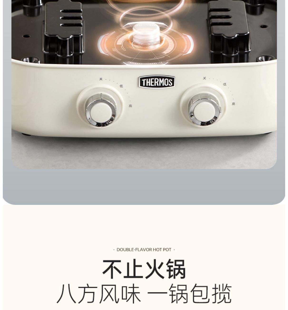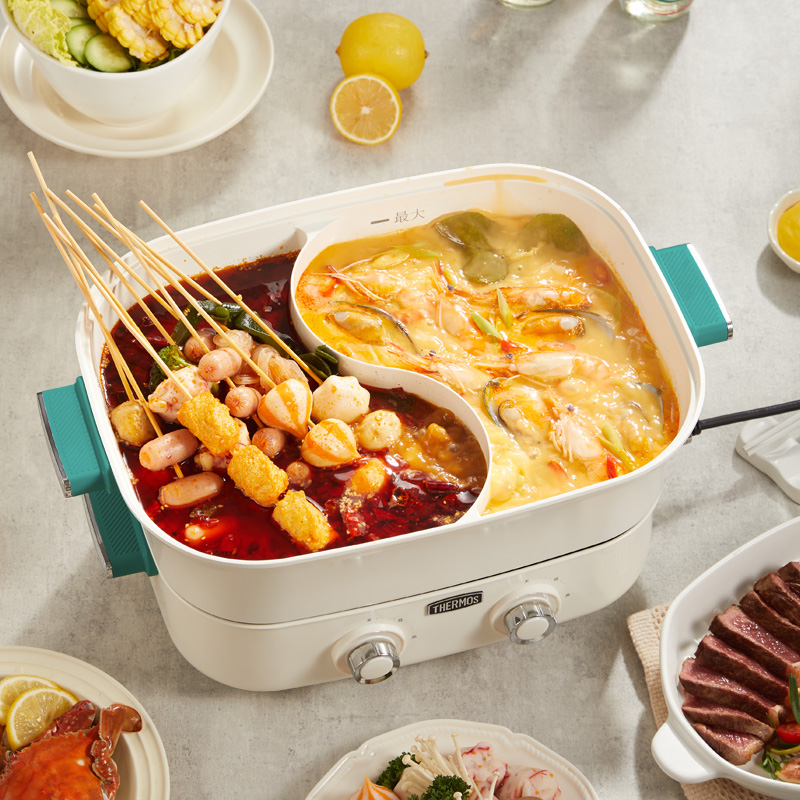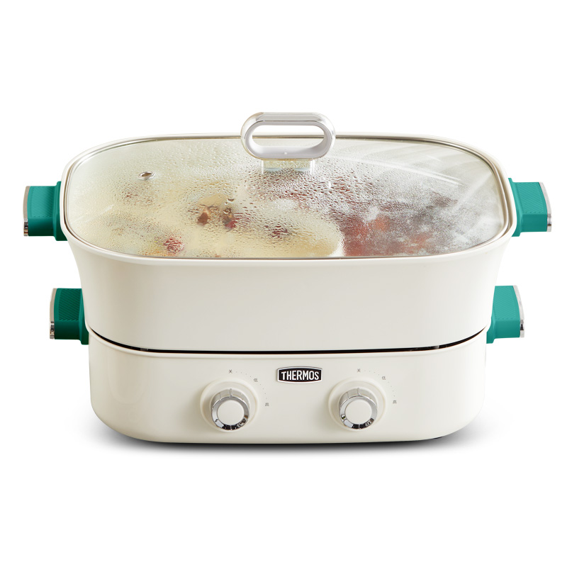 额定电源 :220V~50Hz 额定功率 : 2200W(单边1100w) 额定大容量:6.5L 净 重 :3.48kg 产品尺寸:主机:383*252*94mm 鸳鸯锅:421*276*102mm 电源线:3*1.0mm²*1m,可拆式 2200W大功率,加热快 低碳环保安全可靠 抗腐蚀性能好 锅胆采用食品级压铸铝,不易变形 食品级不粘涂层,耐磨性能好,更耐用 不粘涂层,易清洁 具备过热保护功能 多种功能,一锅百味,蒸煮煎炒焖,样样精通 旋钮调温,简单易操作,三档火力调节,烹饪更省心 6.5L大容量,满足6-8人使用,锅体深度81mm, 火锅不再飞溅 金属外壳,易清洁,久用不变色 分体可拆,灵活使用可上桌