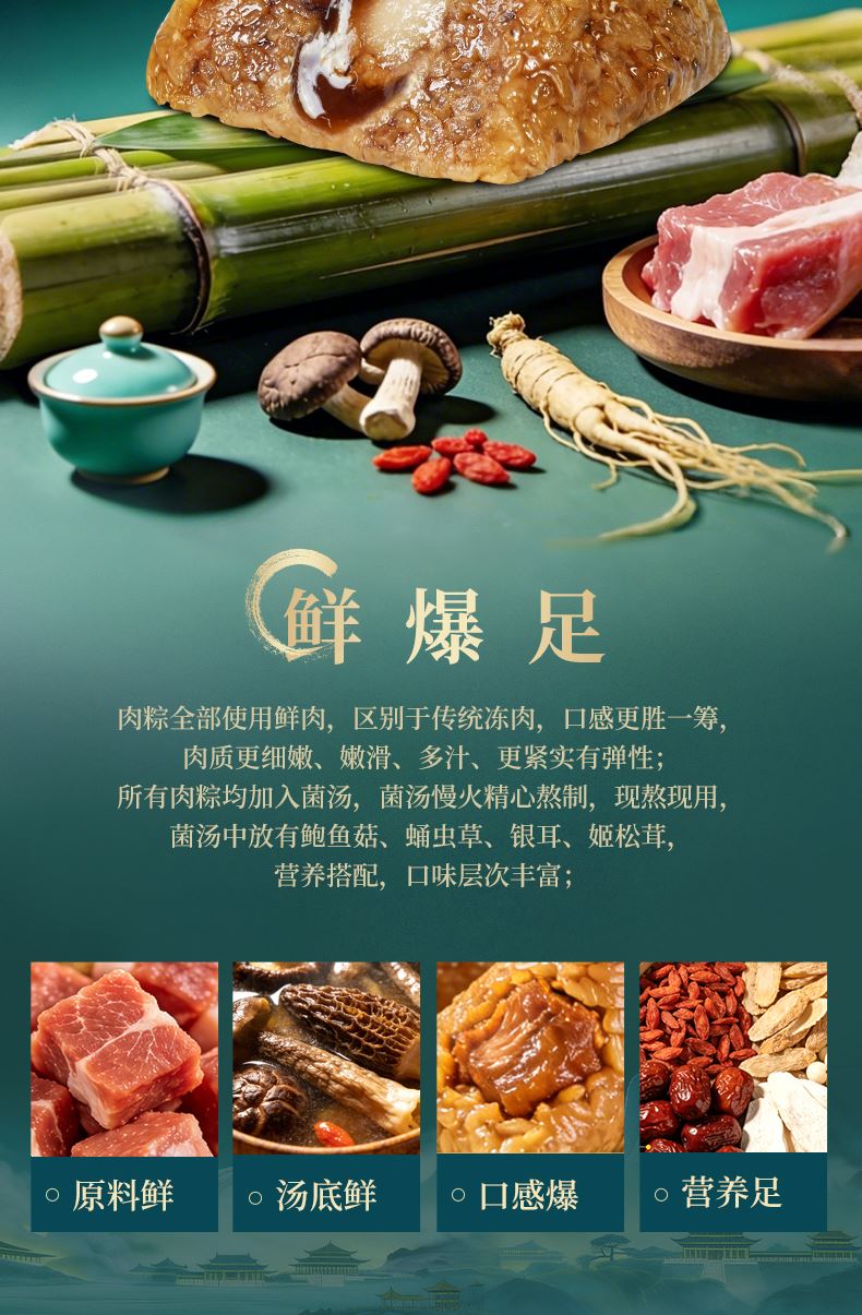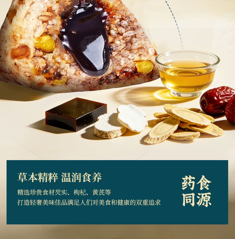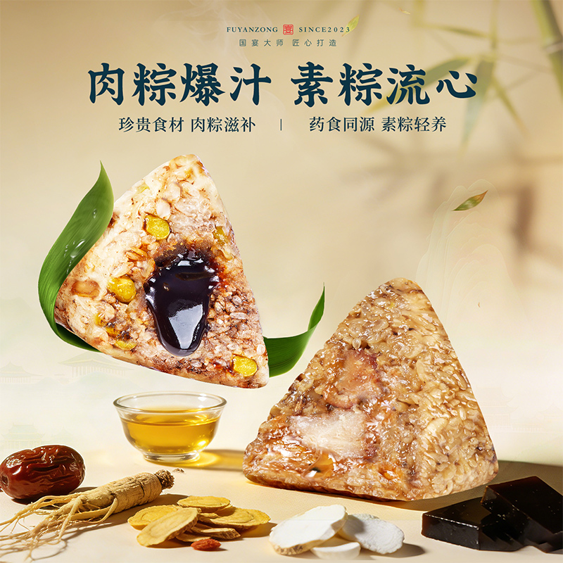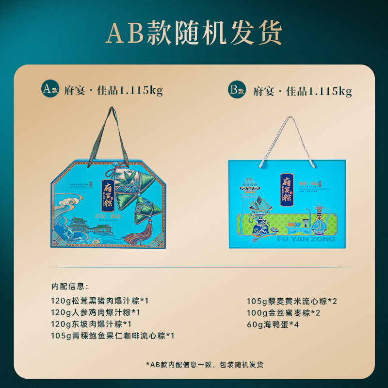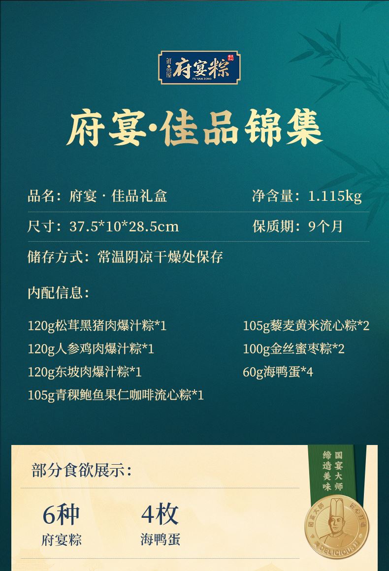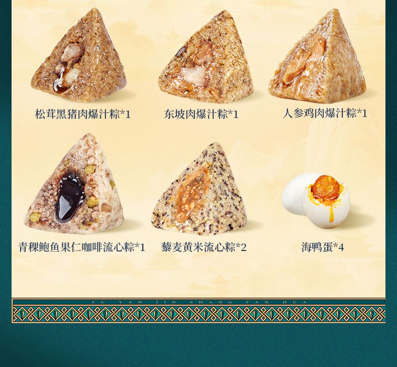 120g松茸黑猪肉爆汁粽*1 120g人参鸡肉爆汁粽*1 120g东坡肉爆汁粽*1 105g青稞鲍鱼果仁咖啡流心粽*1 105g藜麦黄米流心粽*2 100g金丝蜜枣粽*2 60g海鸭蛋*4