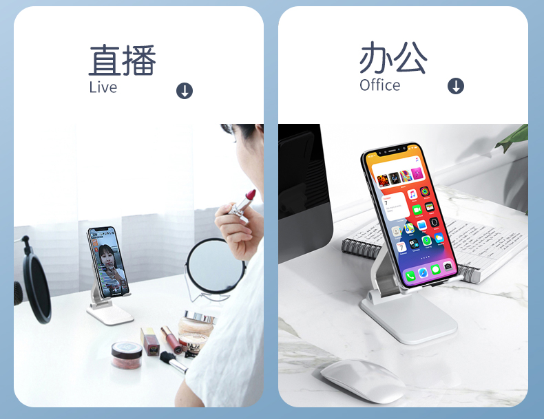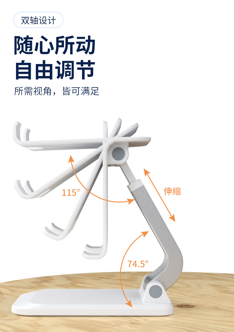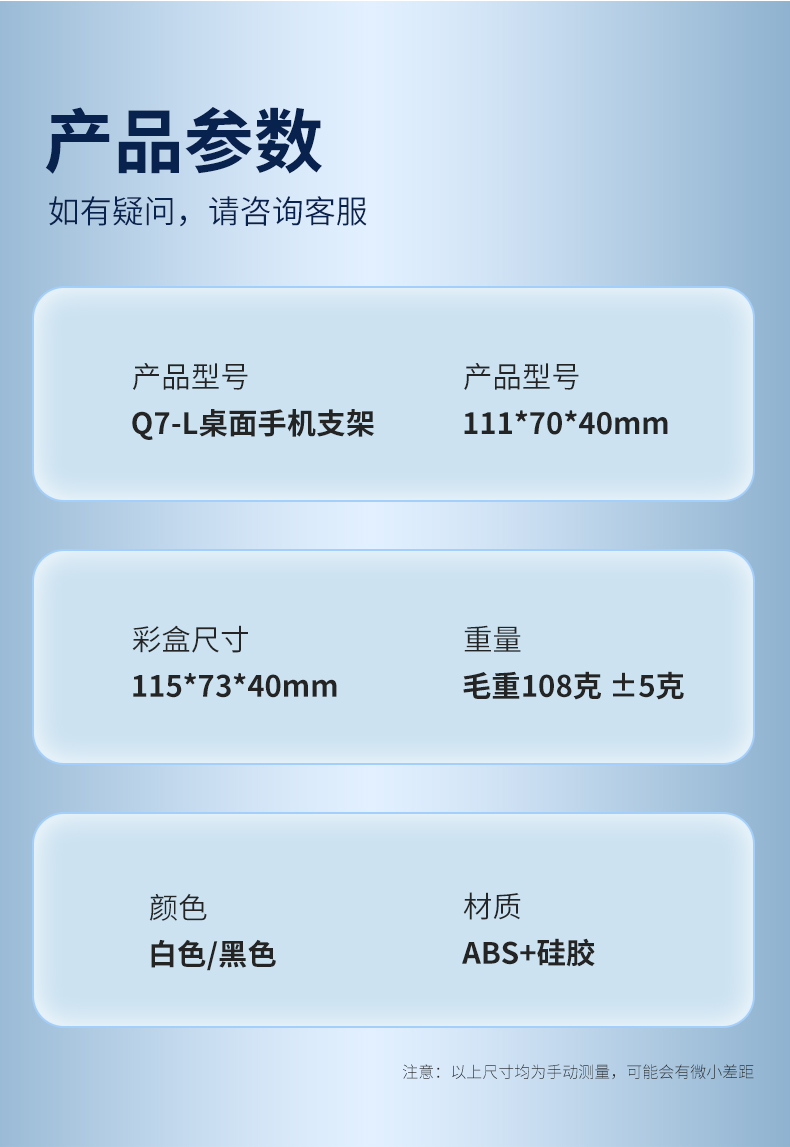 手机平板桌面支架Q7-L 型 号: Q7-L 产品尺寸 :110*70*38mm 包装尺寸 :115*74*42mm 产品净重 :113g 产品毛重 :123g 材质 :ABS+PC 颜色 :黑色,白色 【功能特点】: 升级款更稳定可折叠可伸缩 90°角度调节ABS面板防滑条纹 手机、平板均可使用预留充电位,边看边充