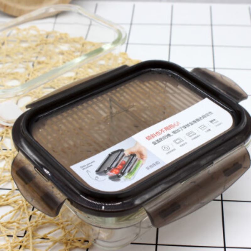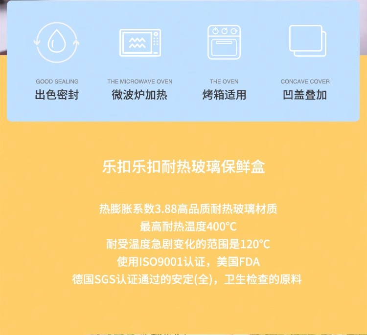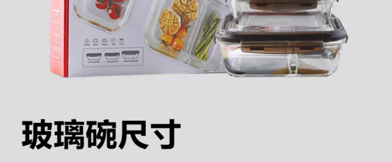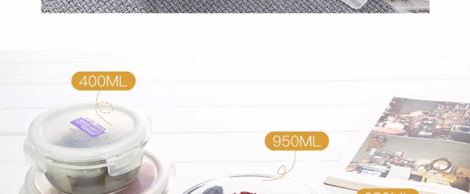产品特点: 耐热400℃高温,耐热玻璃 适用于微波炉、烤箱、冰箱、洗碗机 弯曲扣盖,经久耐用 长久保鲜,四面锁扣,密封性好,有效防止水分流失.