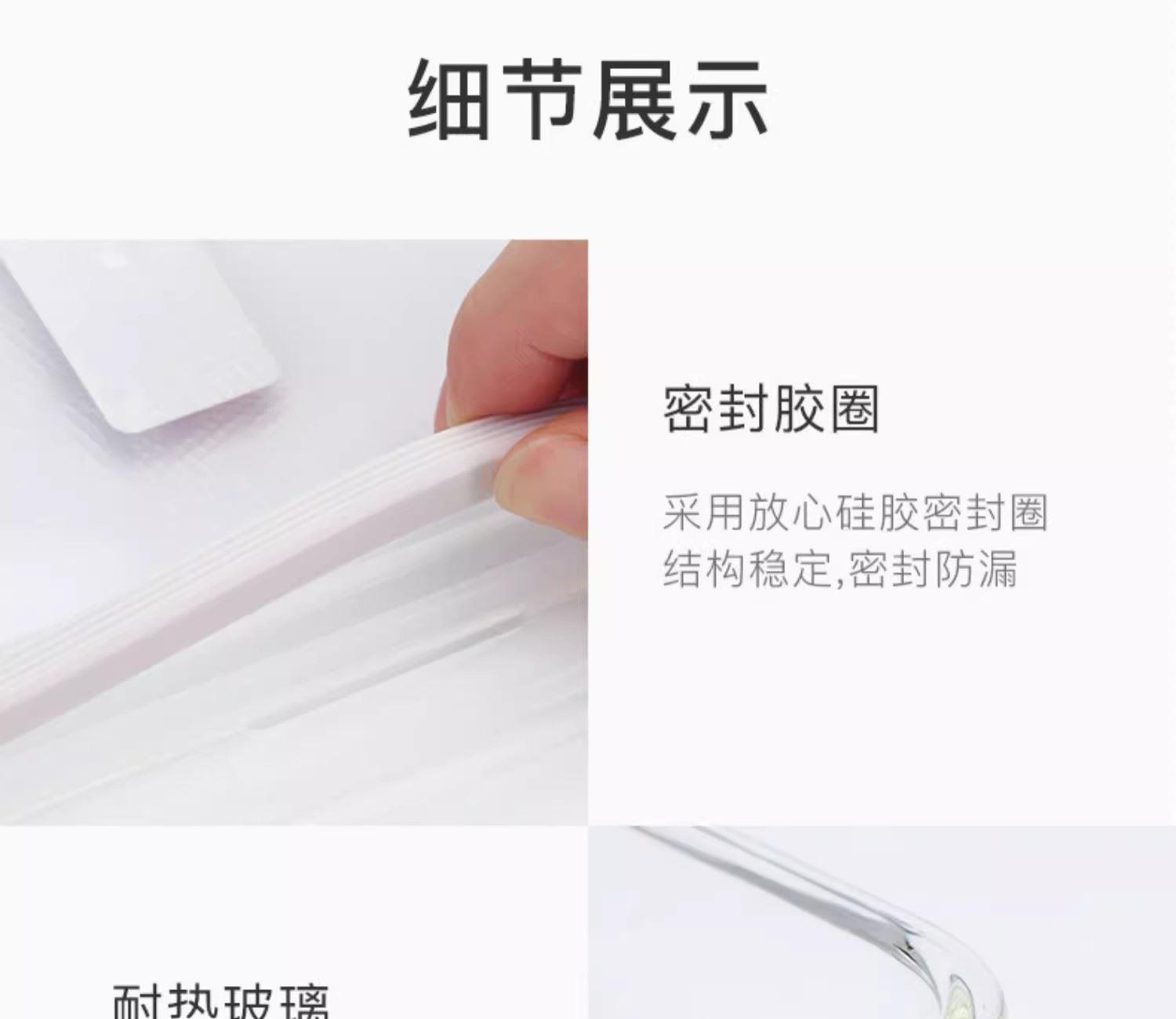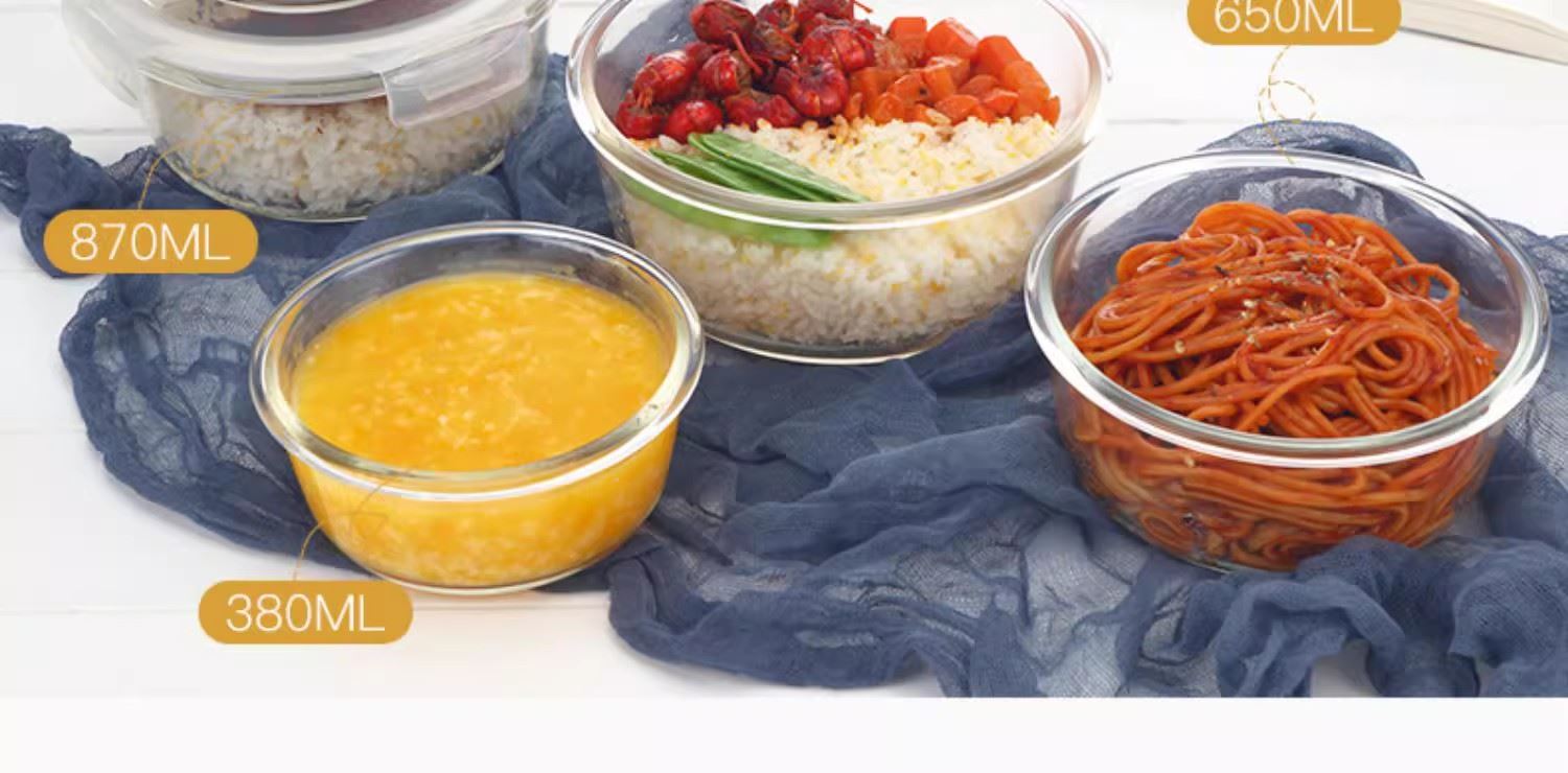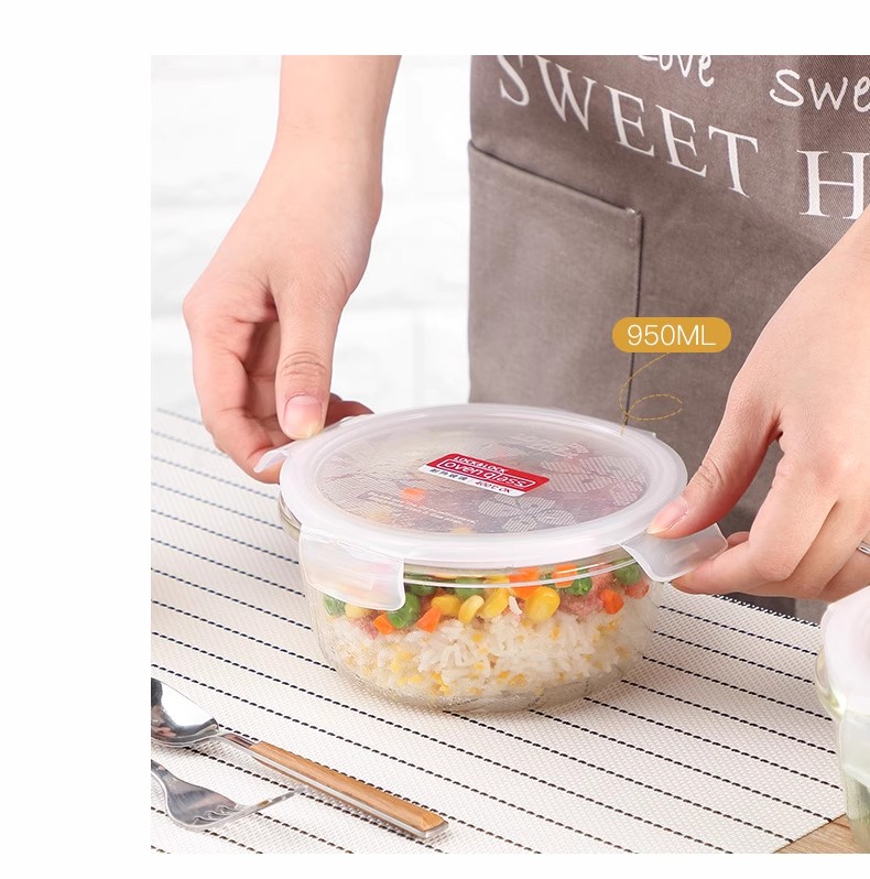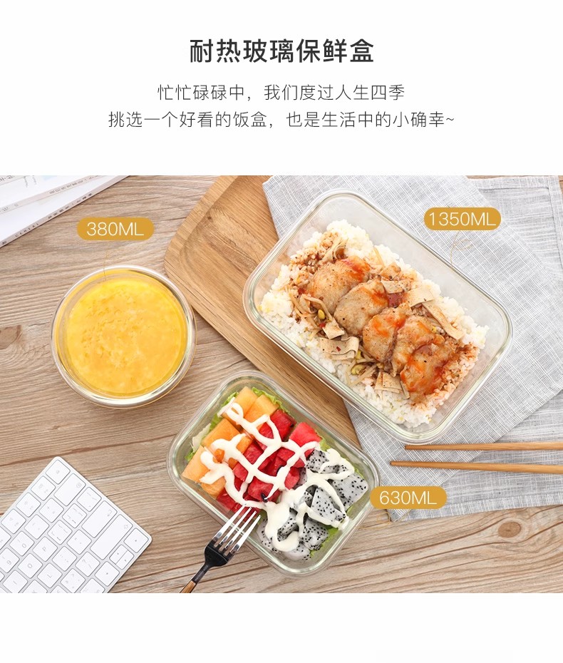 产品特点: 耐热400℃高温,耐热玻璃 适用于微波炉、烤箱、冰箱、洗碗机 弯曲扣盖,经久耐用 长久保鲜,四面锁扣,密封性好,有效防止水分流失.
